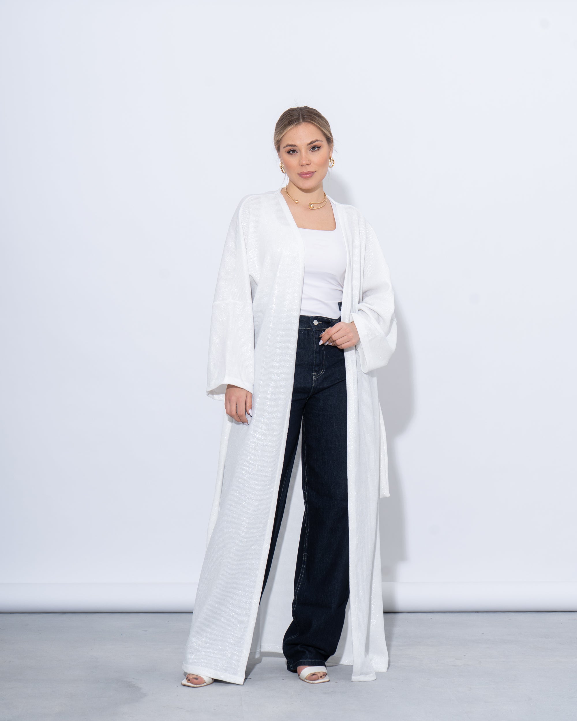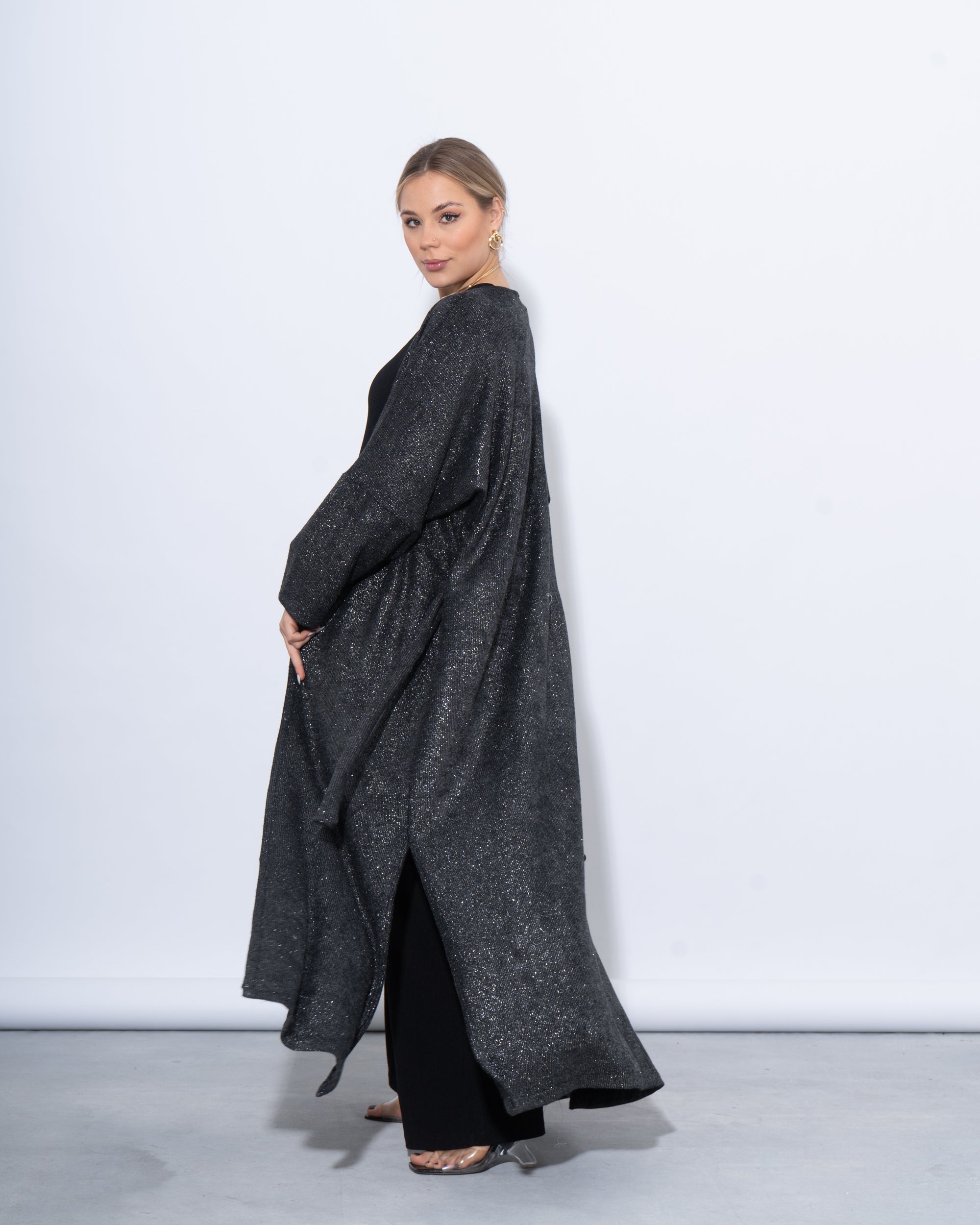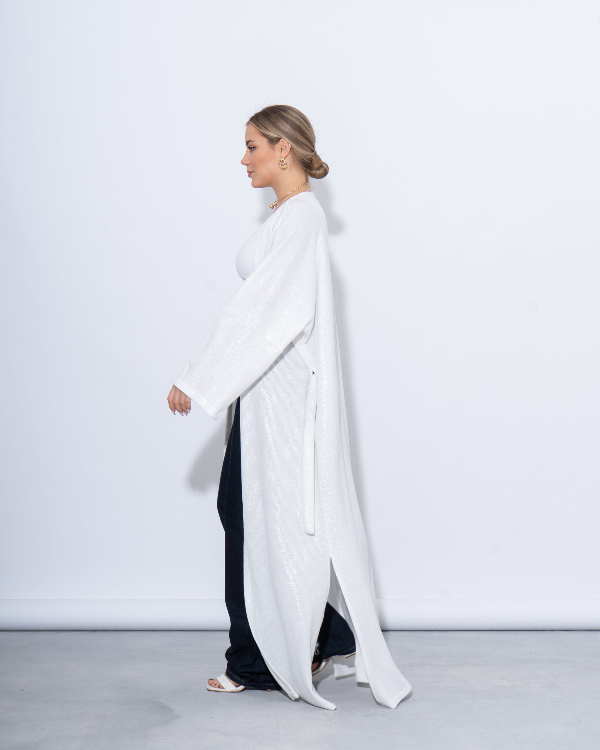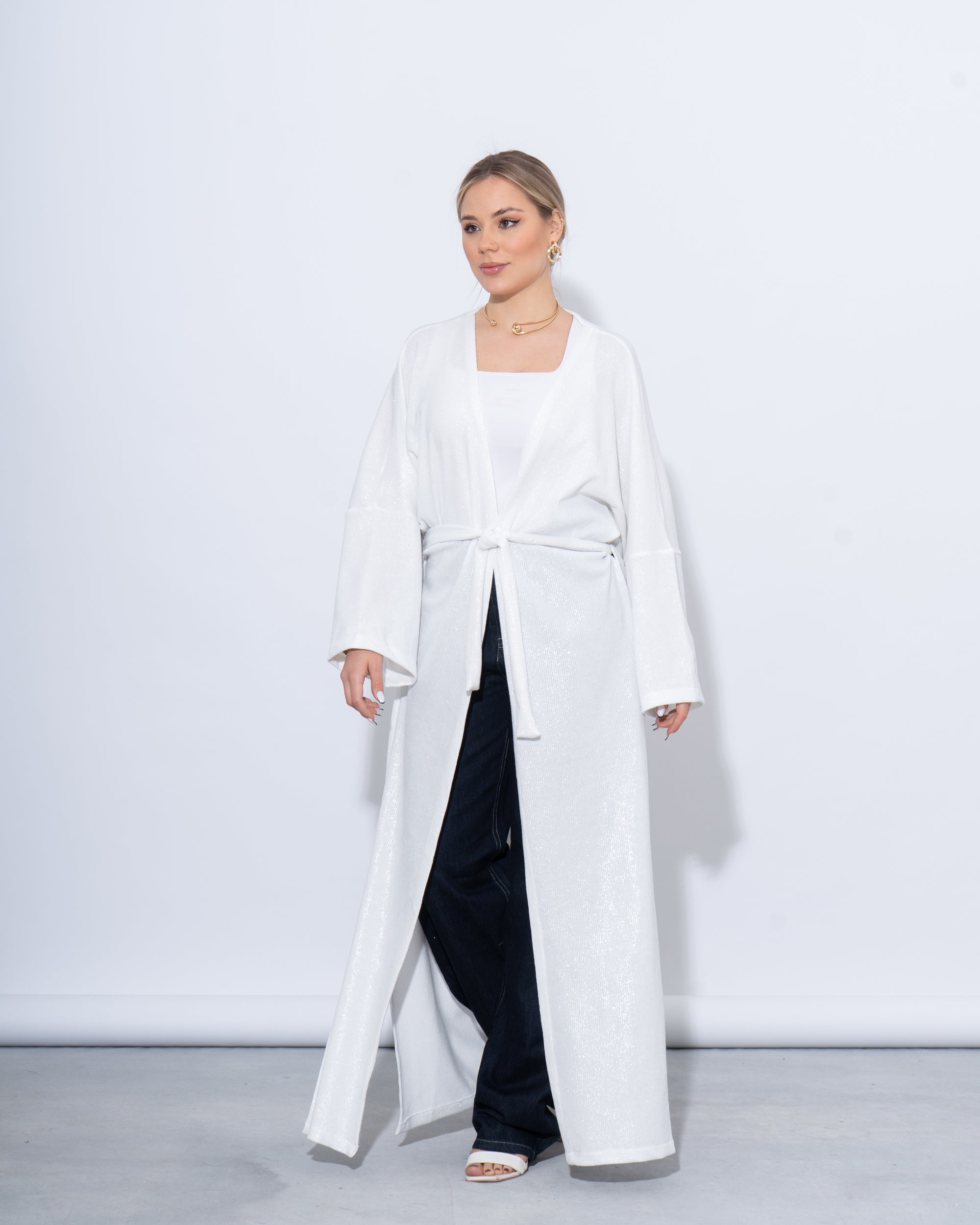A shimmering statement piece designed to elevate any outfit. This long knit cardigan features a soft, flowy silhouette with a subtle sparkle woven throughout, adding a touch of glam to your layering essentials.