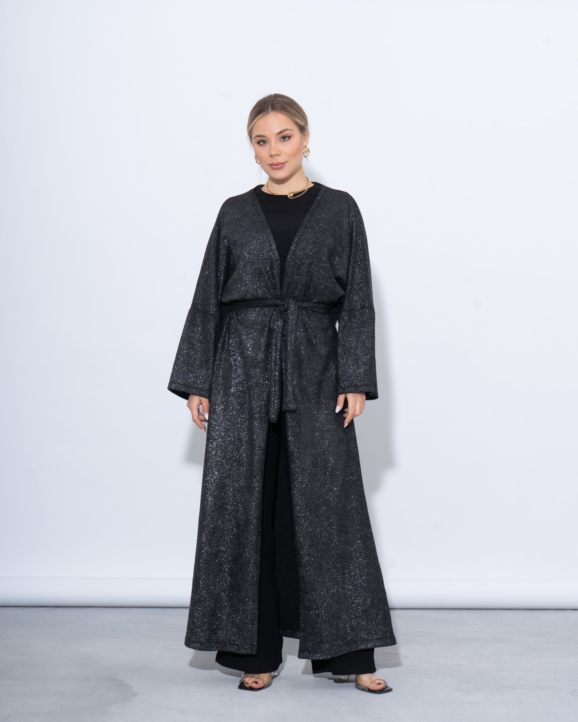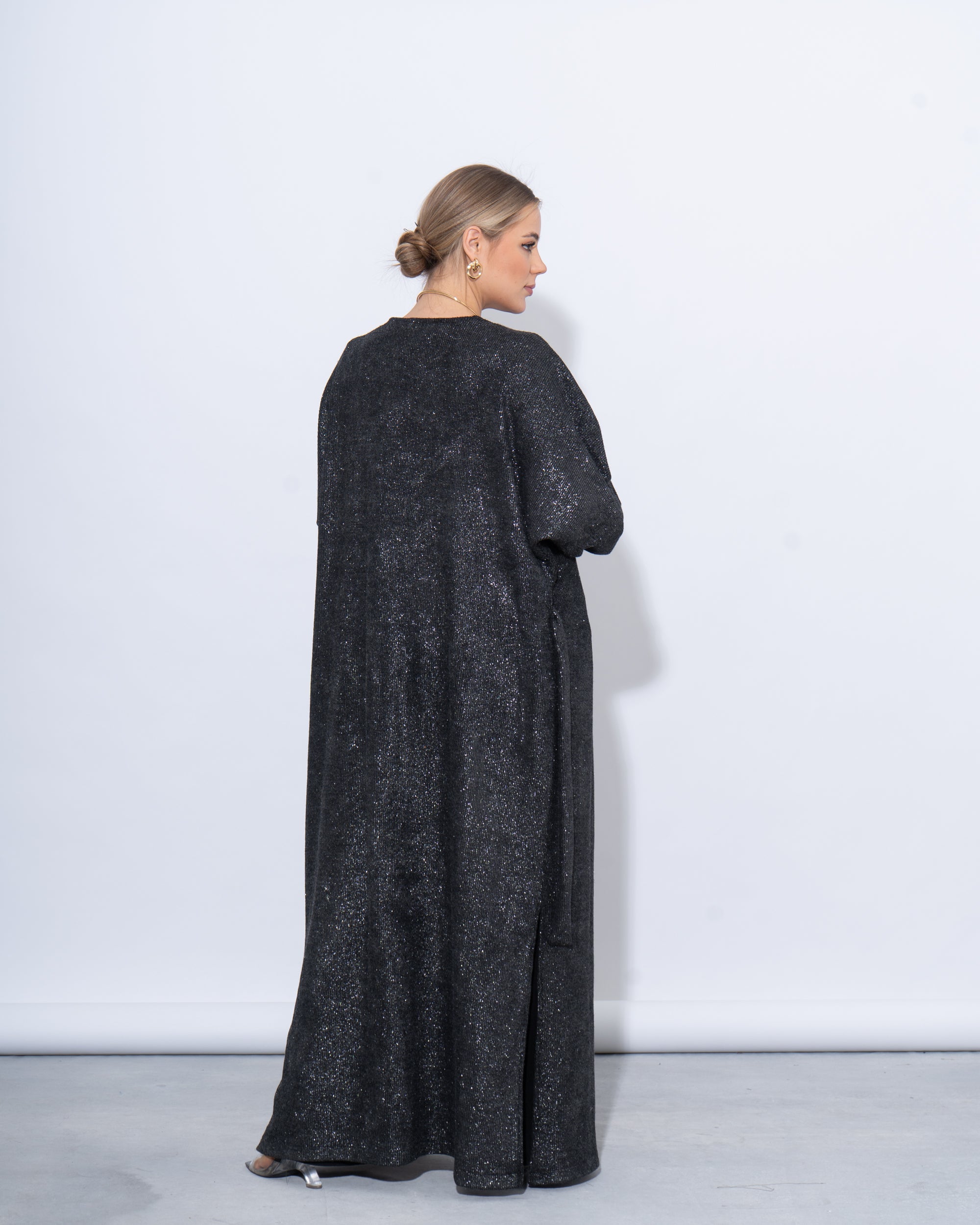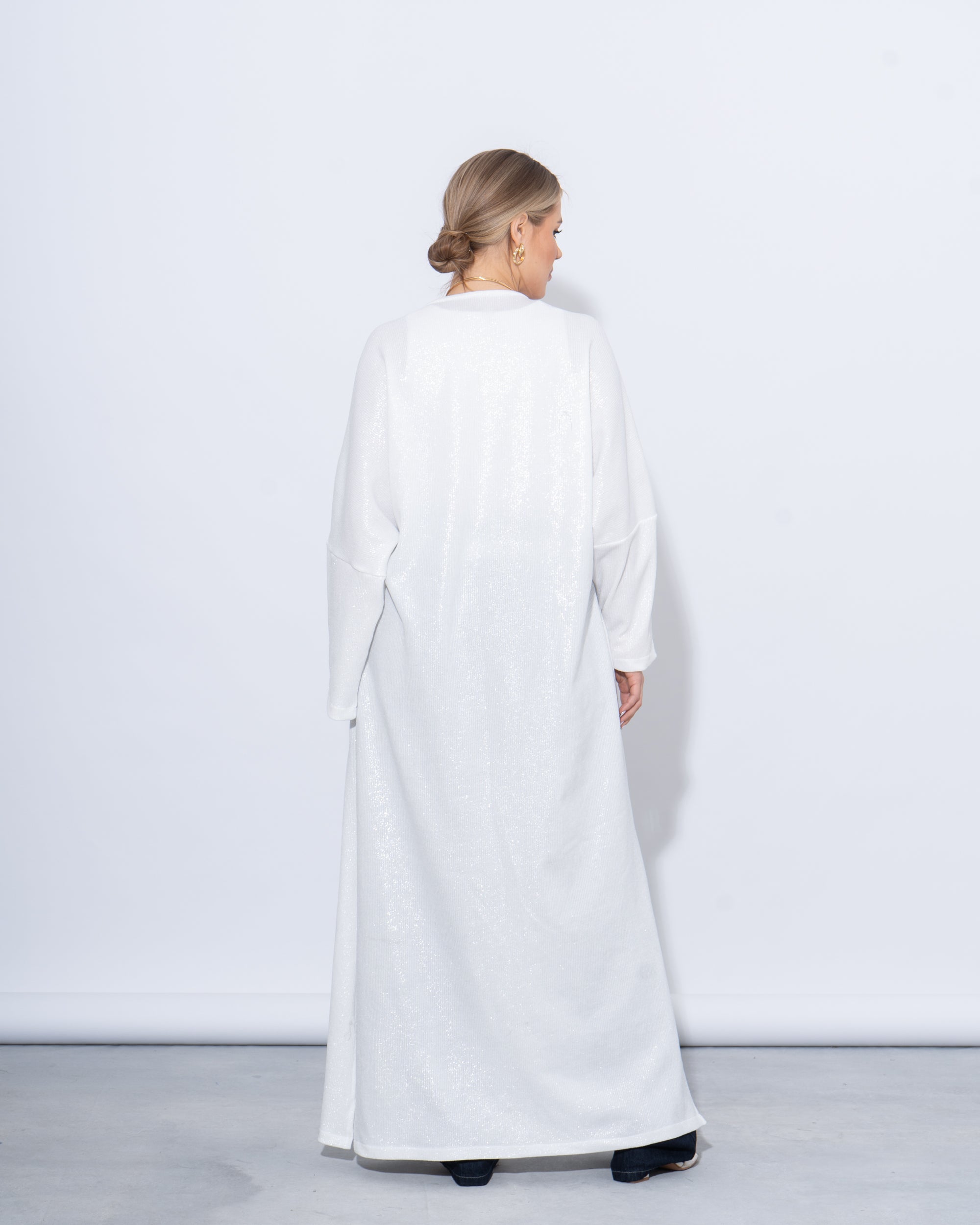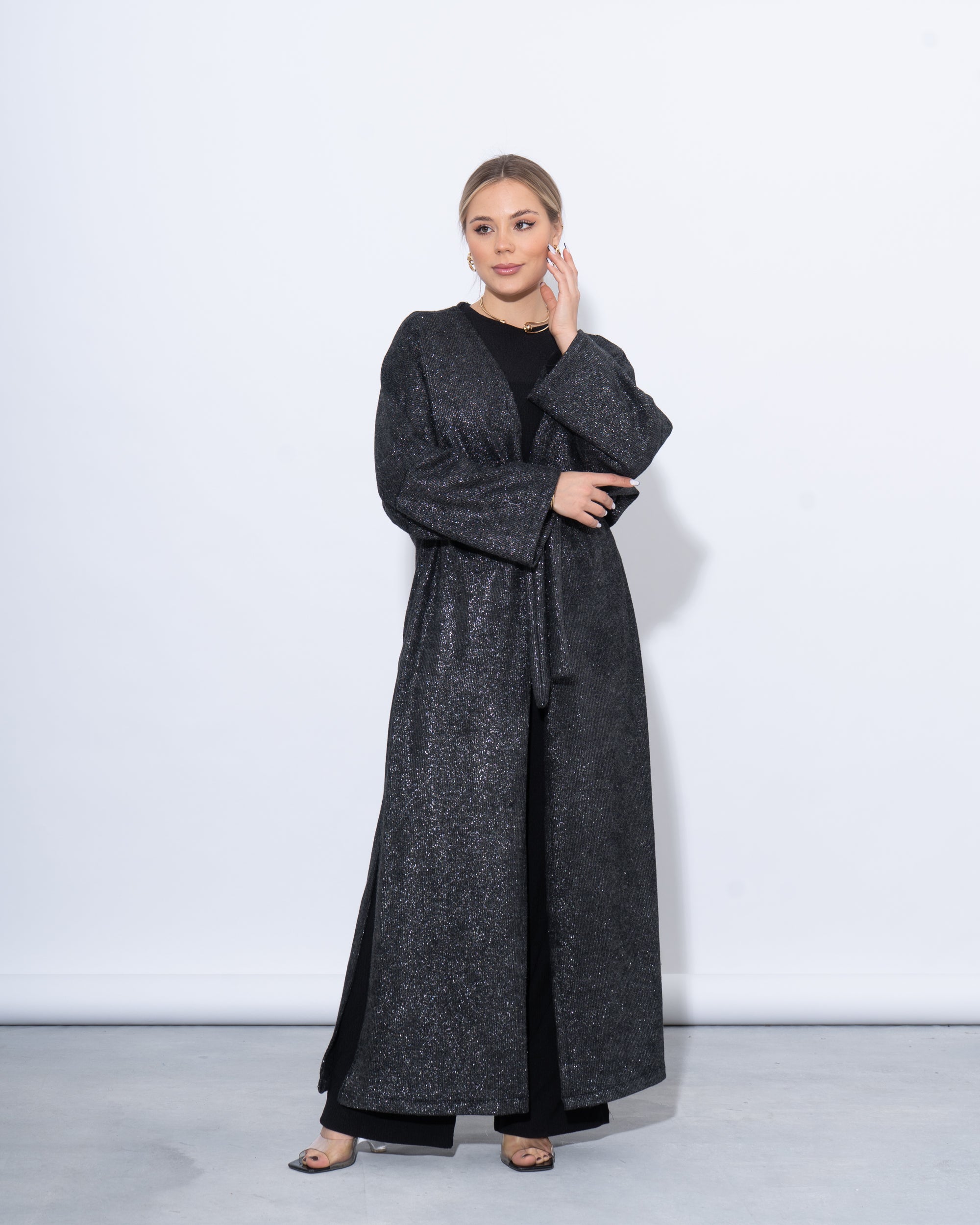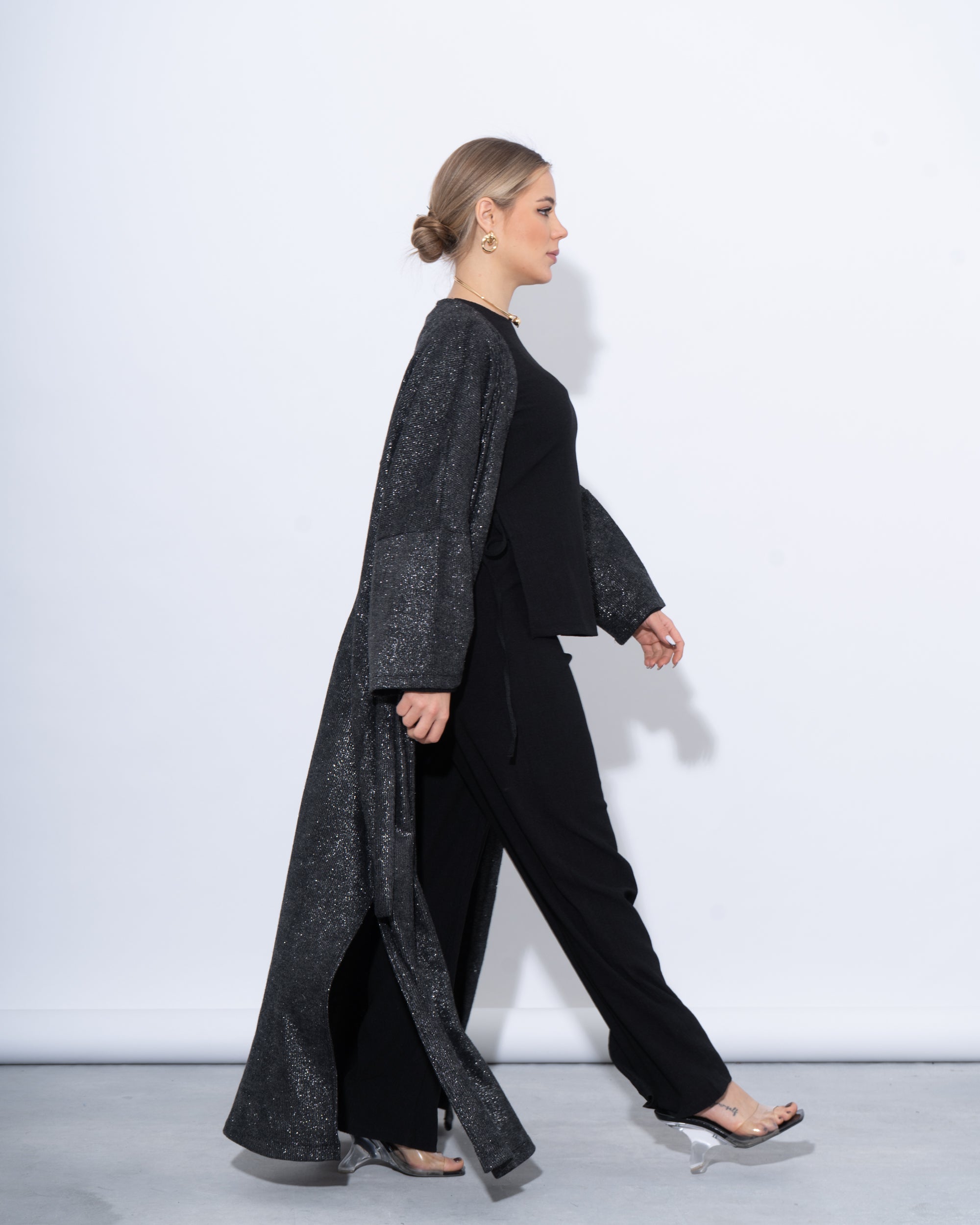 A shimmering statement piece designed to elevate any outfit. This long knit cardigan features a soft, flowy silhouette with a subtle sparkle woven throughout, adding a touch of glam to your layering essentials.