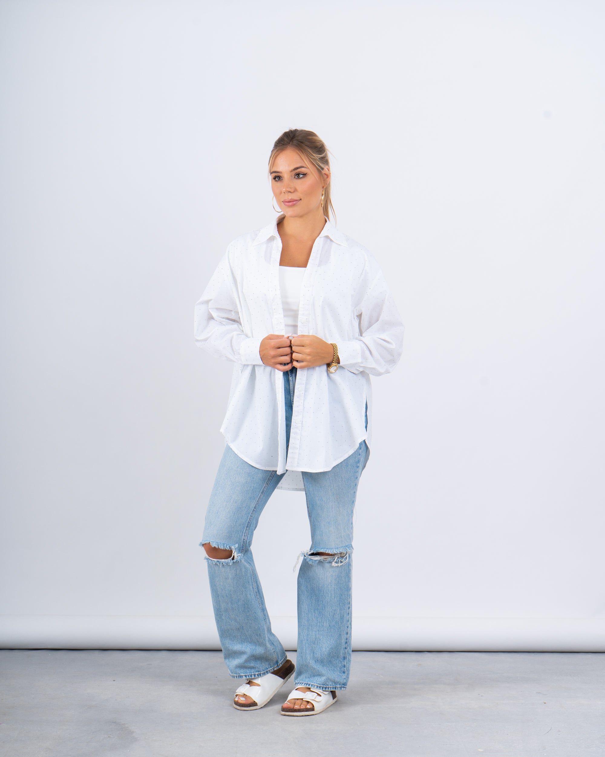 Elevate your casual looks with this oversized shirt featuring delicate crystal embellishments for a subtle sparkle. The relaxed silhouette makes it an effortless layering piece, perfect for chic daytime or evening outfits.