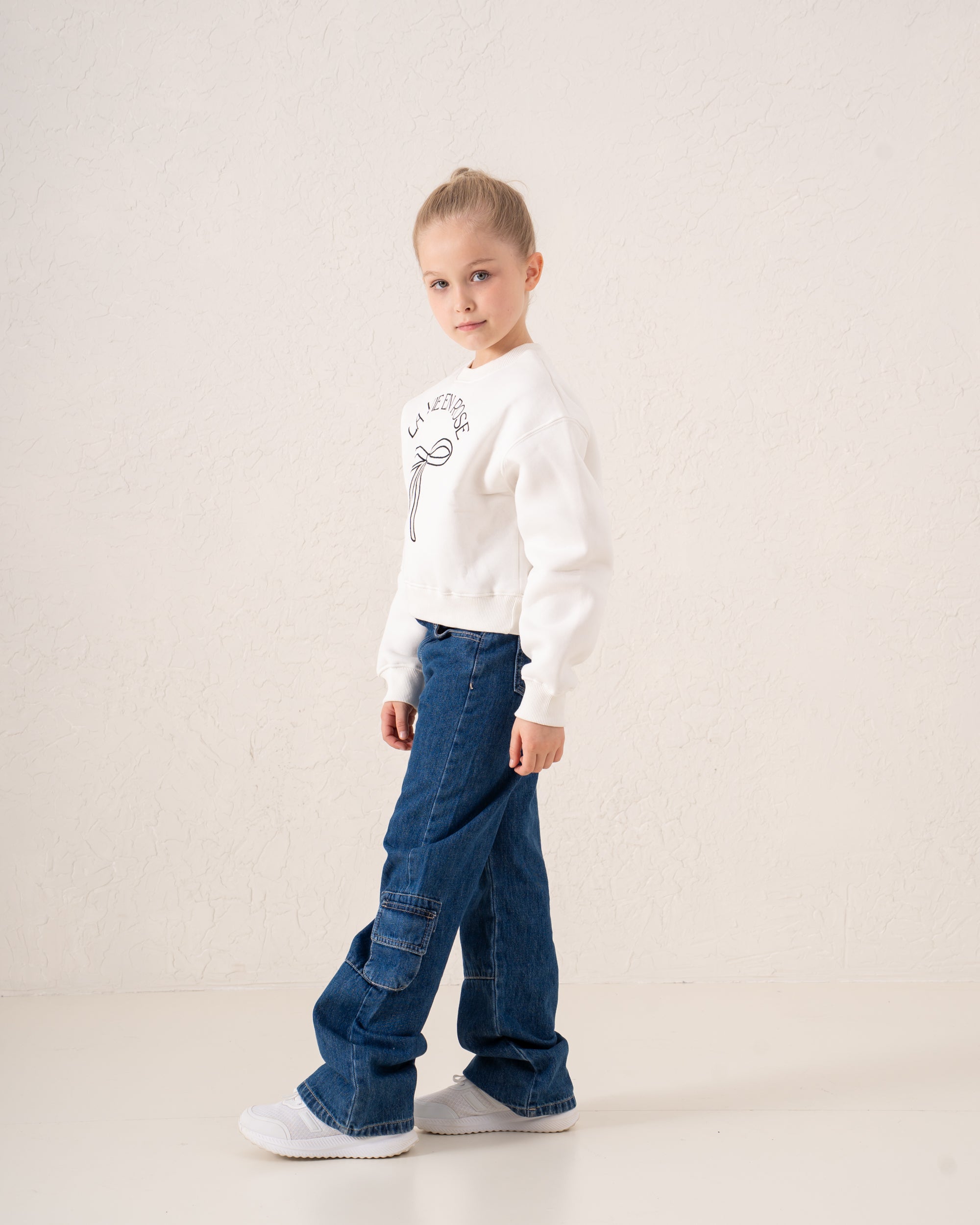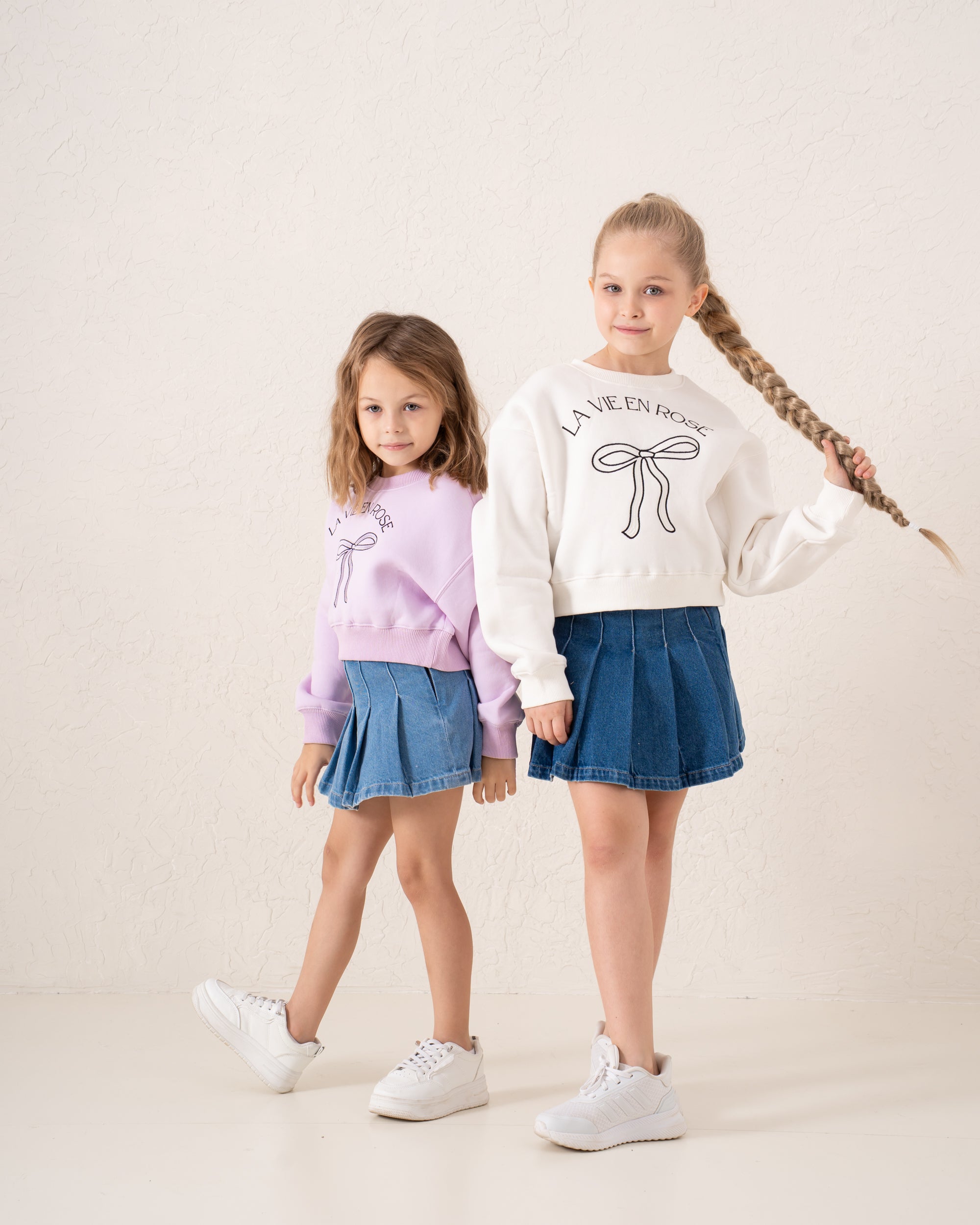 - Details: Bold bow graphic at the front, ribbed cuffs and hem, round neckline