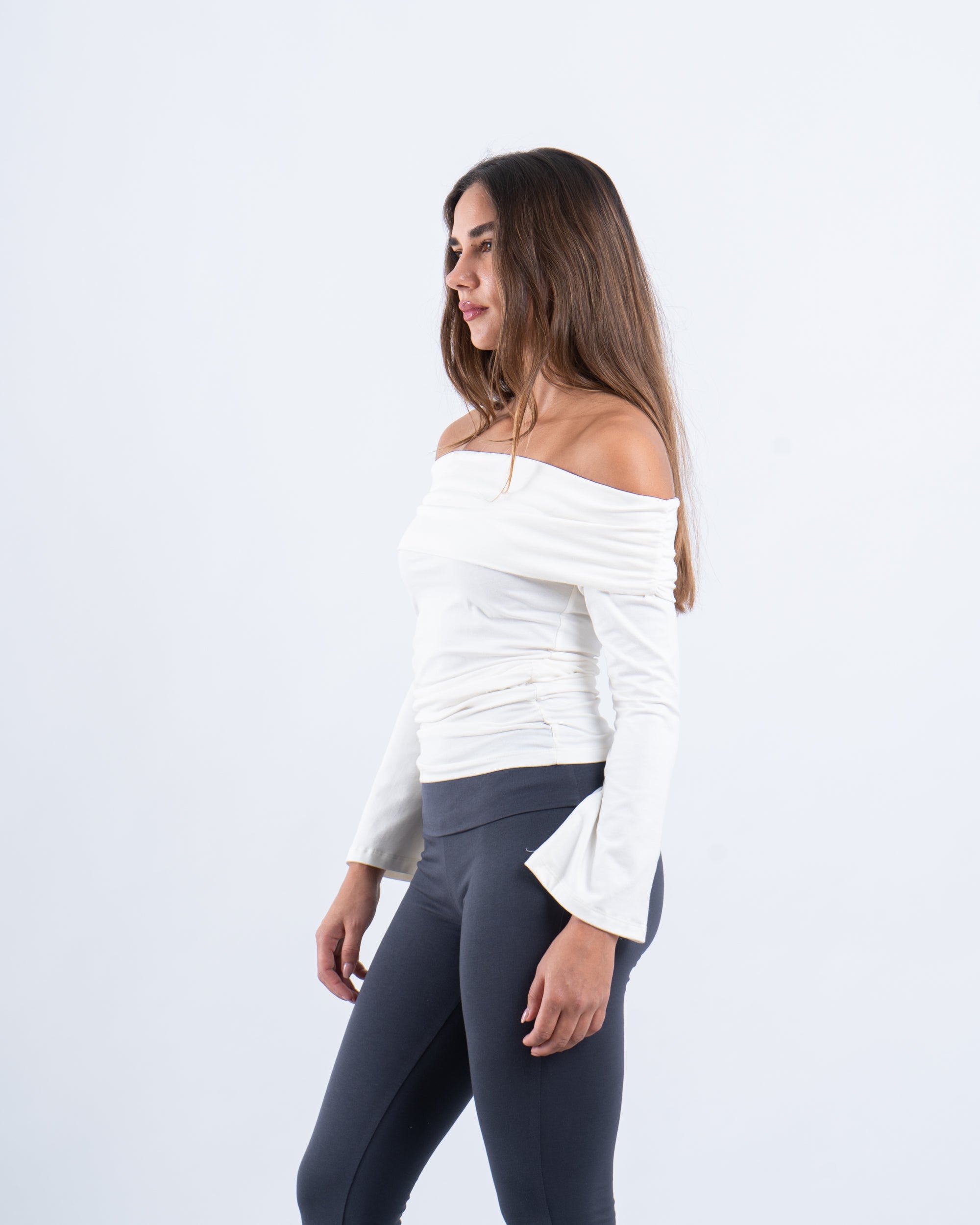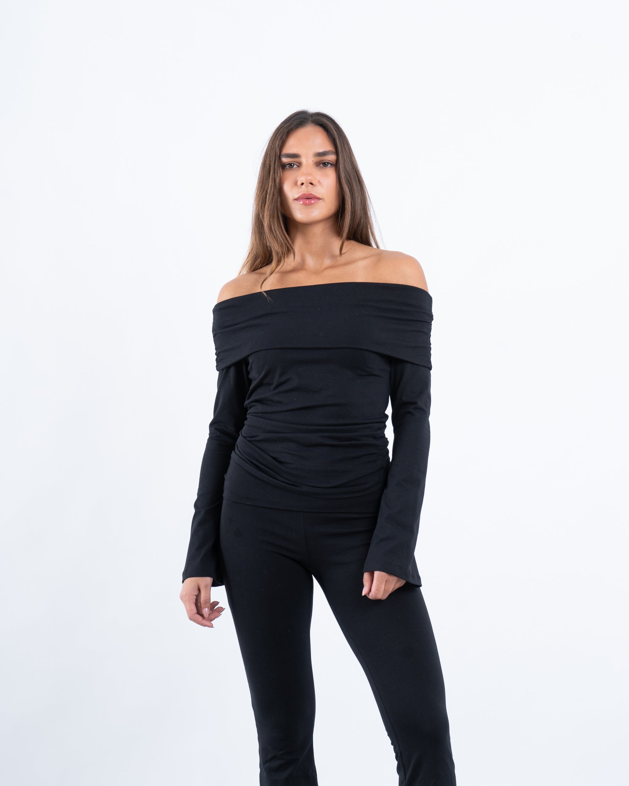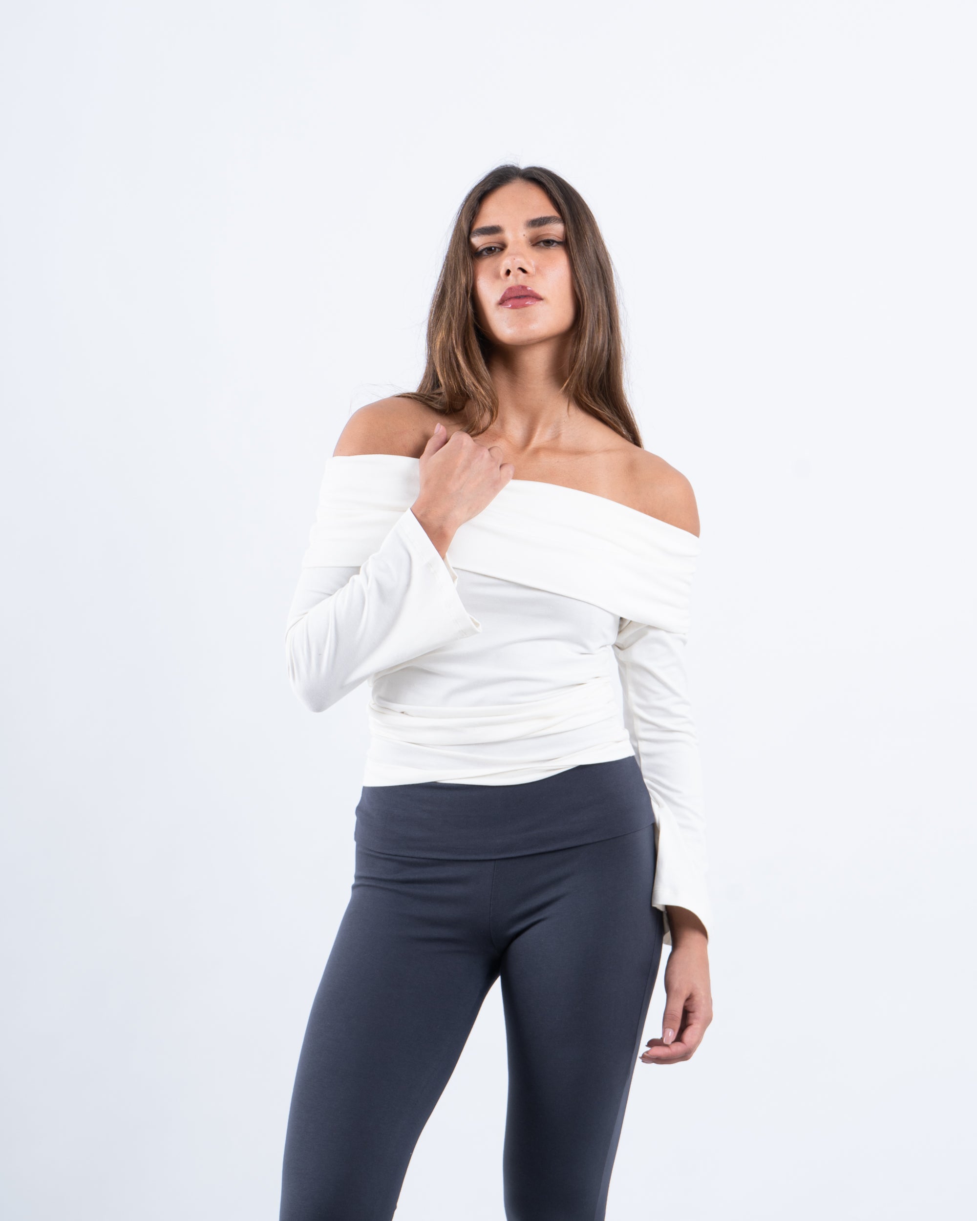 A sleek and feminine staple, this off-shoulder wrap top is designed for an effortlessly chic look.