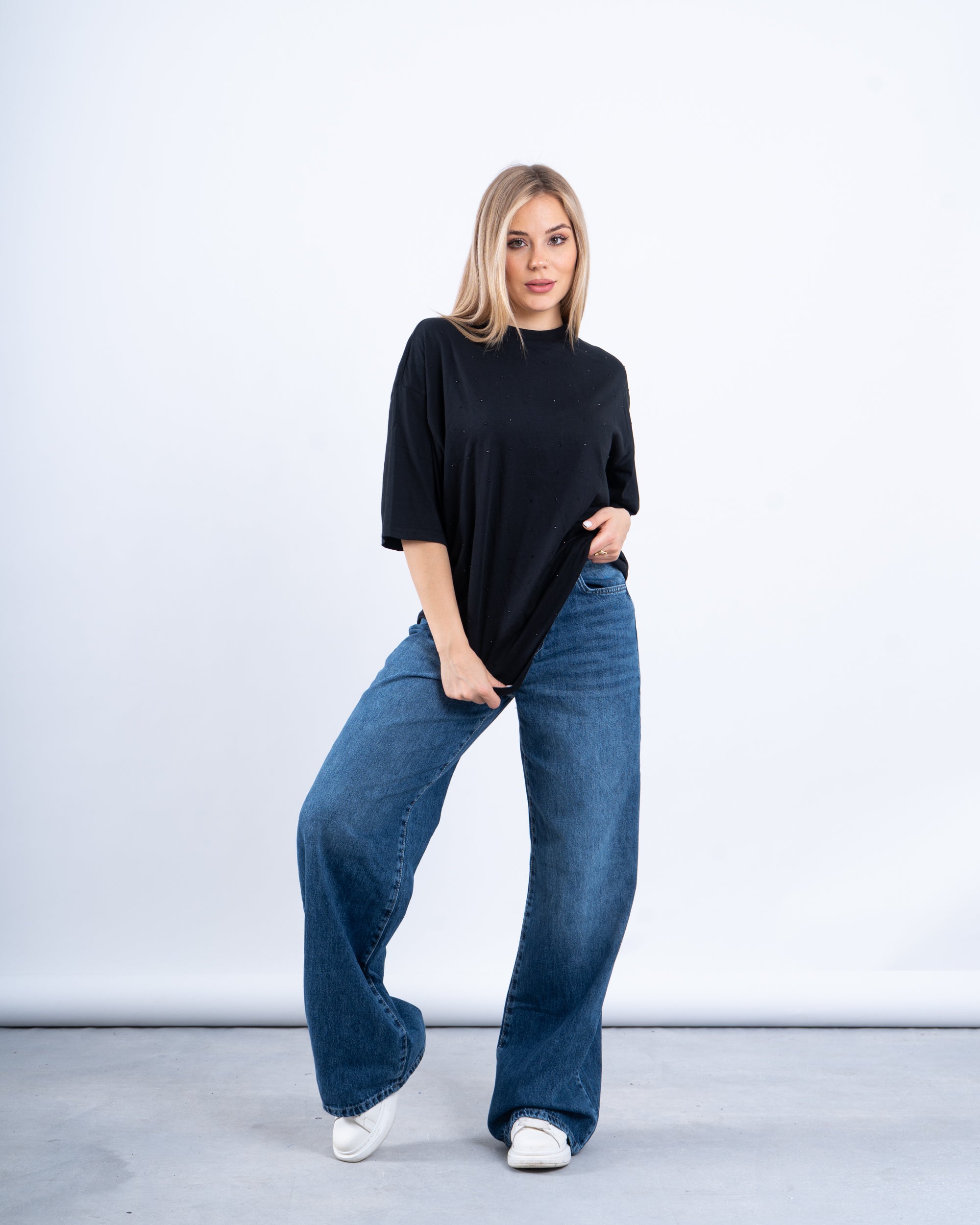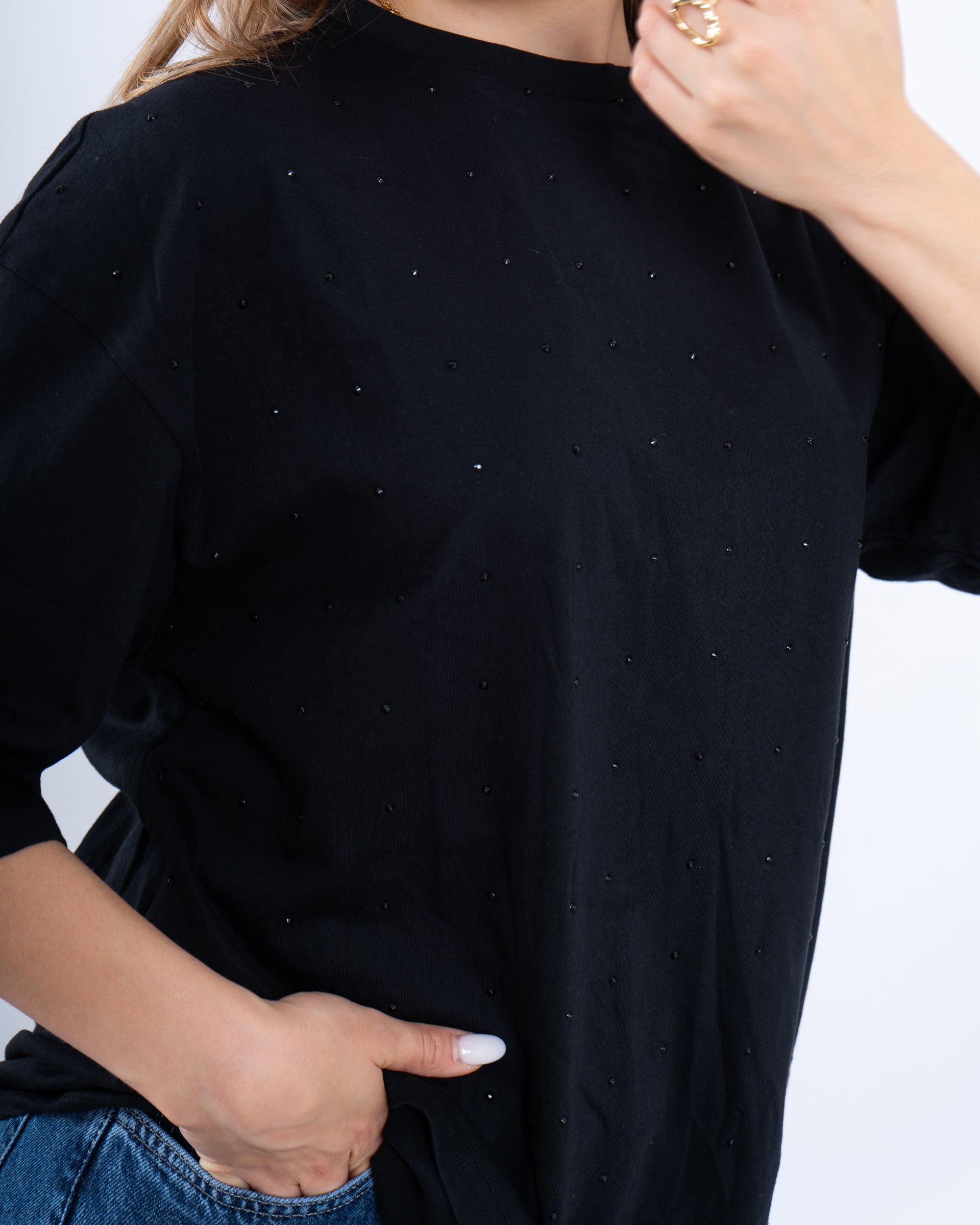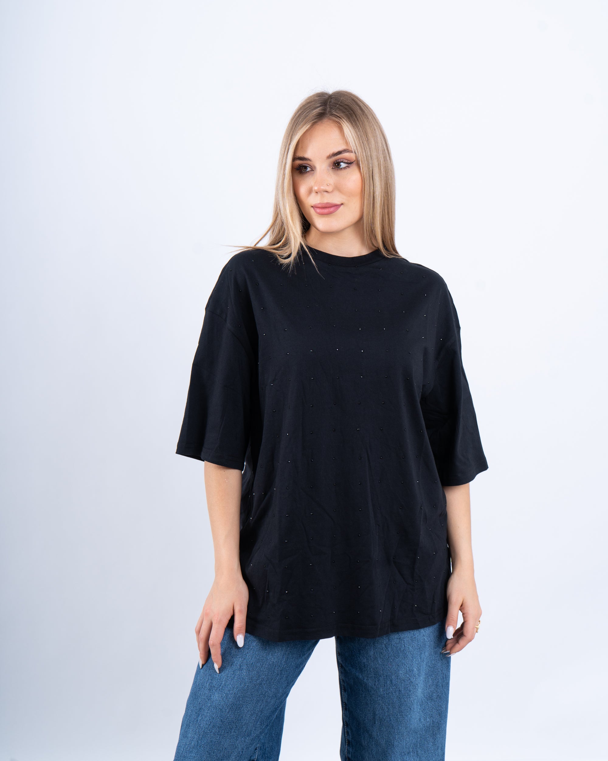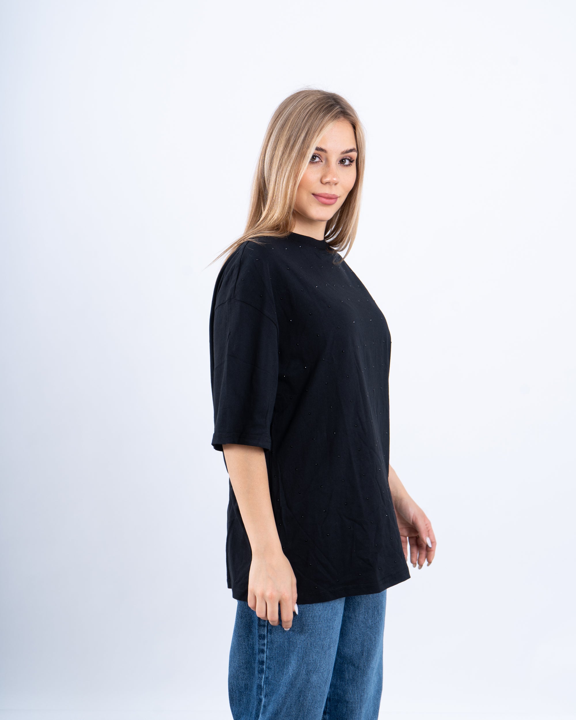 An everyday tee with a subtle shimmer. This oversized T-shirt is sprinkled with micro-studs for a sparkling twist on a wardrobe classic—perfect for dressing up your casual looks.