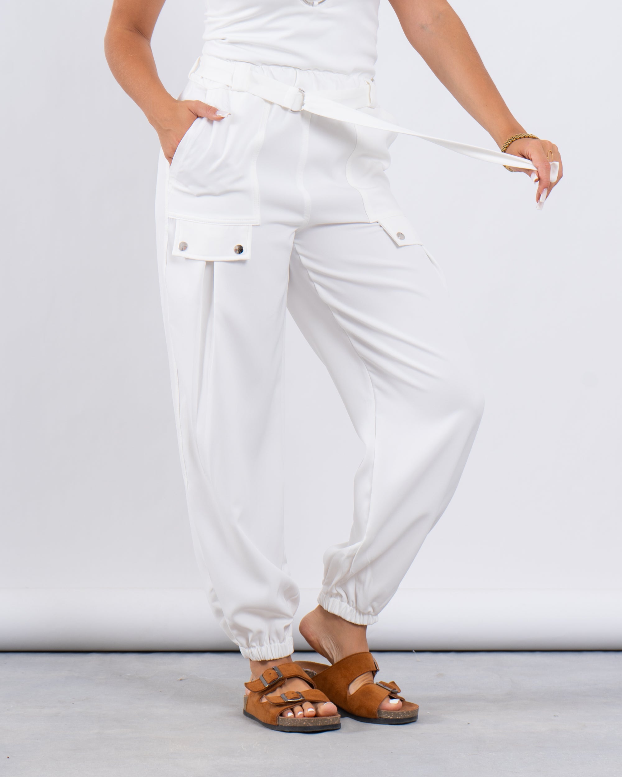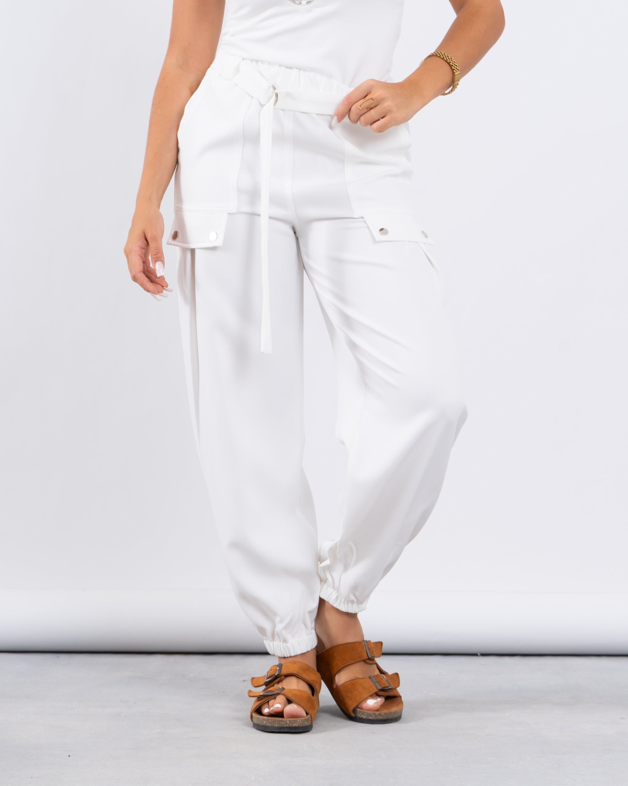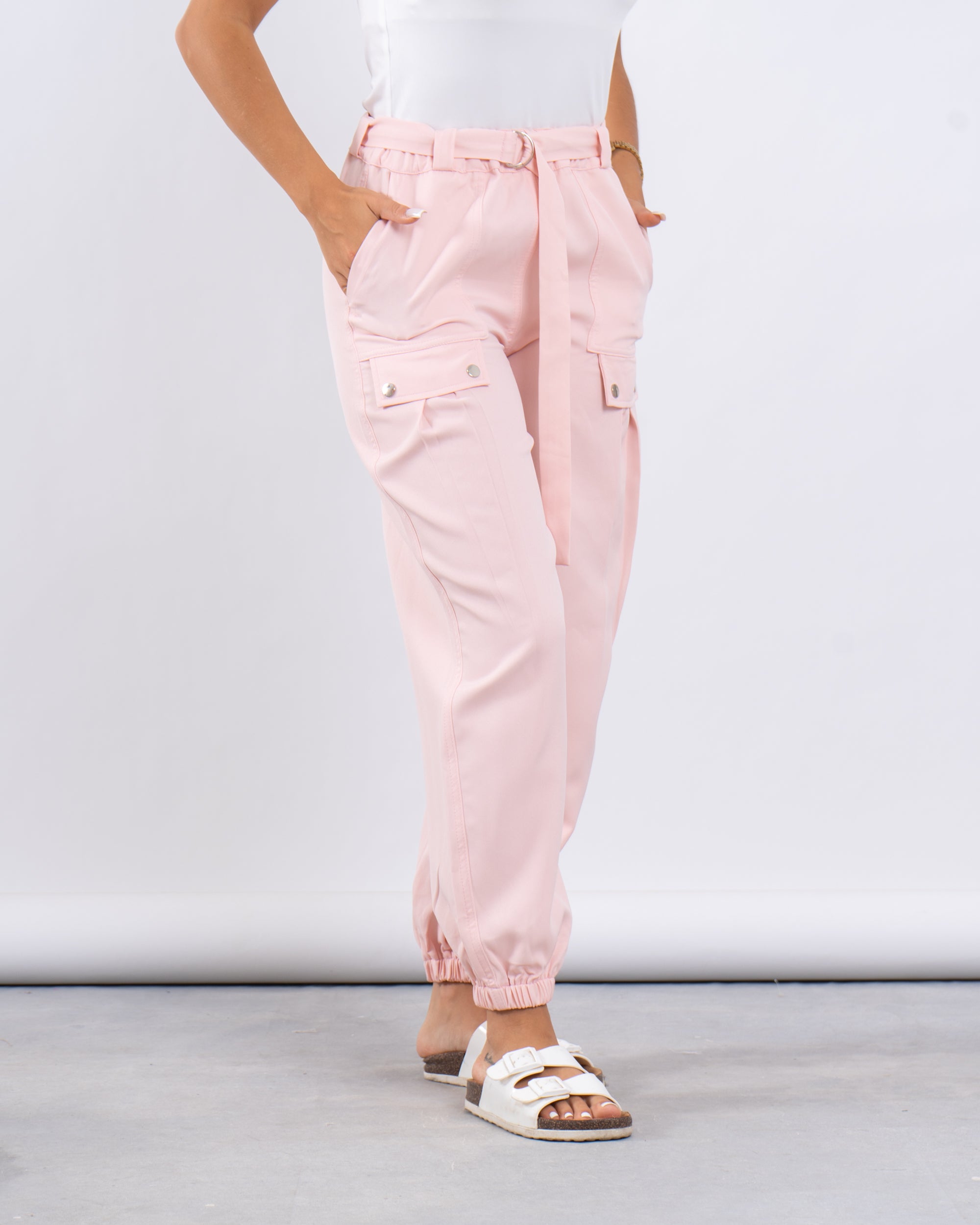 Laid-back yet put-together. These jogger-style cargo pants feature utility-inspired side pockets, a matching fabric belt, and elastic cuffs for a flattering tapered silhouette.