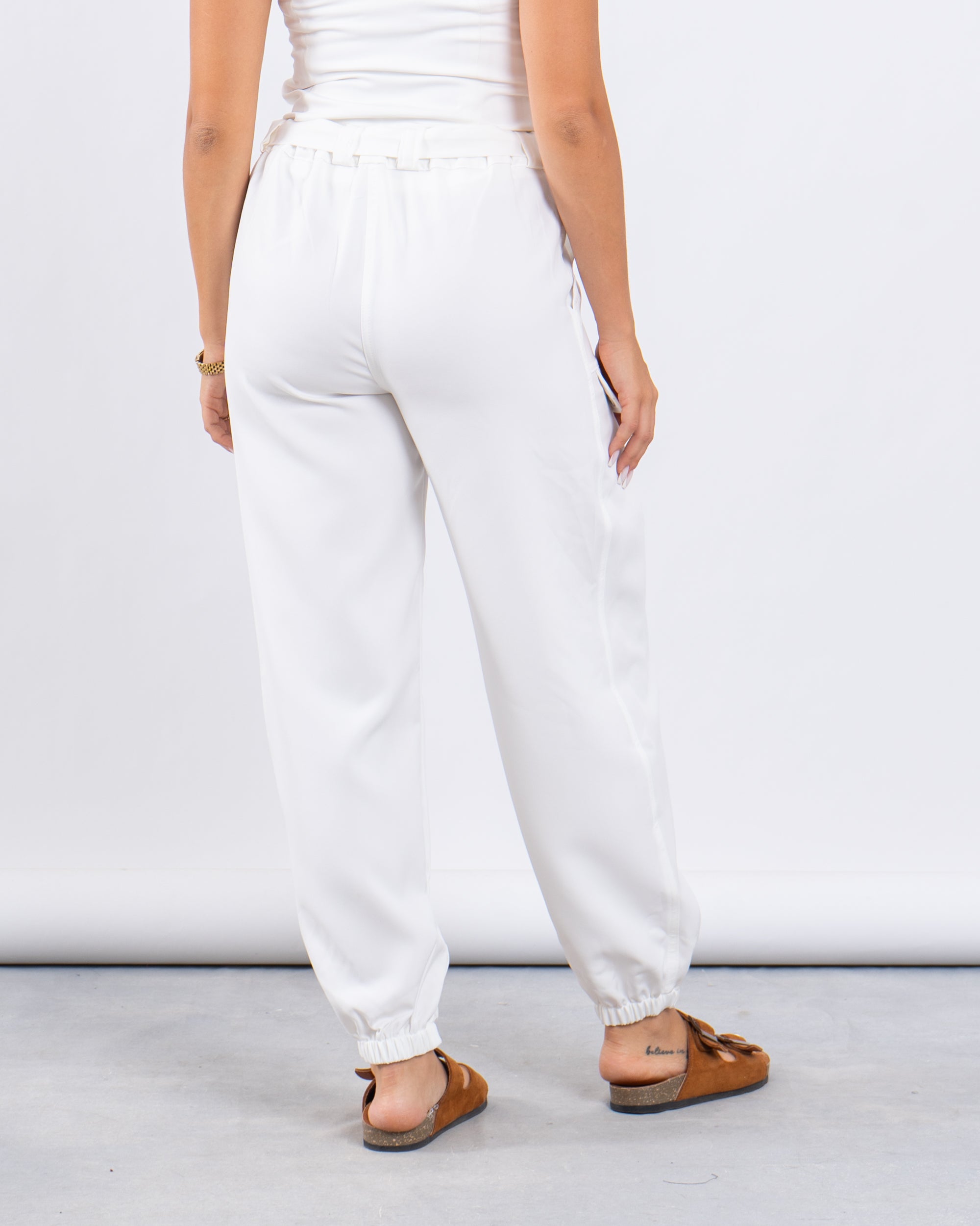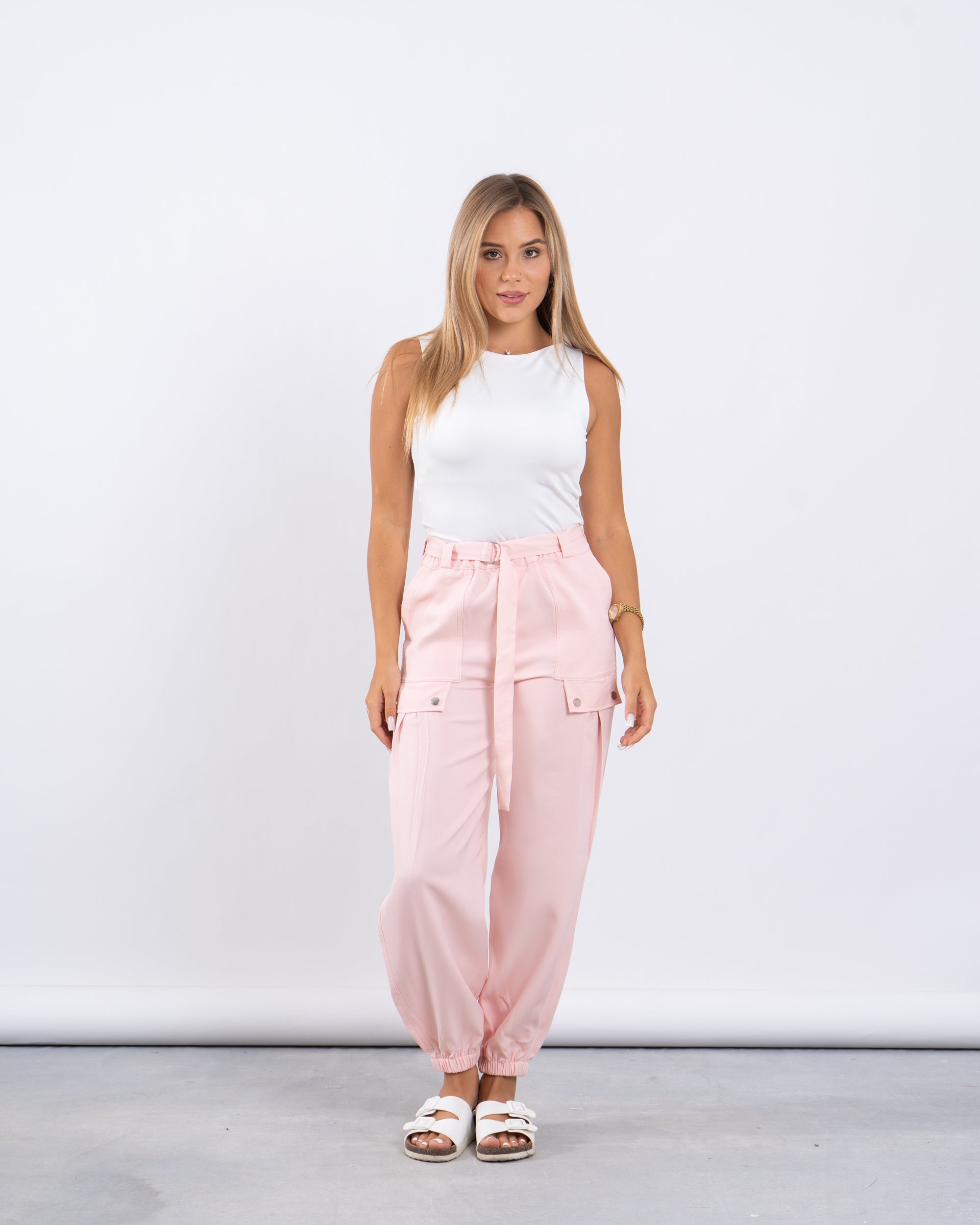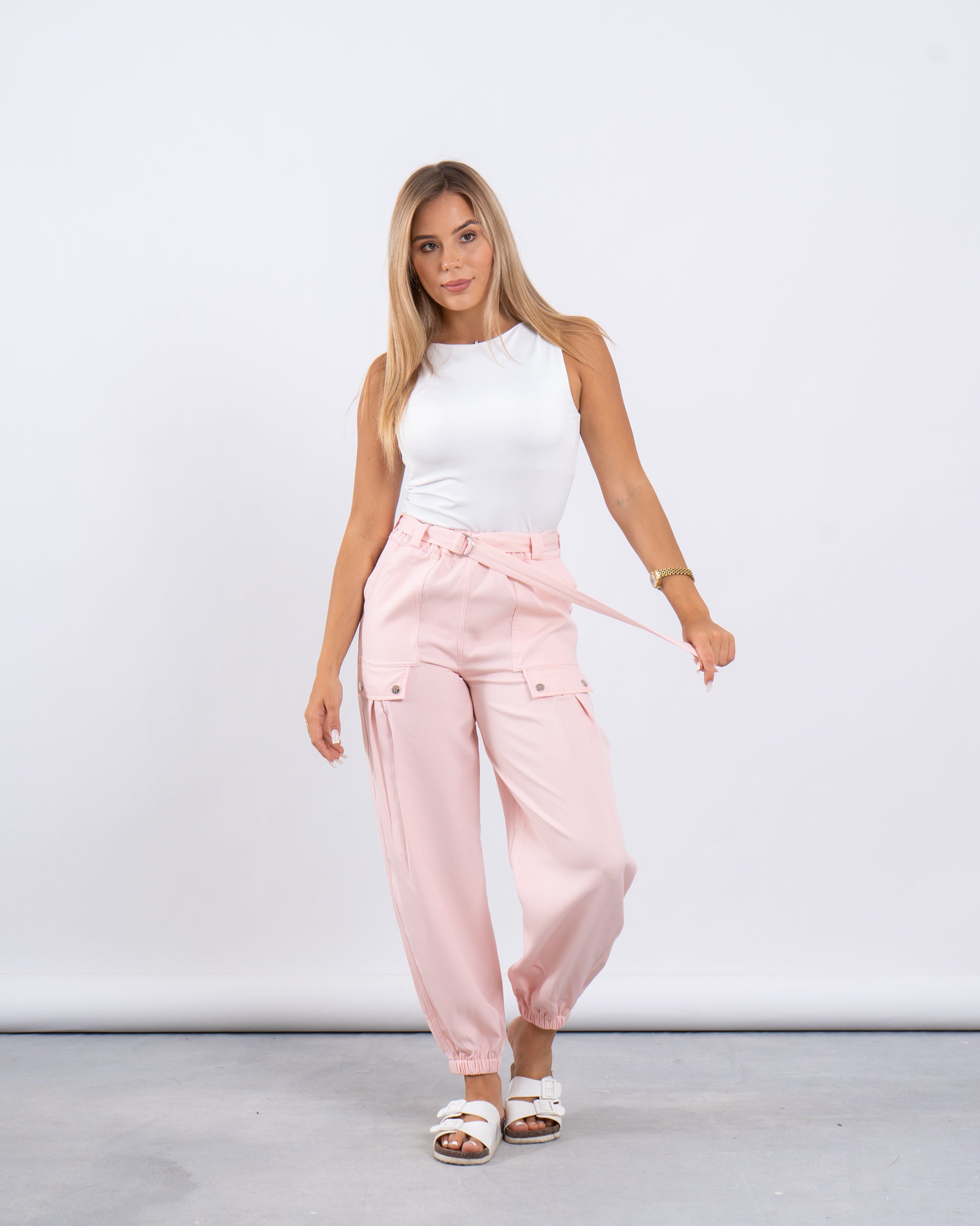 Laid-back yet put-together. These jogger-style cargo pants feature utility-inspired side pockets, a matching fabric belt, and elastic cuffs for a flattering tapered silhouette.