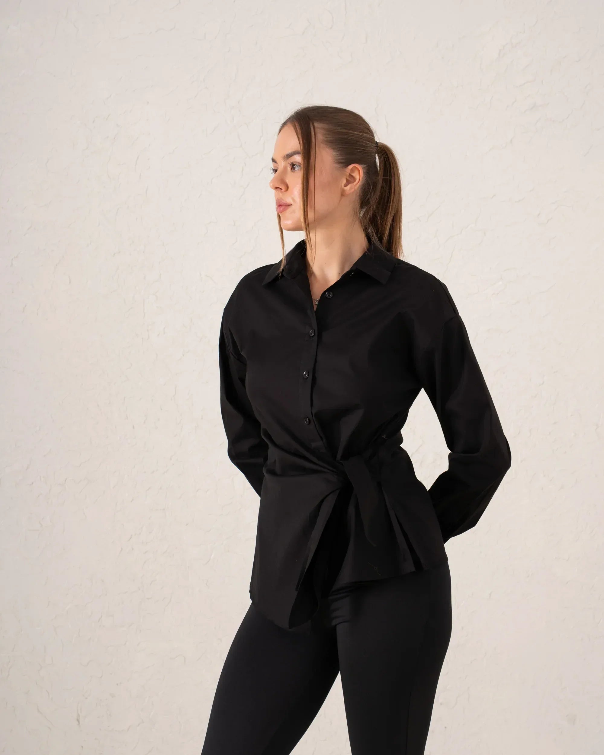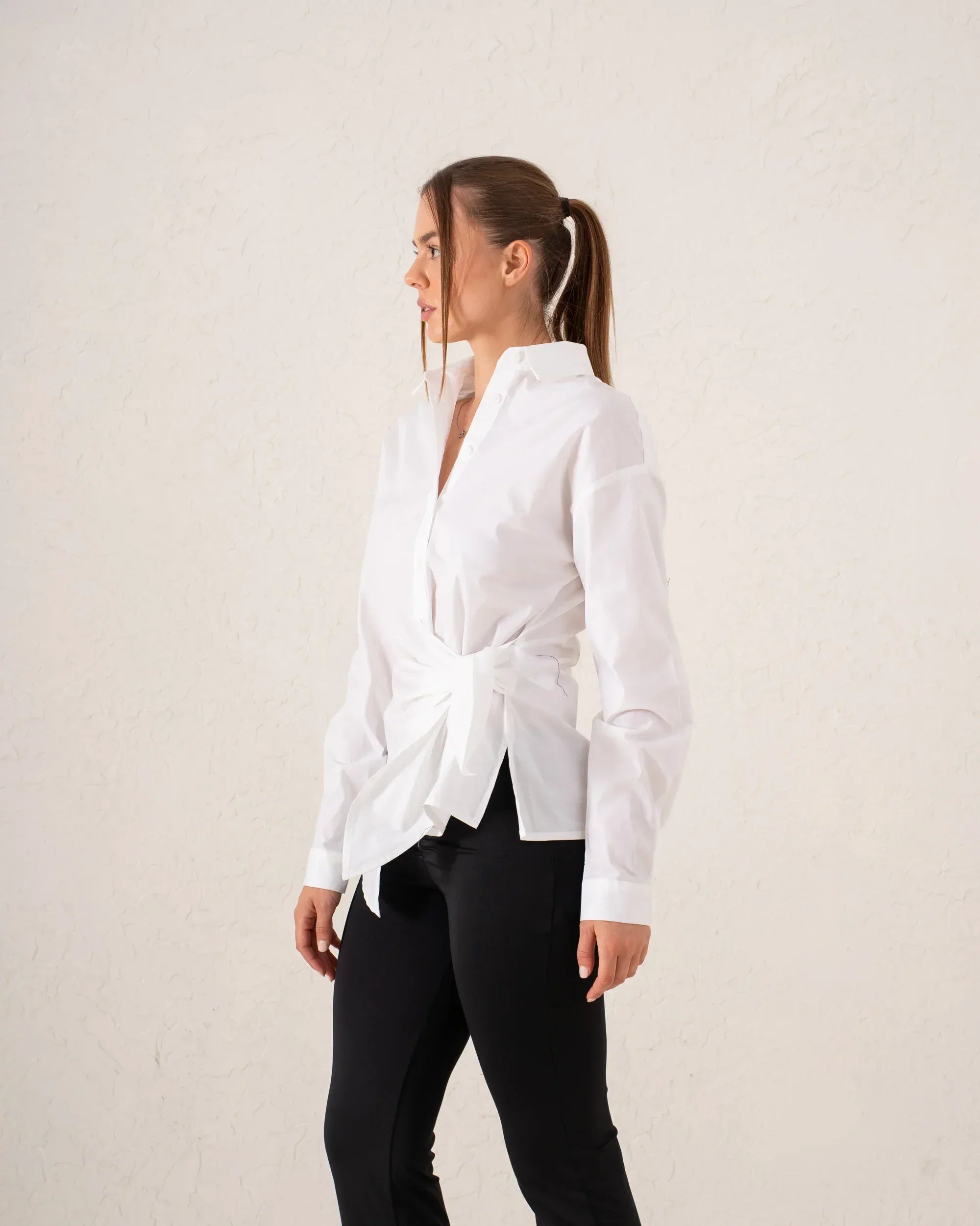 This playful pink crop blouse features a charming belted waist that highlights the figure. The cropped cut and high neckline give this blouse a modern, stylish look perfect for transitioning from day to night.