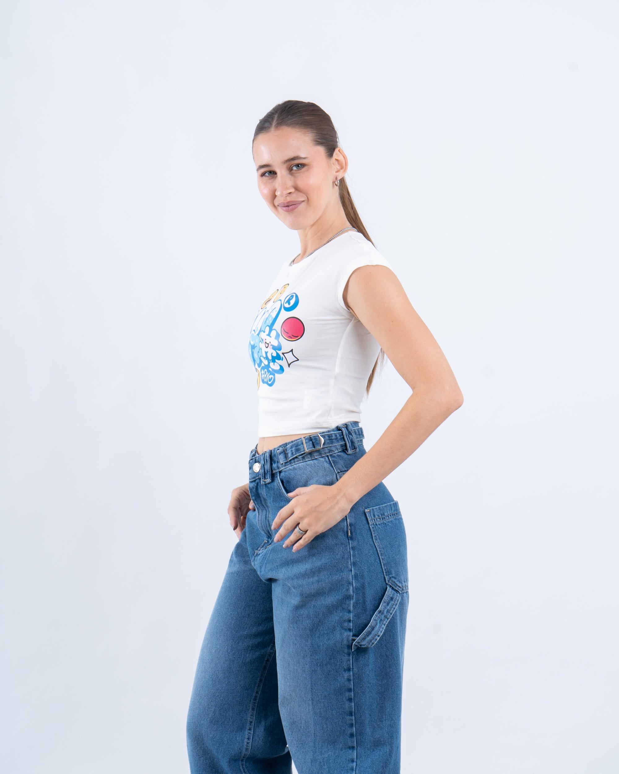This fun and playful graphic crop t-shirt brings a burst of color and personality to any outfit. Featuring a vibrant cartoon-inspired graphic design with smiley faces and unique characters, this fitted t-shirt is perfect for casual, laid-back looks. The cropped length pairs well with high-waisted jeans or sweatpants for an effortlessly cool style.