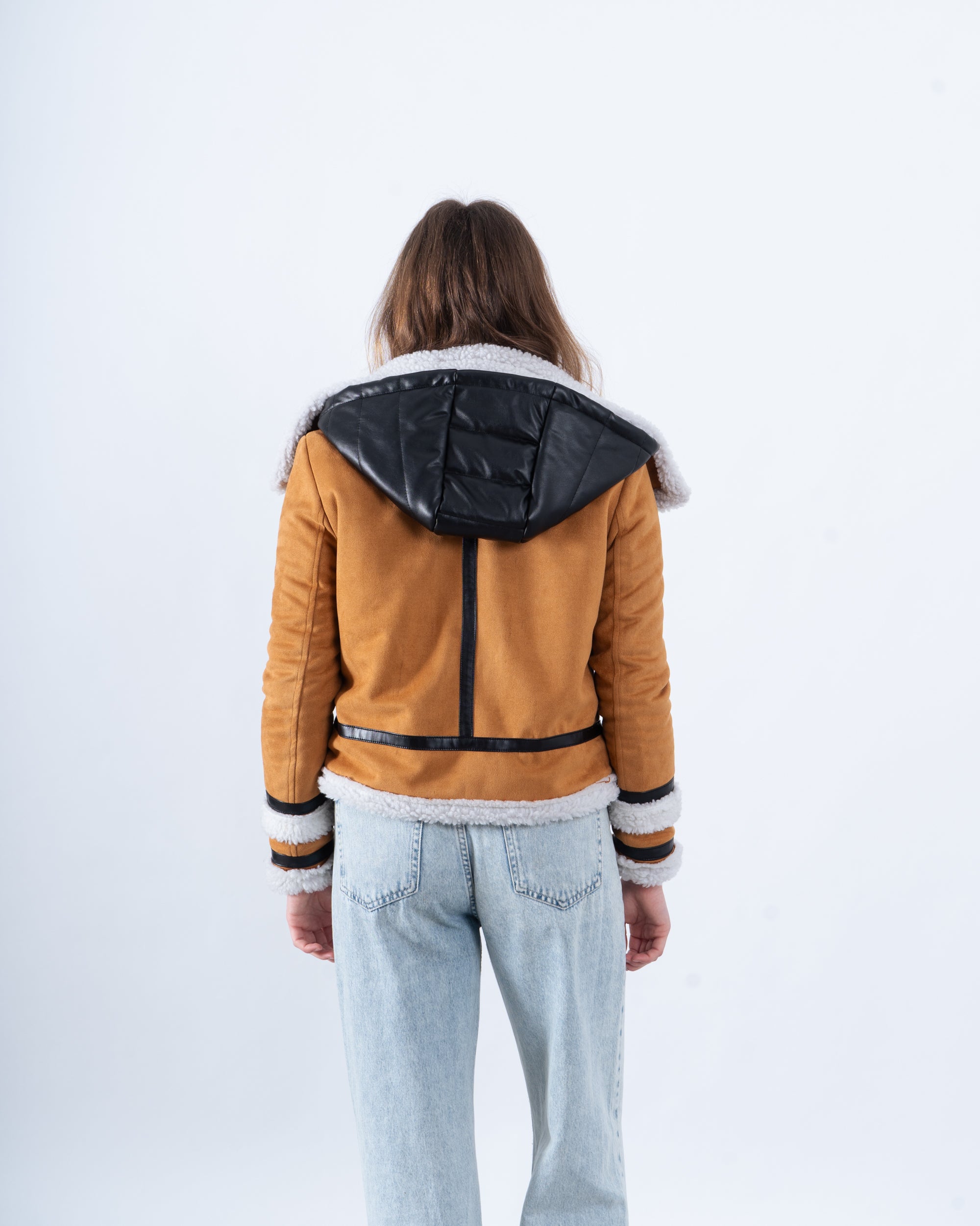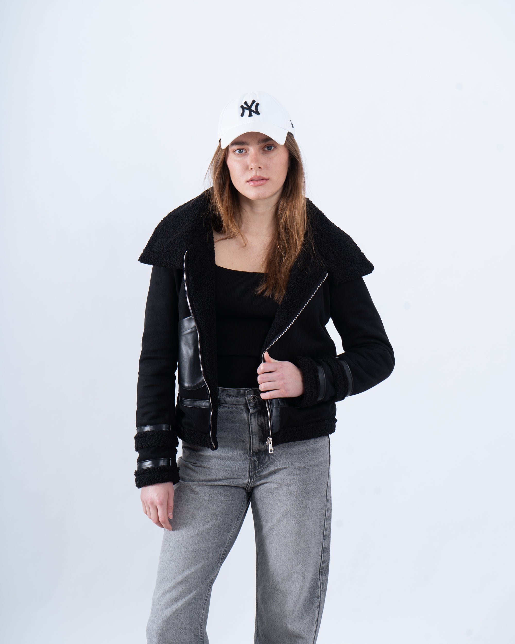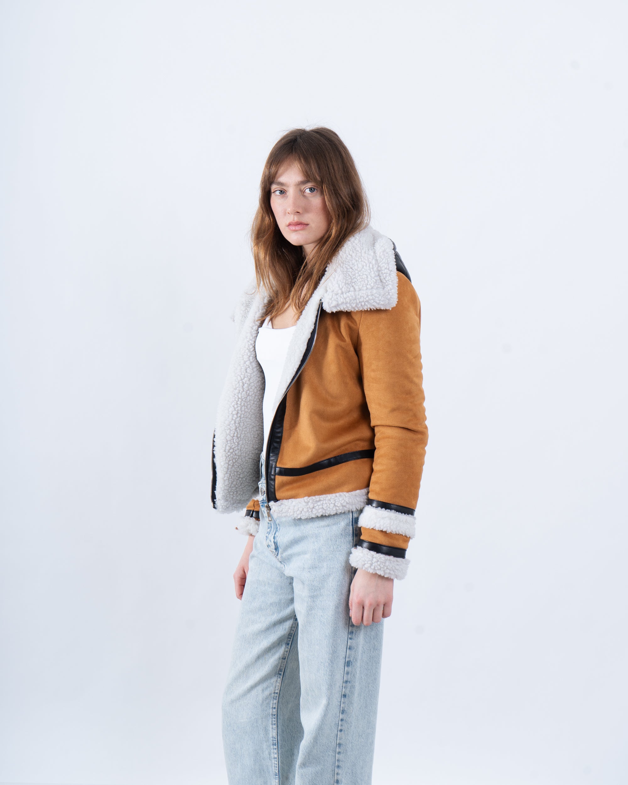 Channel vintage vibes with this faux shearling aviator jacket, available in classic black and warm camel. Featuring a cozy shearling collar, zip-up front, and buckle detailing, this jacket is your go-to for staying warm while looking effortlessly cool.