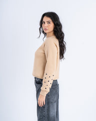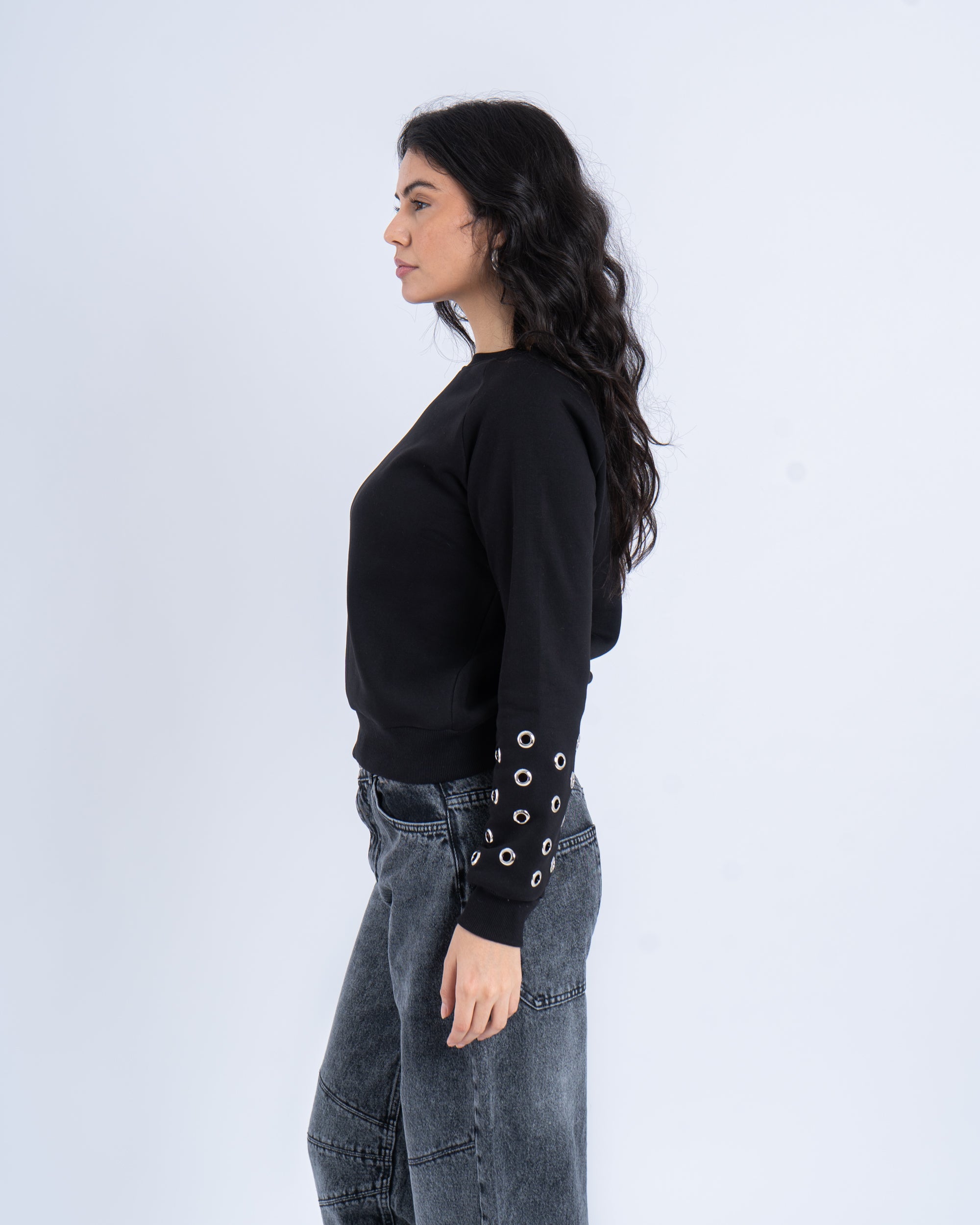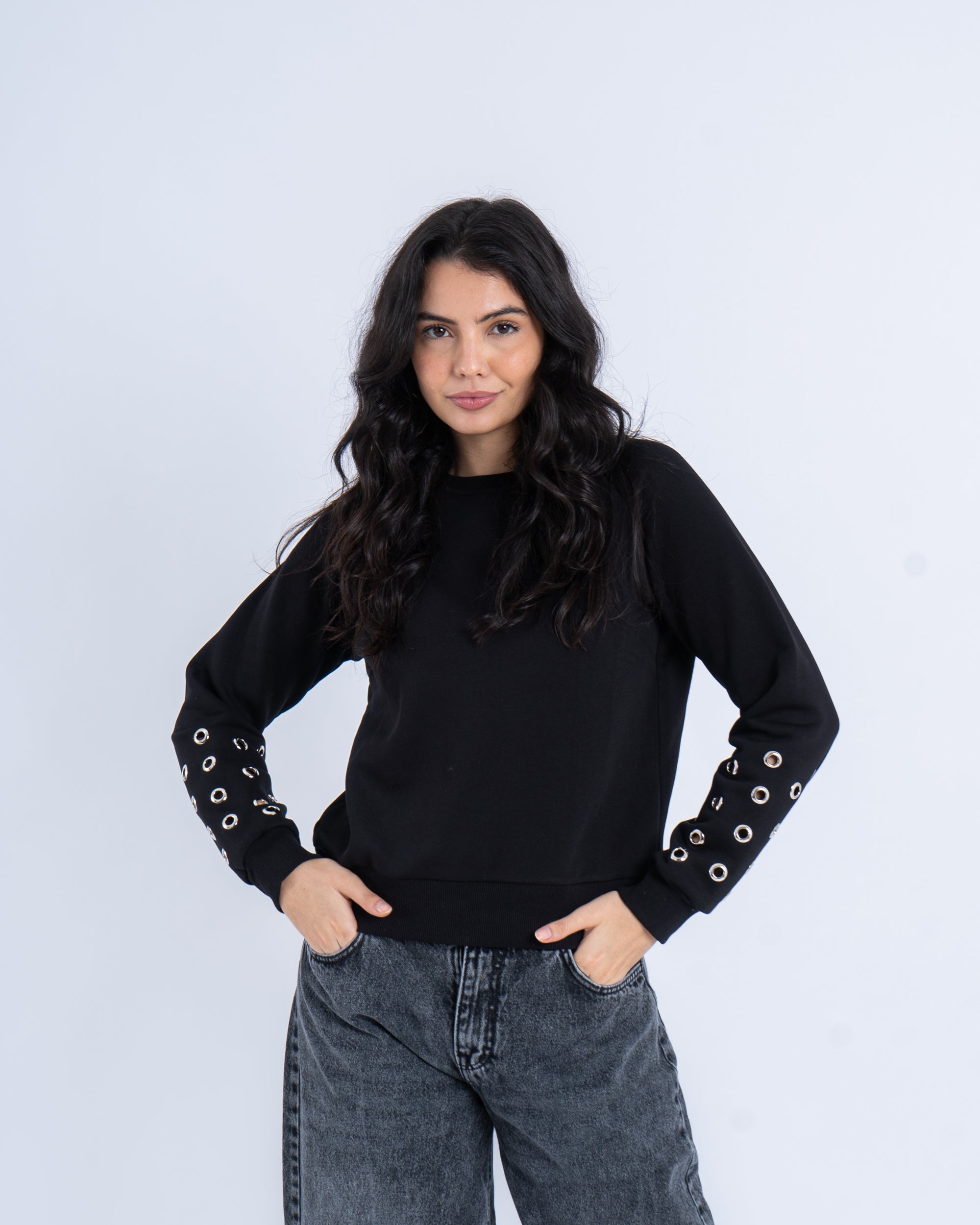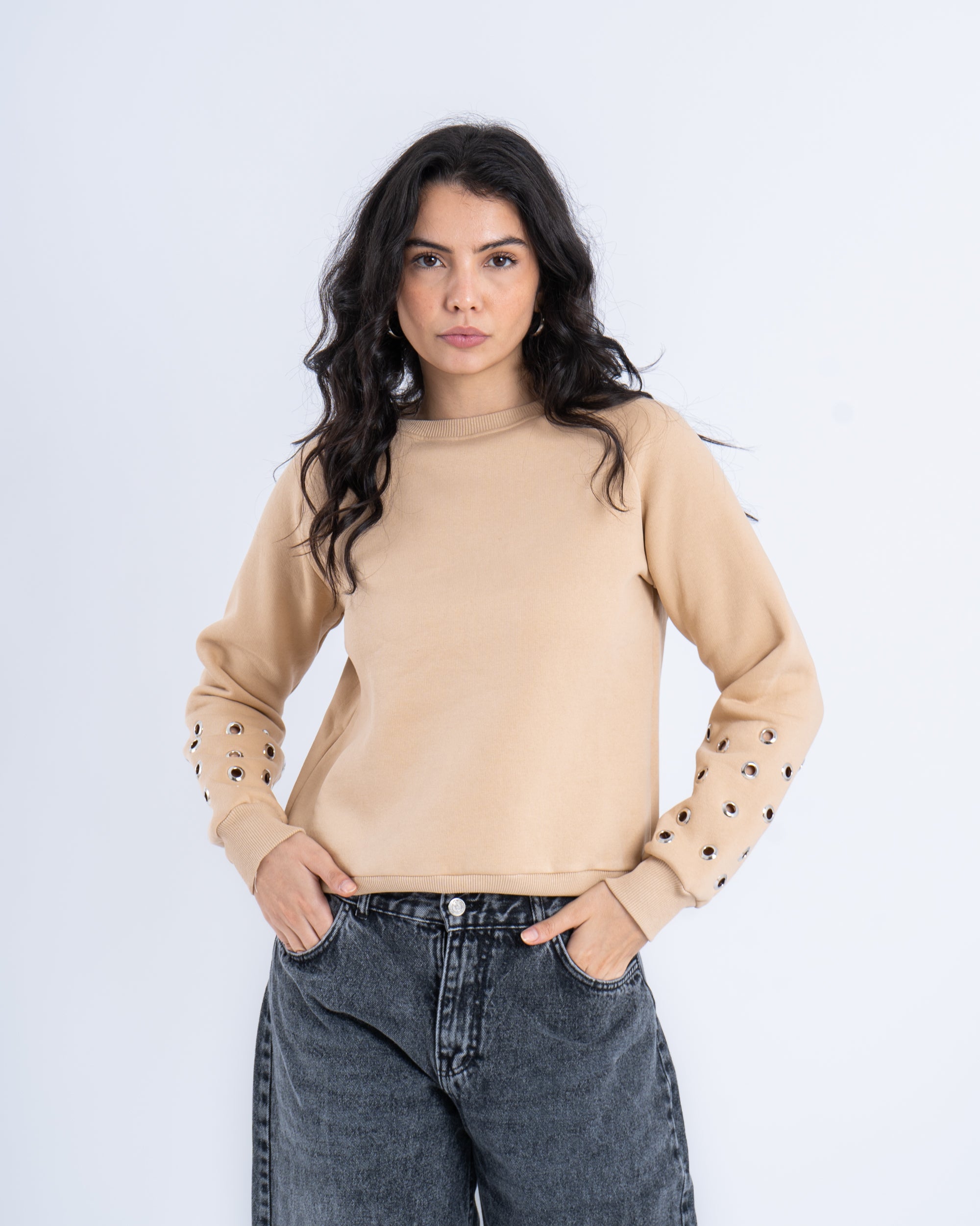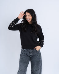 Upgrade your casual wardrobe with this studded sleeve sweatshirt, a must-have for those who love subtle detailing with a modern edge. Available in classic black and beige, this sweatshirt is designed for both comfort and style. The standout feature is the eye-catching studs along the sleeves, giving a trendy twist to a timeless silhouette.