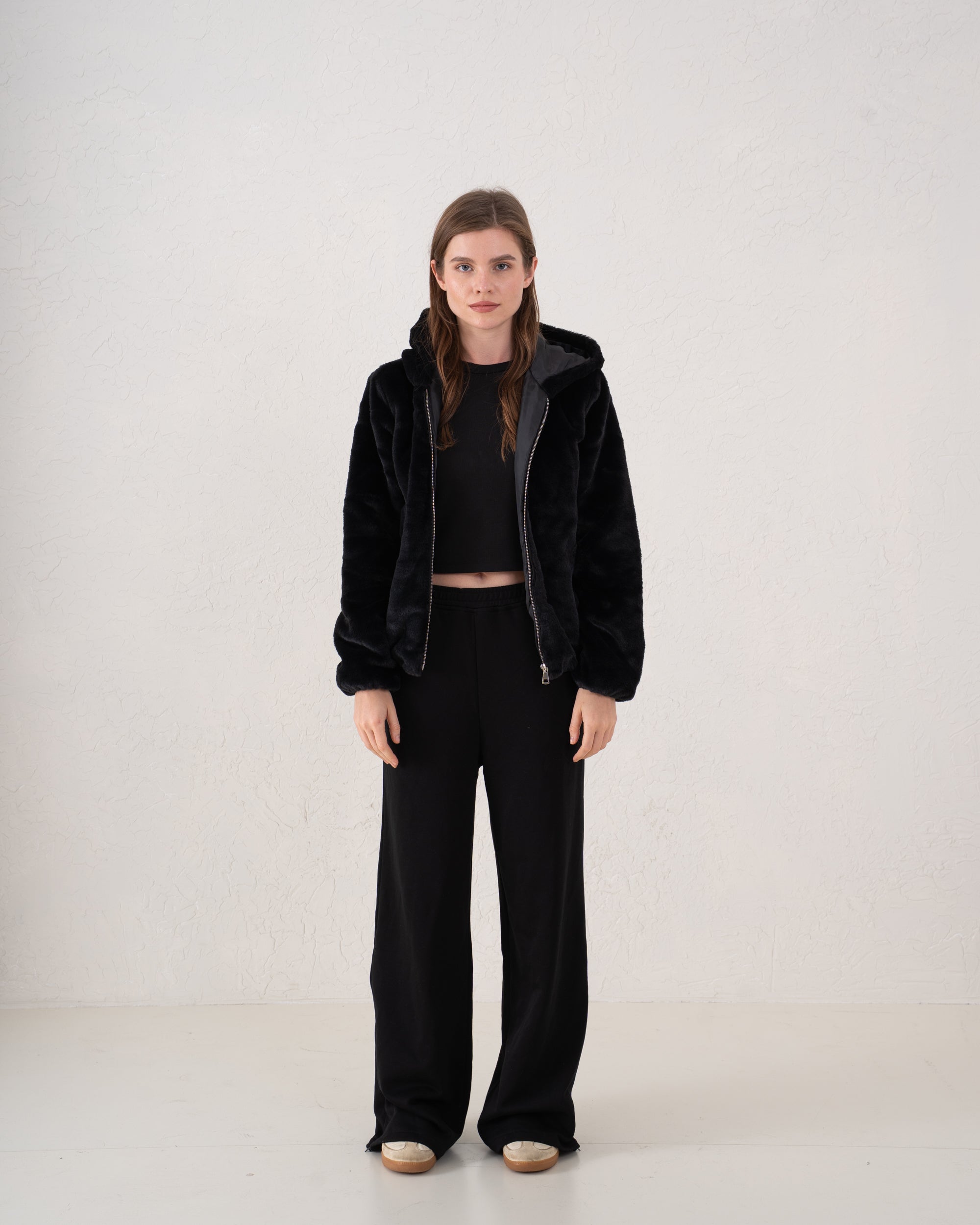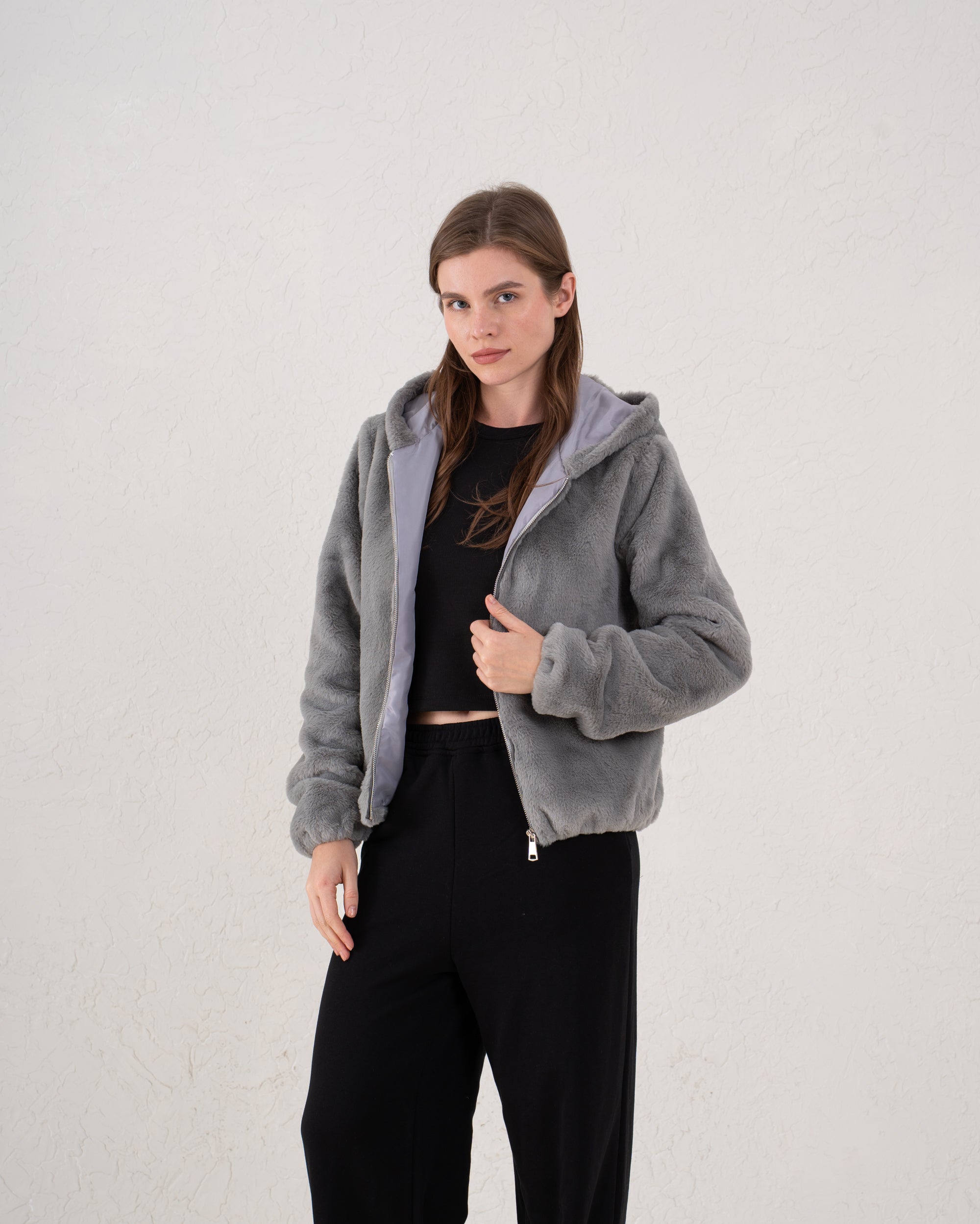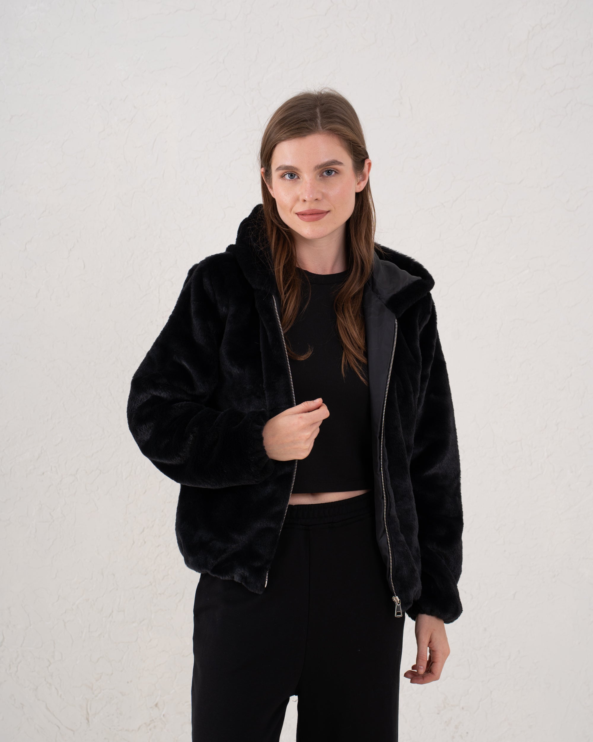 A luxuriously soft faux fur jacket designed for warmth and effortless style. Featuring a relaxed silhouette with a cozy hood and full zip front, it’s the ultimate winter essential for chic comfort.