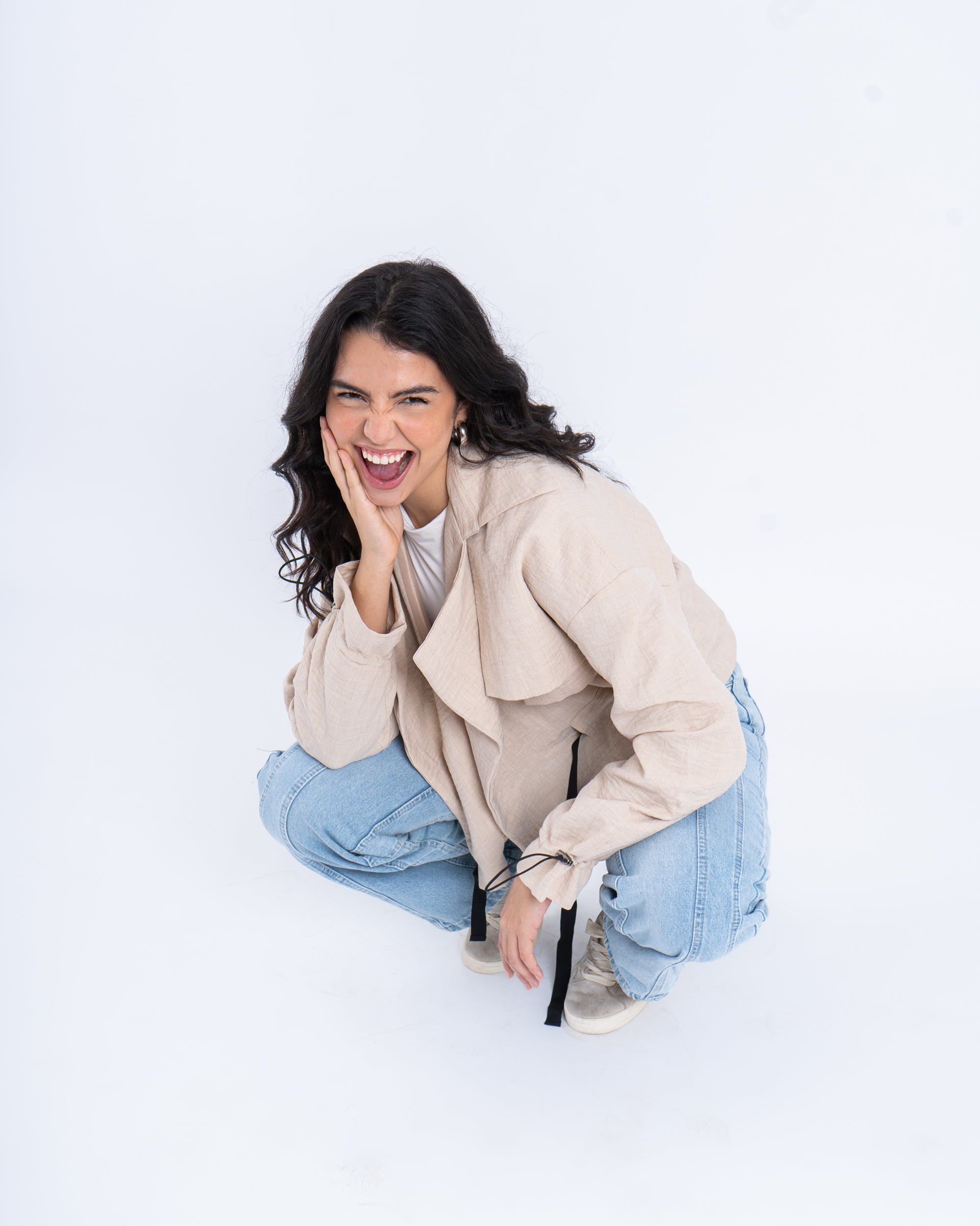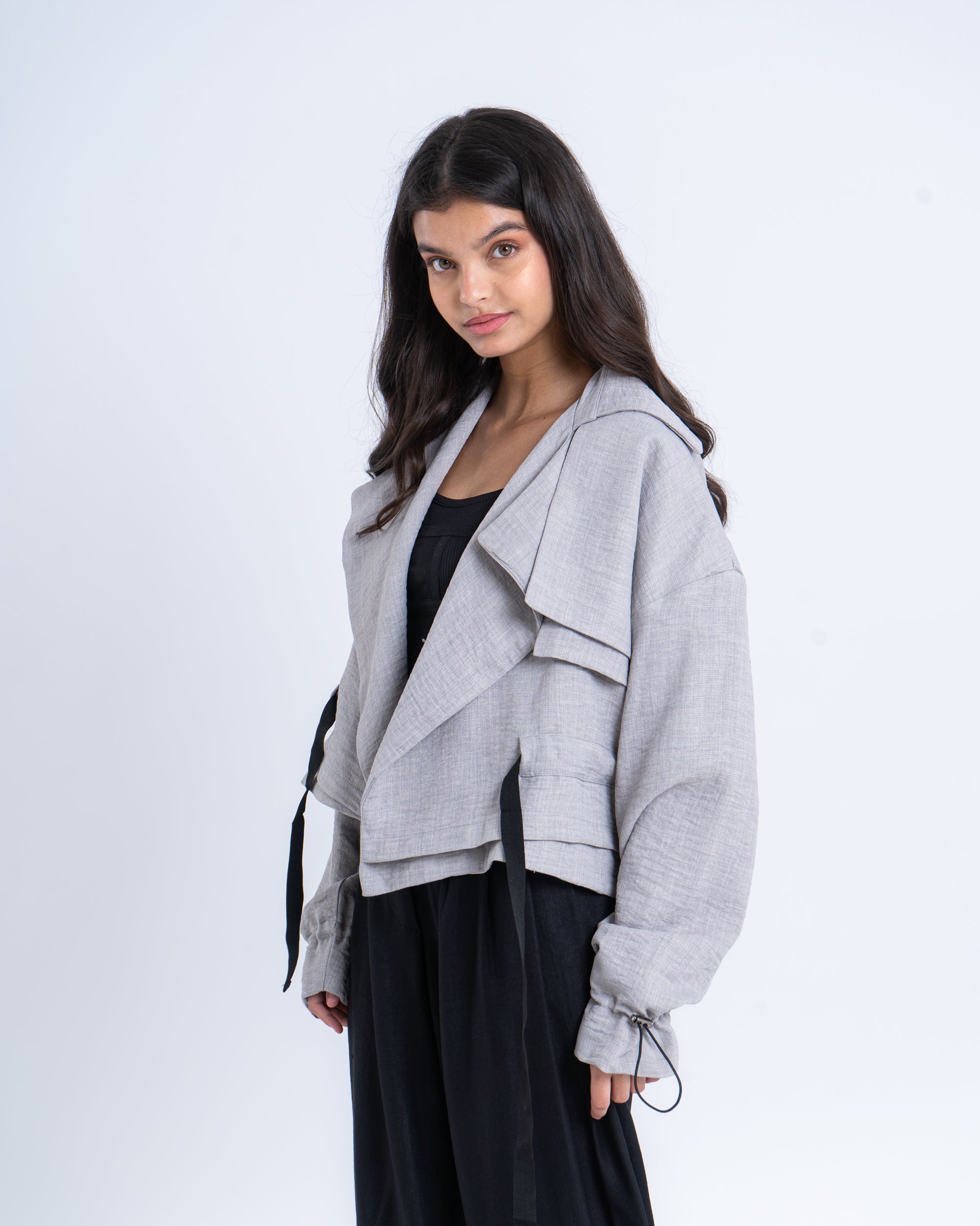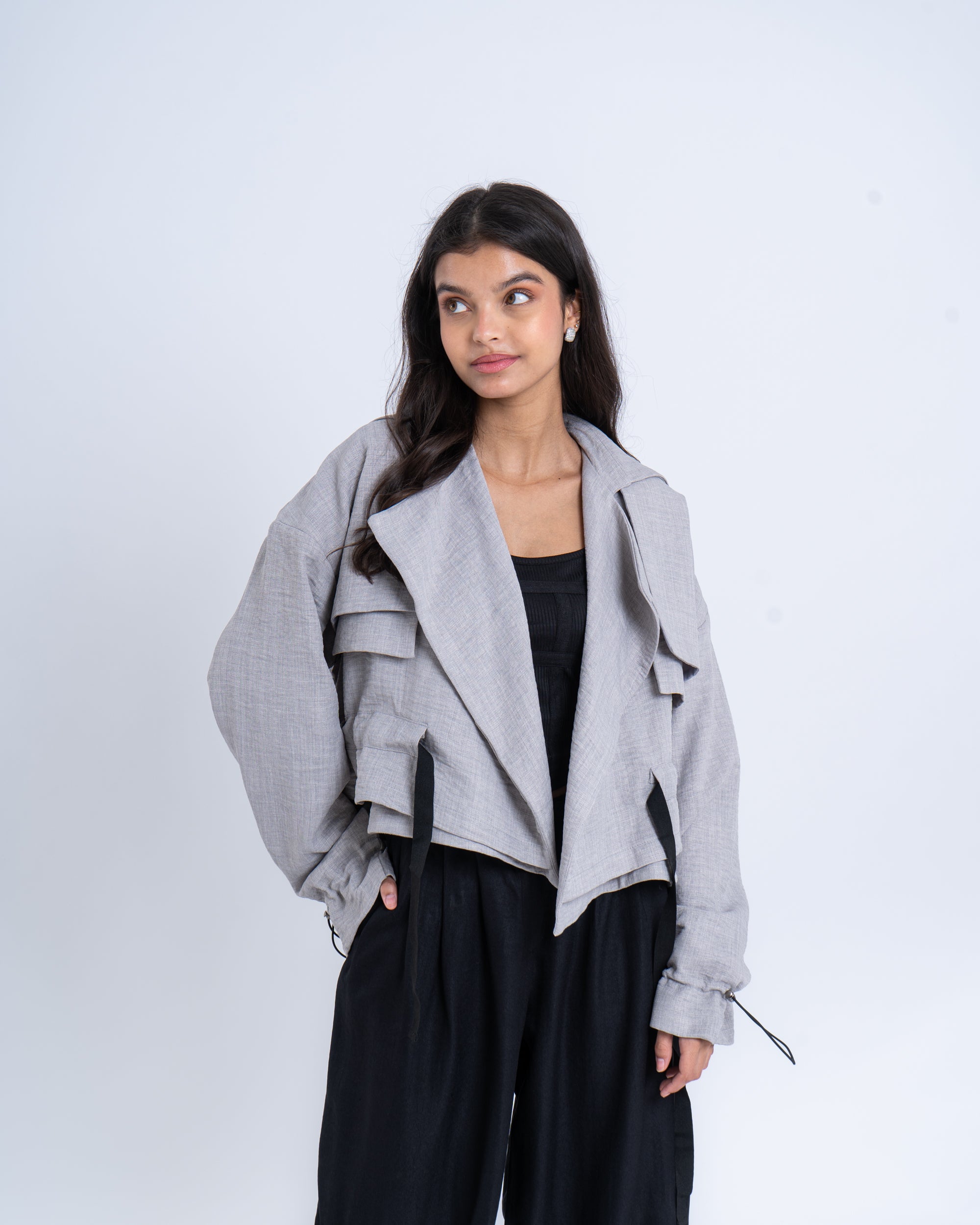 Elevate your style with this chic cropped trench jacket. Made from lightweight linen fabric, it features a layered design for added sophistication and a belted waist to enhance your silhouette. The relaxed fit and loose sleeves add an effortless touch to this stylish piece, perfect for layering over your favorite outfits.