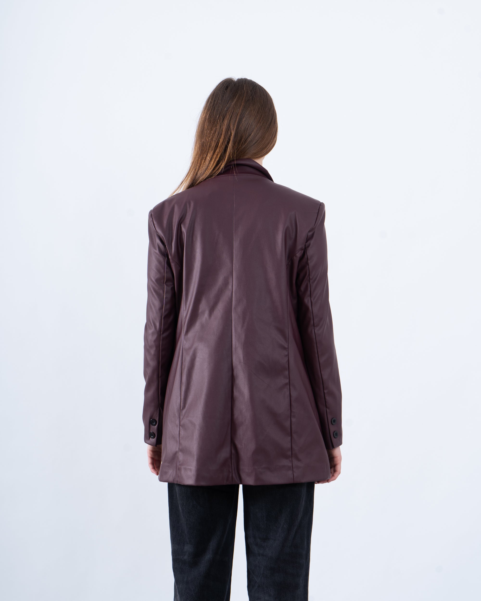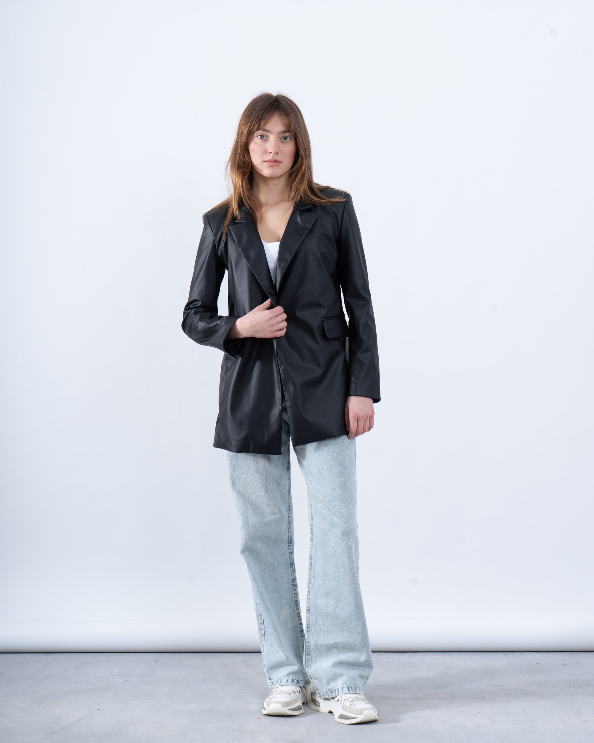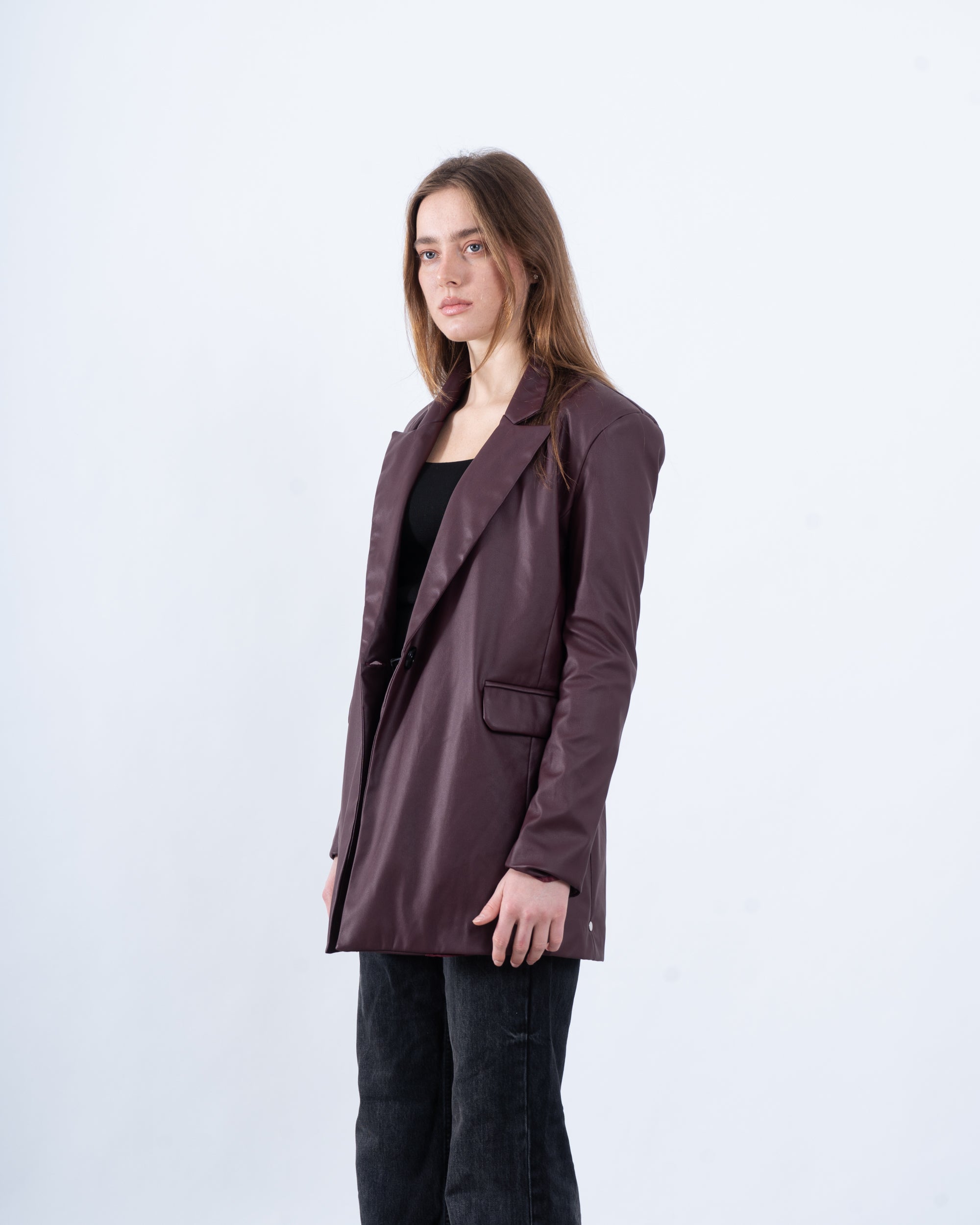 A must-have for a bold and polished look, this faux leather blazer adds an edgy touch to your outfit. Featuring a single-button closure, notched lapel, and a structured silhouette, it’s perfect for both casual and dressed-up moments.
