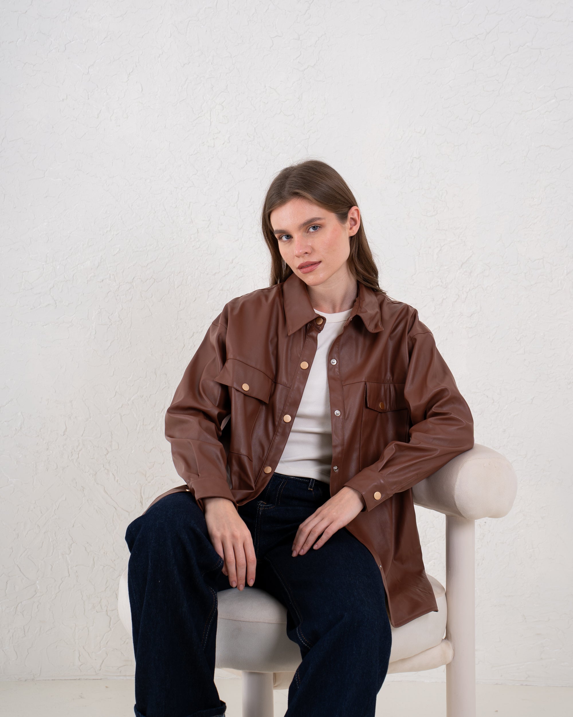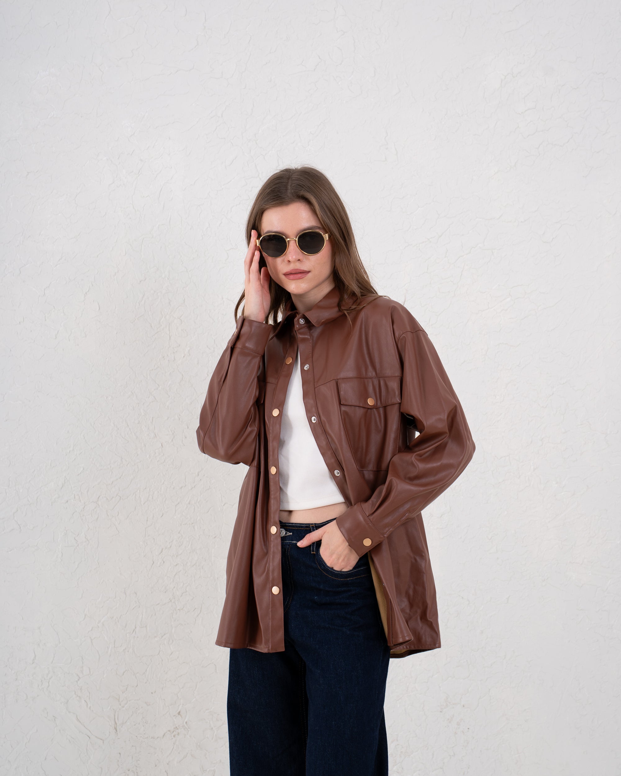 A sleek oversized faux leather overshirt designed to elevate everyday looks with a polished, effortless edge.