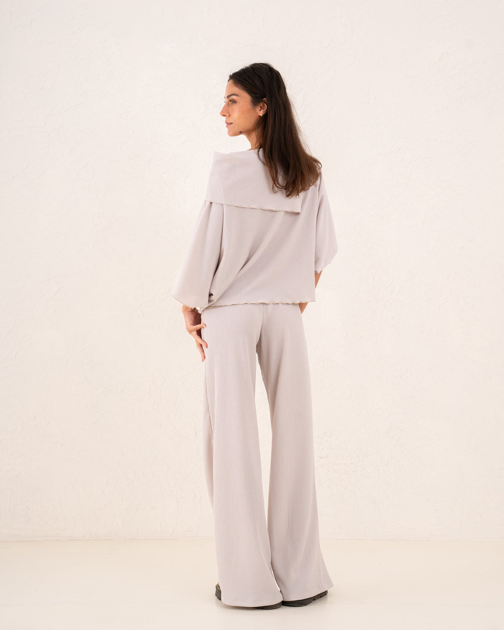 Style it with the matching crushed pants for a coordinated set, or pair it with wide-leg trousers or jeans for an easy chic look.