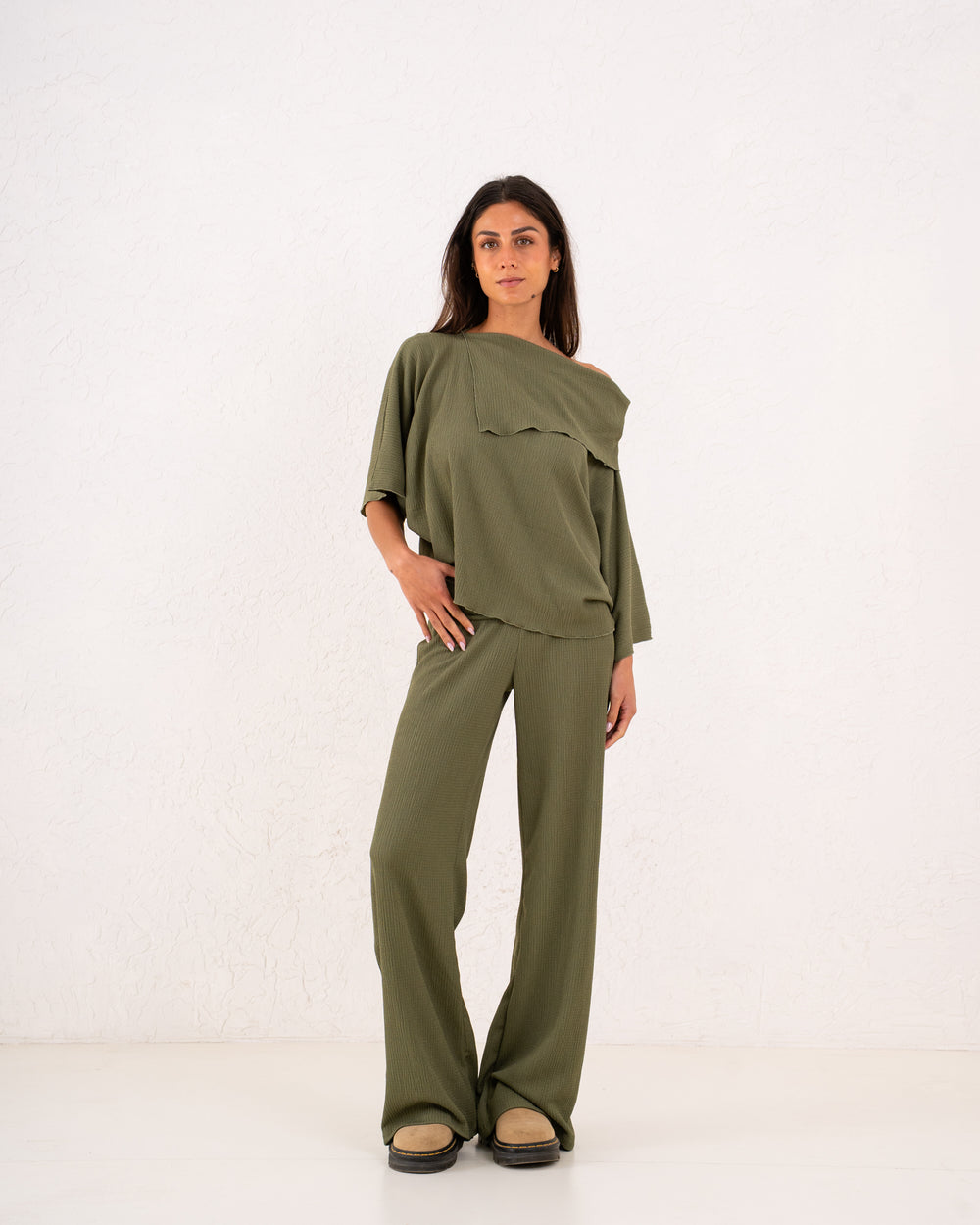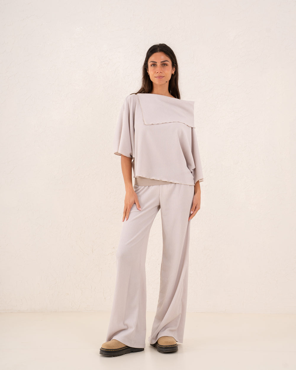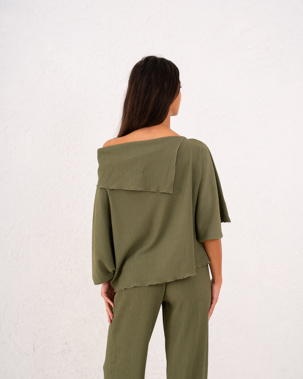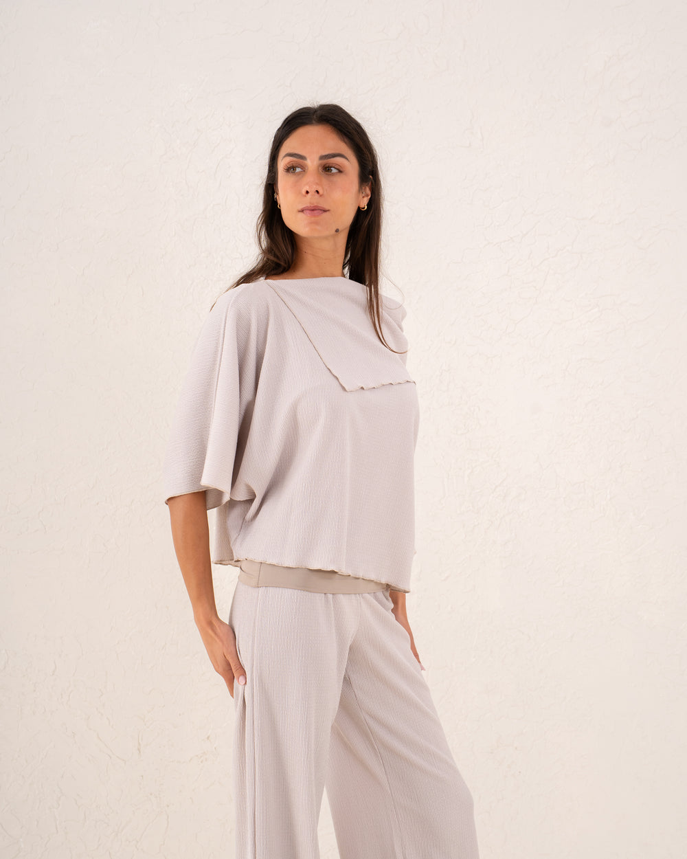 A relaxed asymmetric top designed with a soft drape and modern silhouette, offering effortless elegance for day-to-night wear.