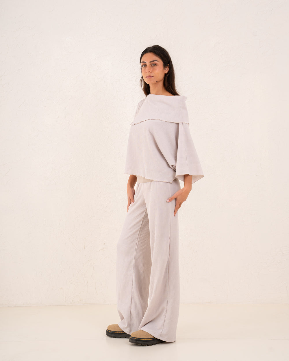 Wide neckline that can be styled slightly off-shoulder