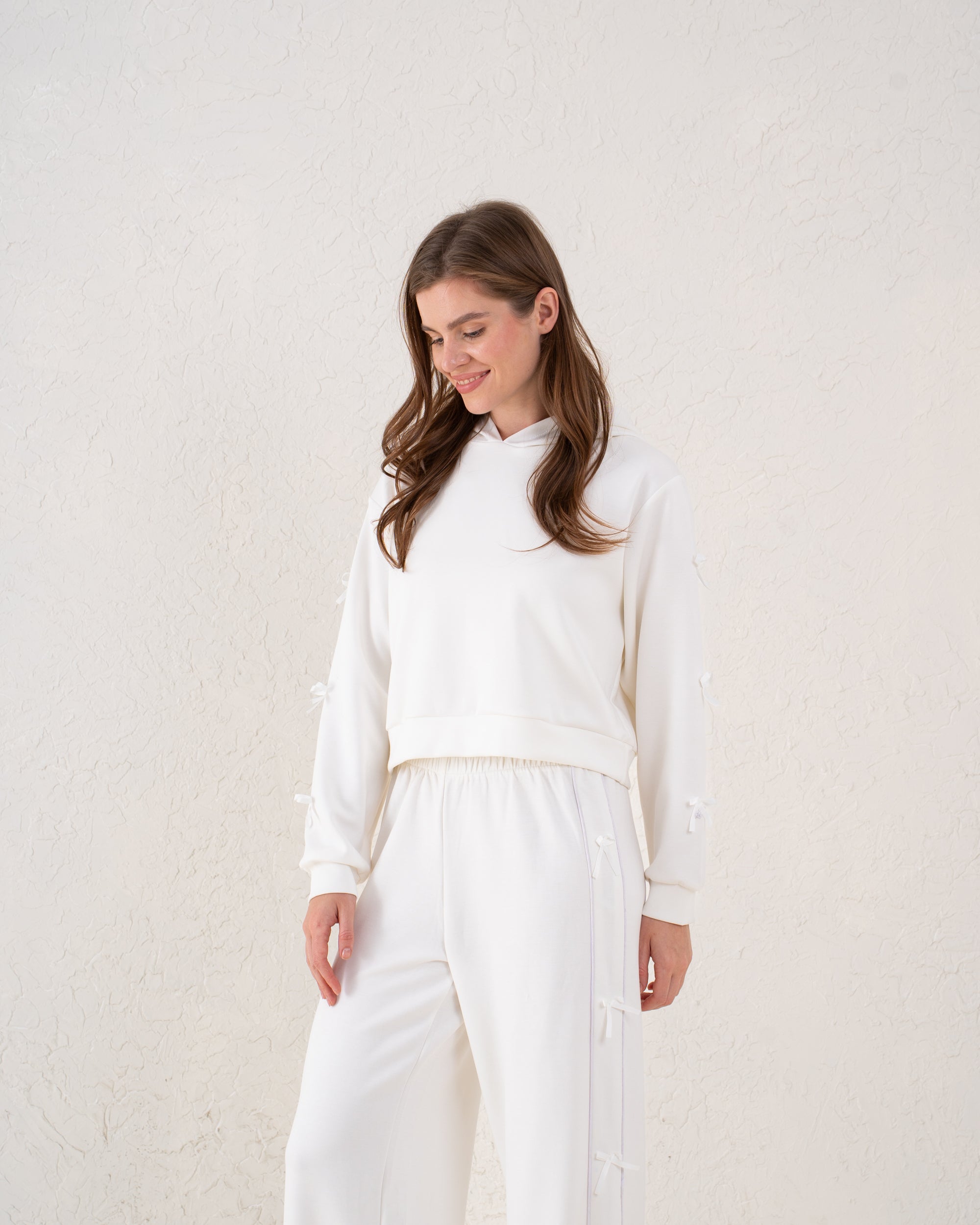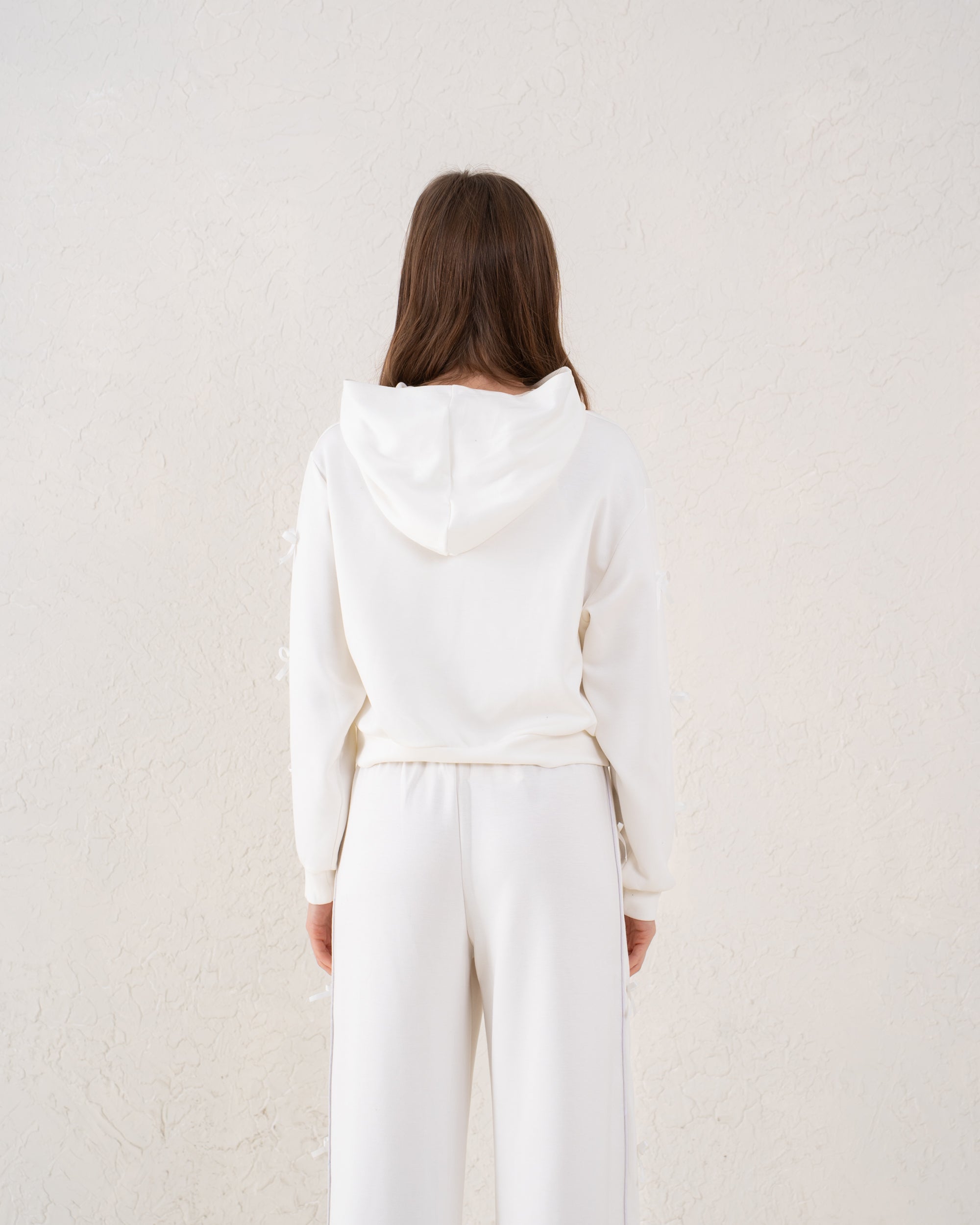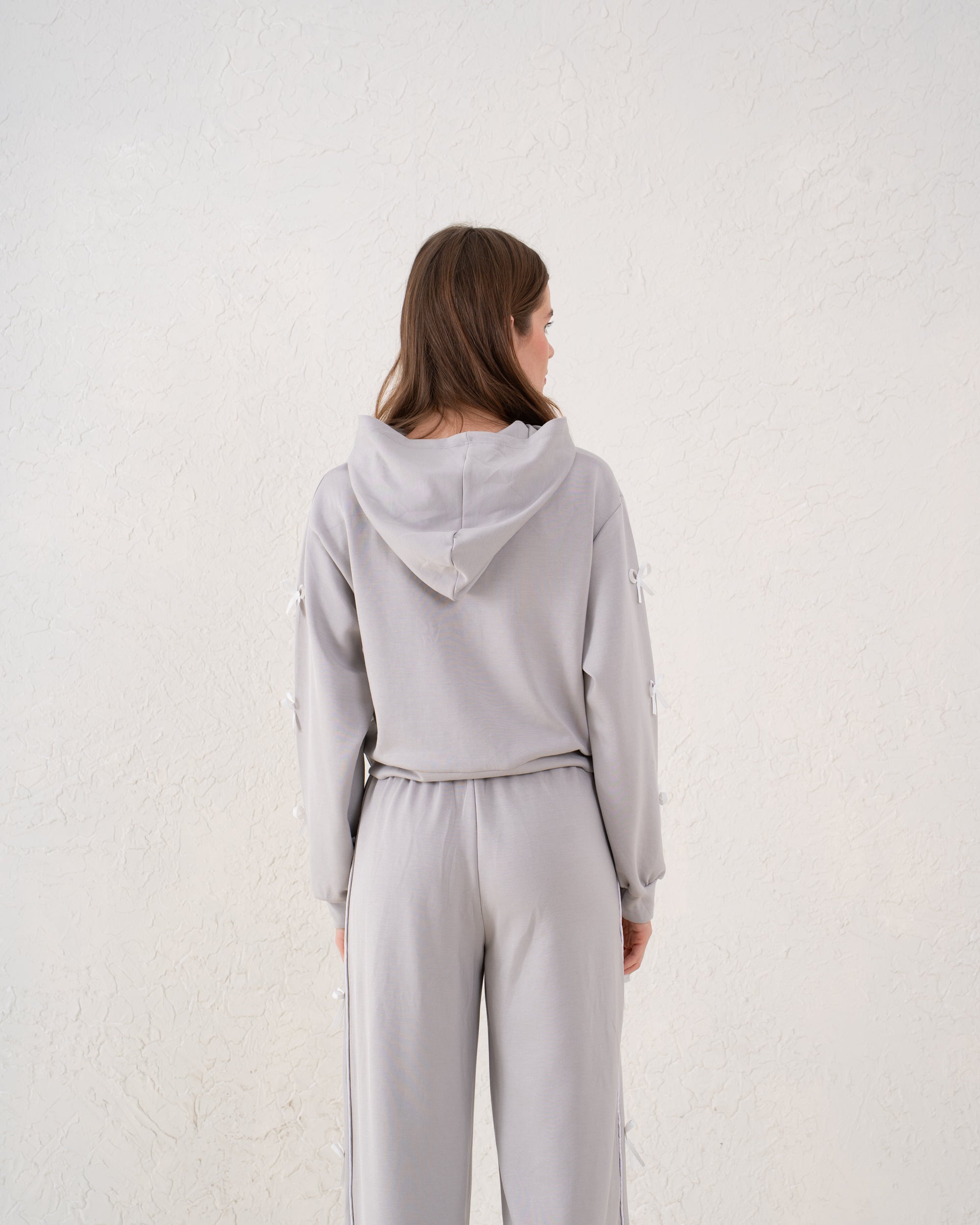 A soft jersey hoodie designed with delicate bow trims along the sleeves for a feminine, playful touch. Lightweight and comfortable with a relaxed silhouette, perfect for matching moments.