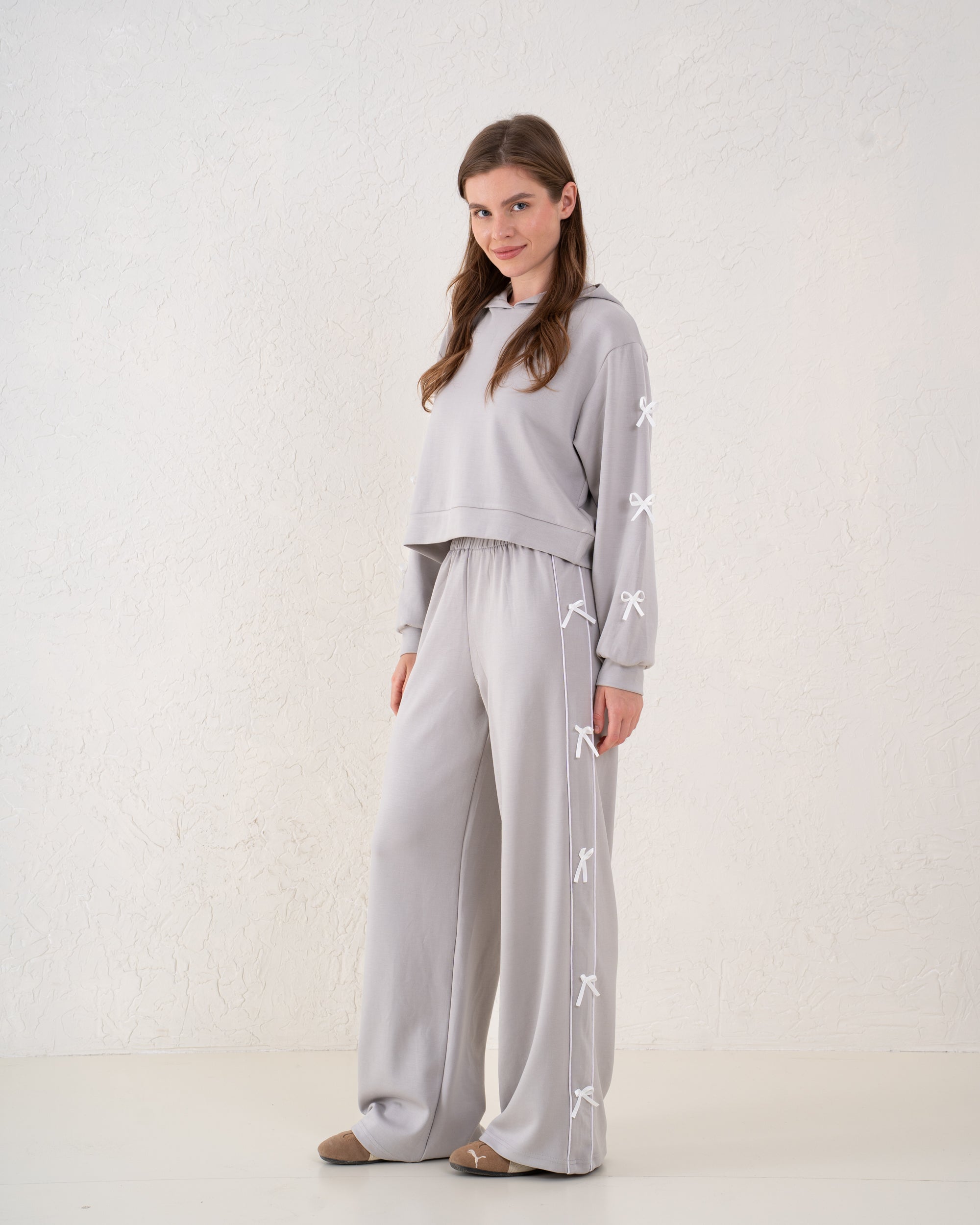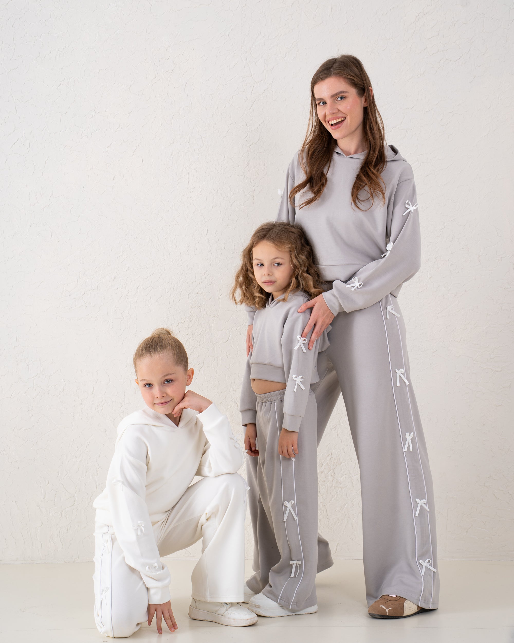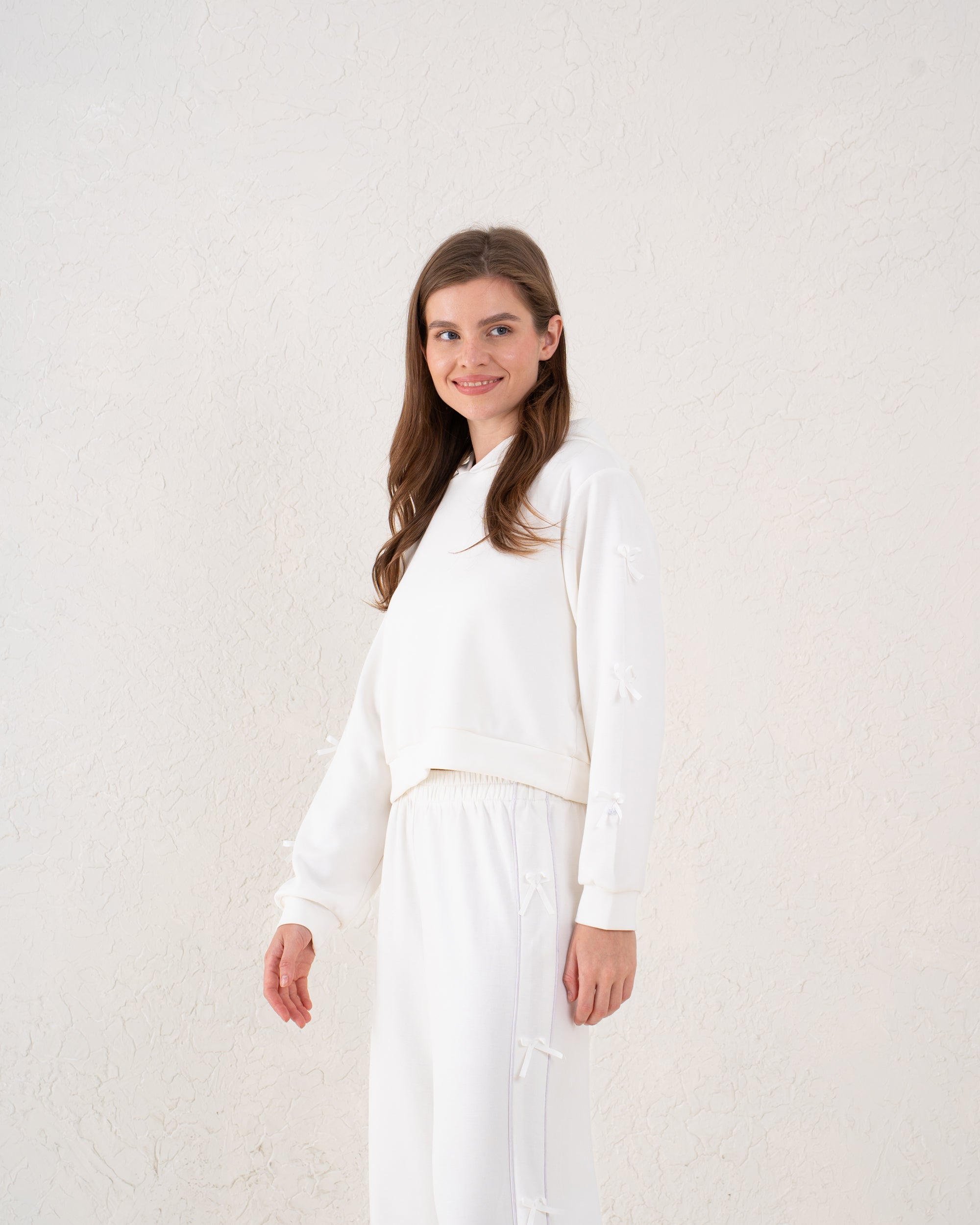 A soft jersey hoodie designed with delicate bow trims along the sleeves for a feminine, playful touch. Lightweight and comfortable with a relaxed silhouette, perfect for matching moments.