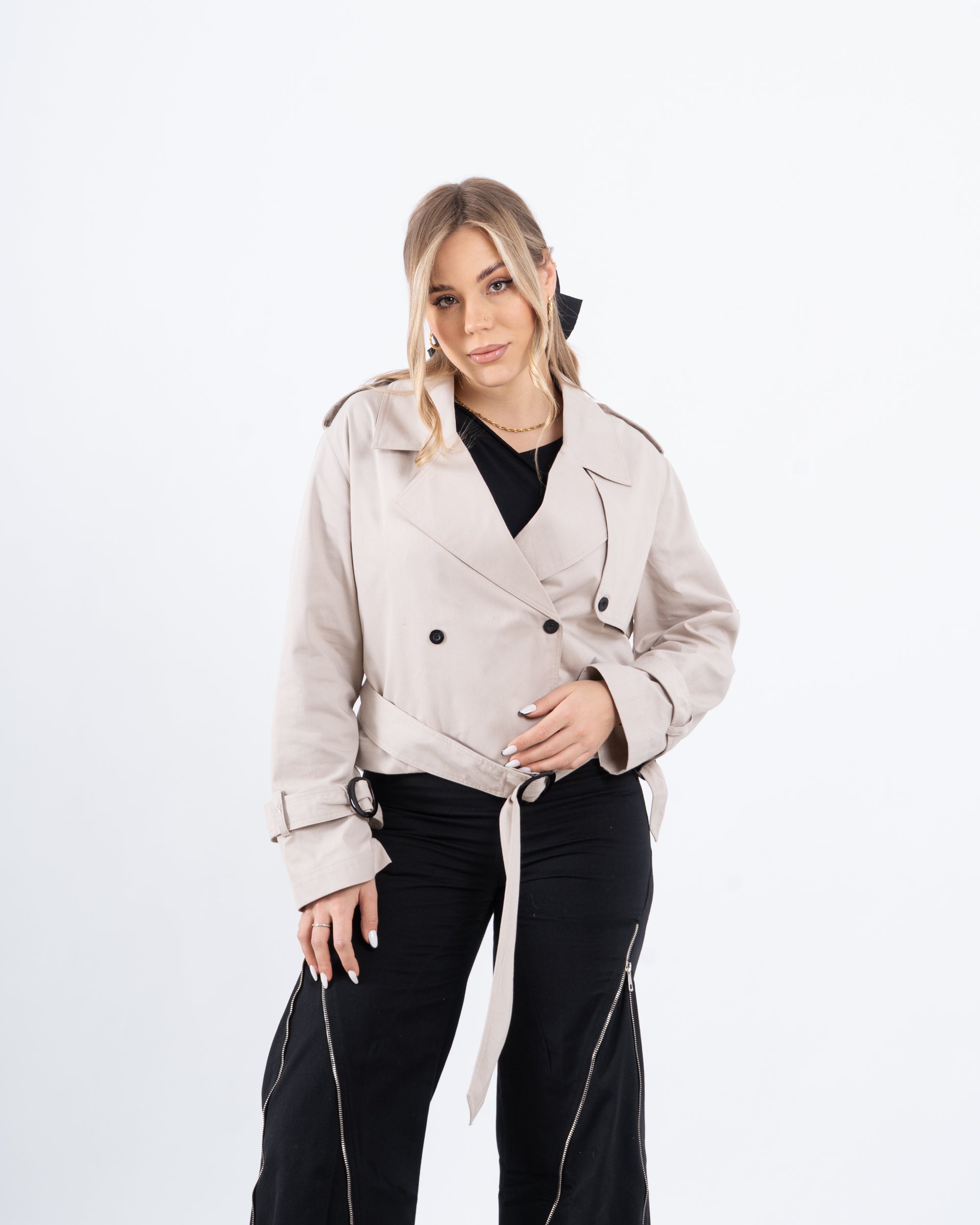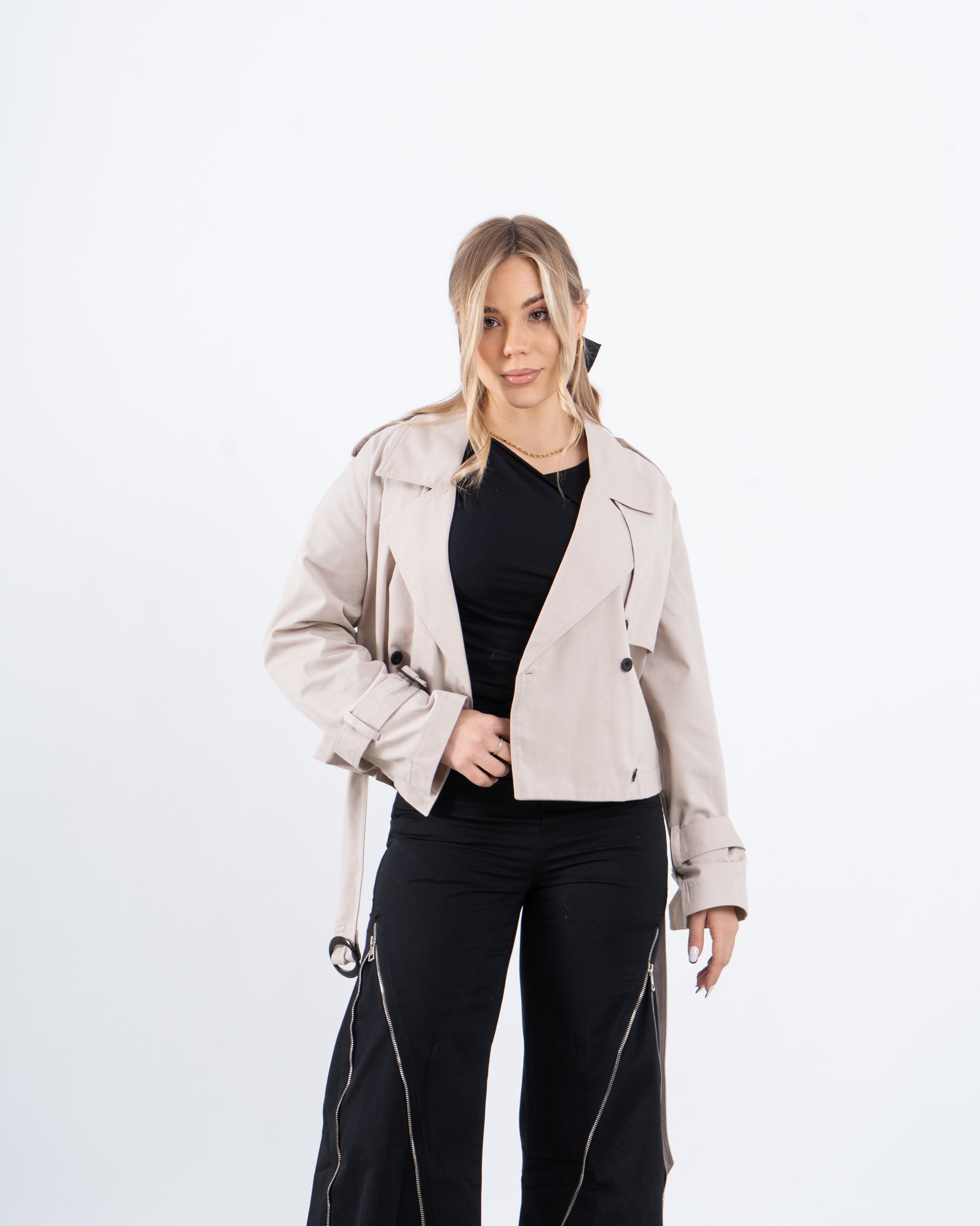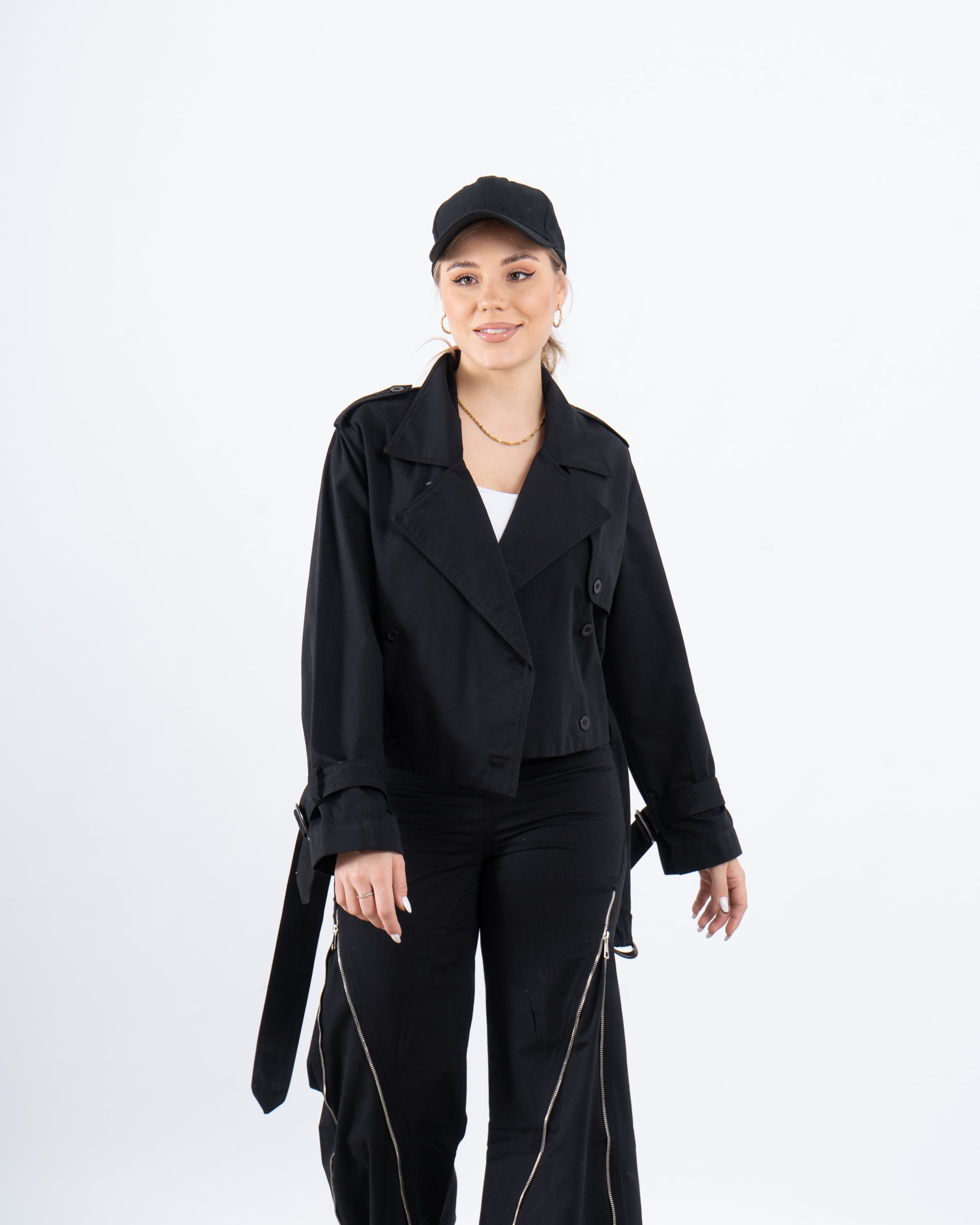 A modern twist on a timeless classic, this cropped trench jacket is the perfect blend of structure and style.
