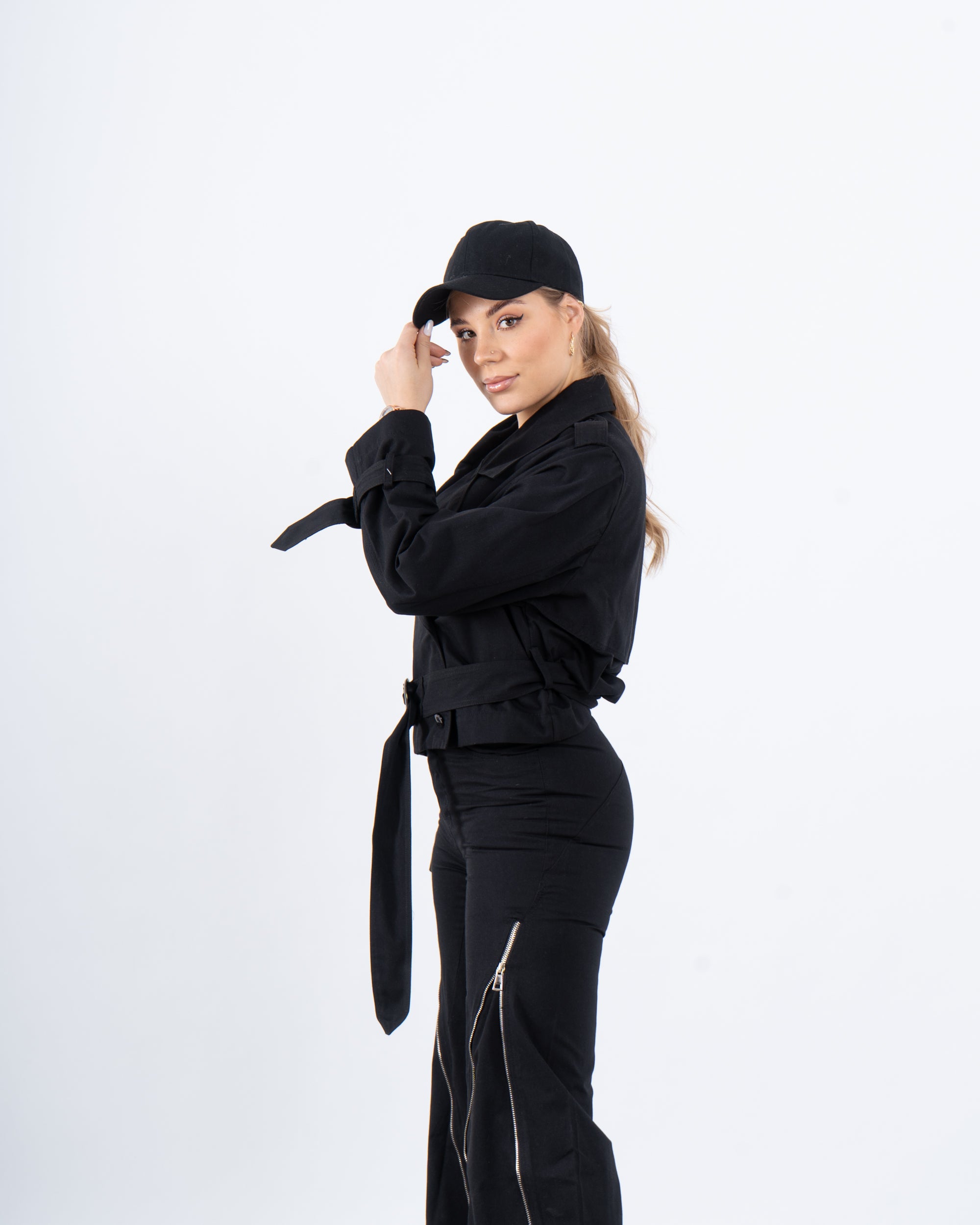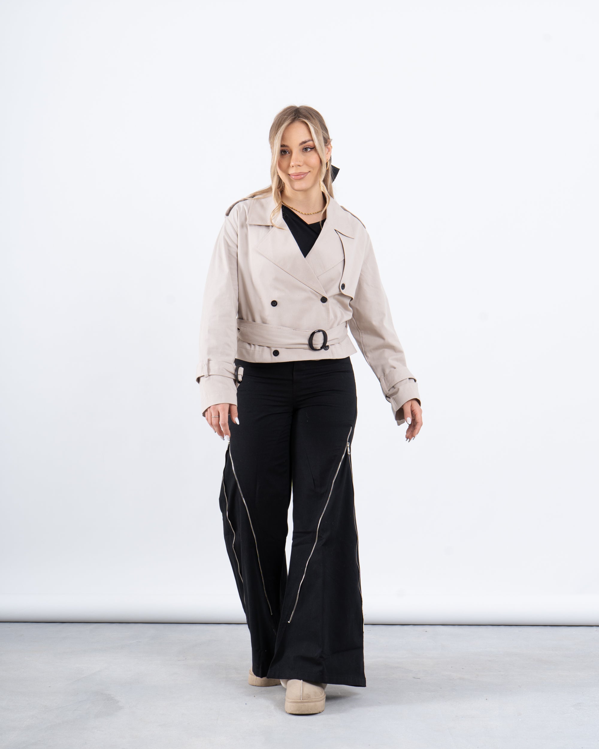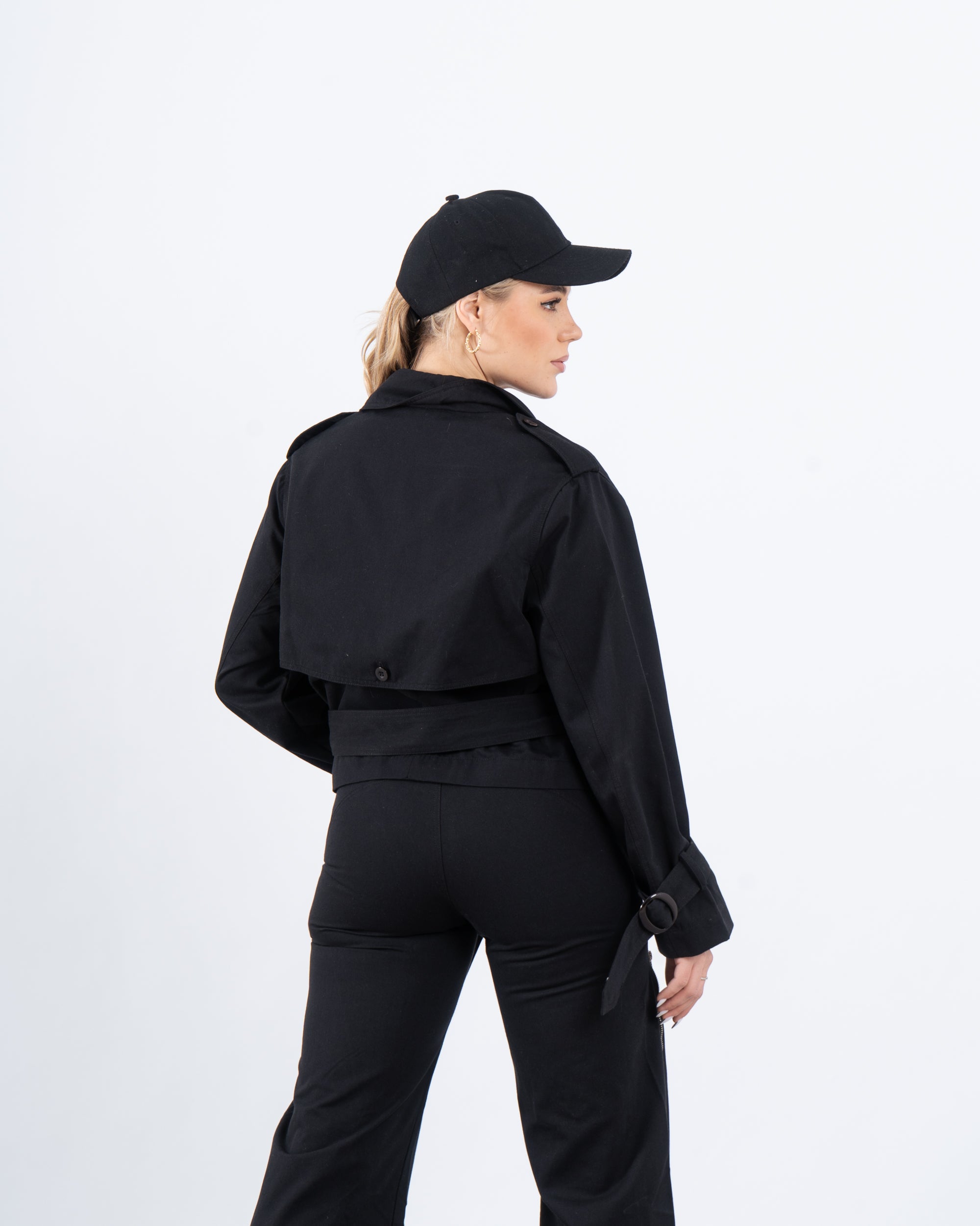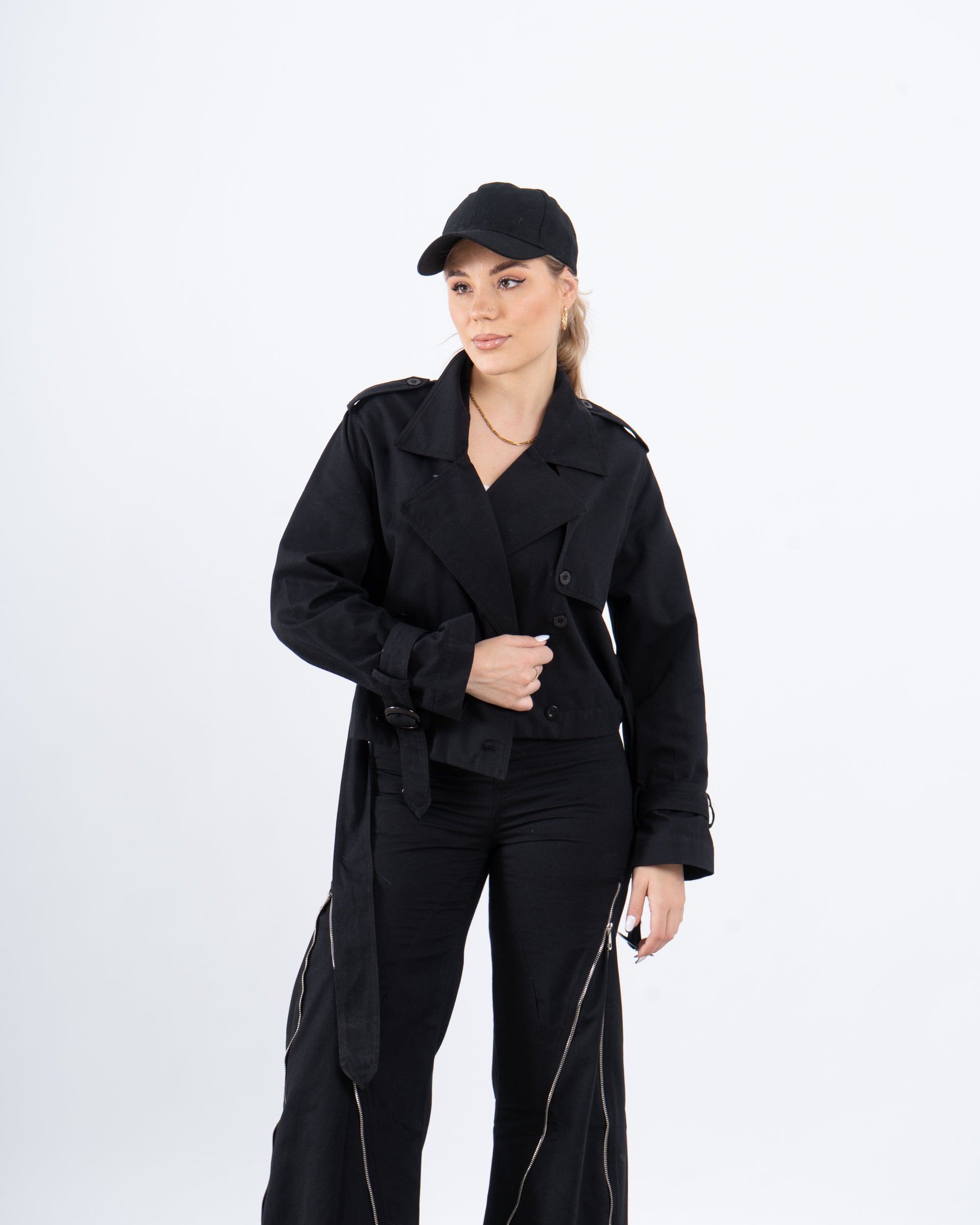 A modern twist on a timeless classic, this cropped trench jacket is the perfect blend of structure and style.