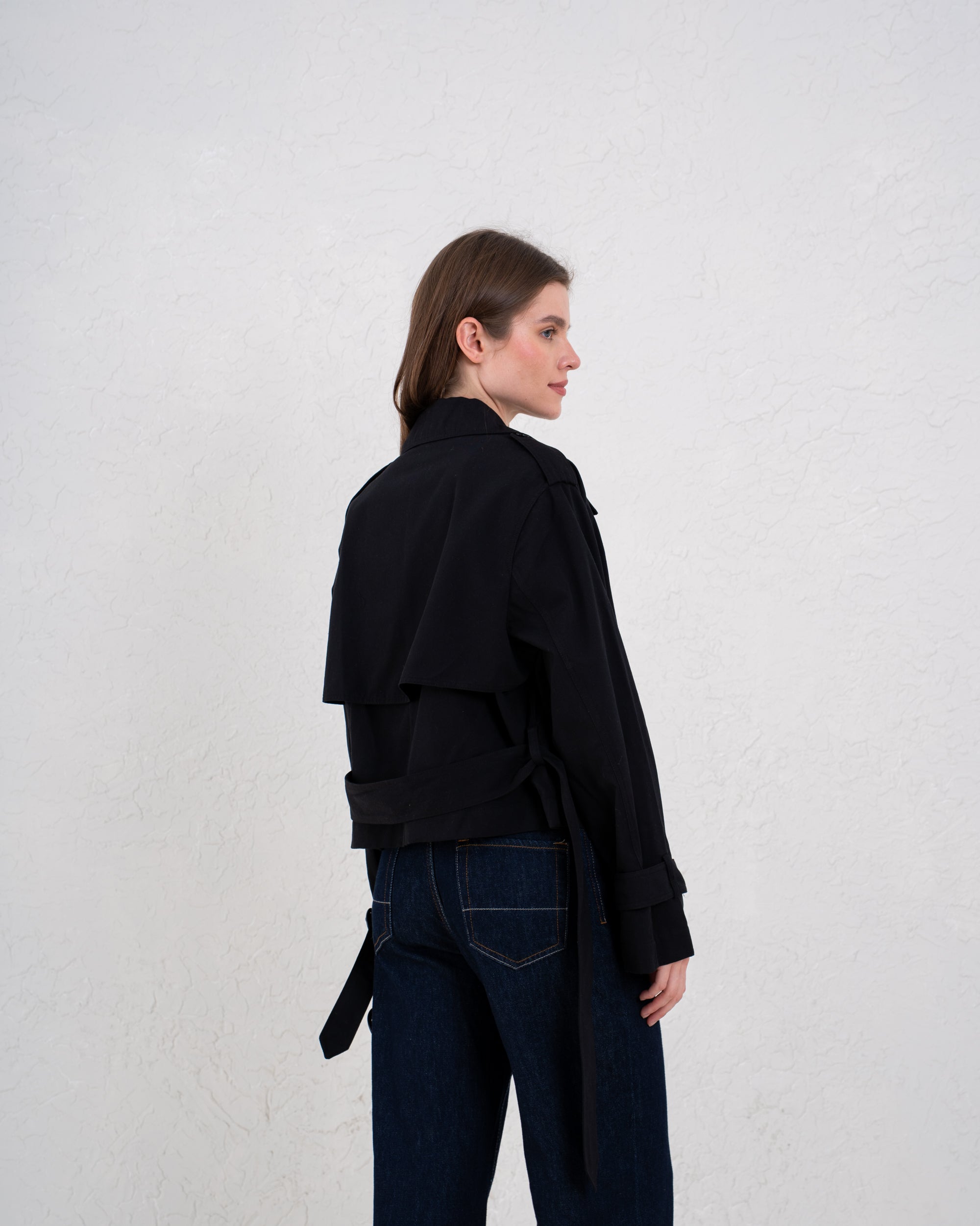 A modern cropped take on the classic trench — structured, chic, and perfect for elevating everyday outfits.