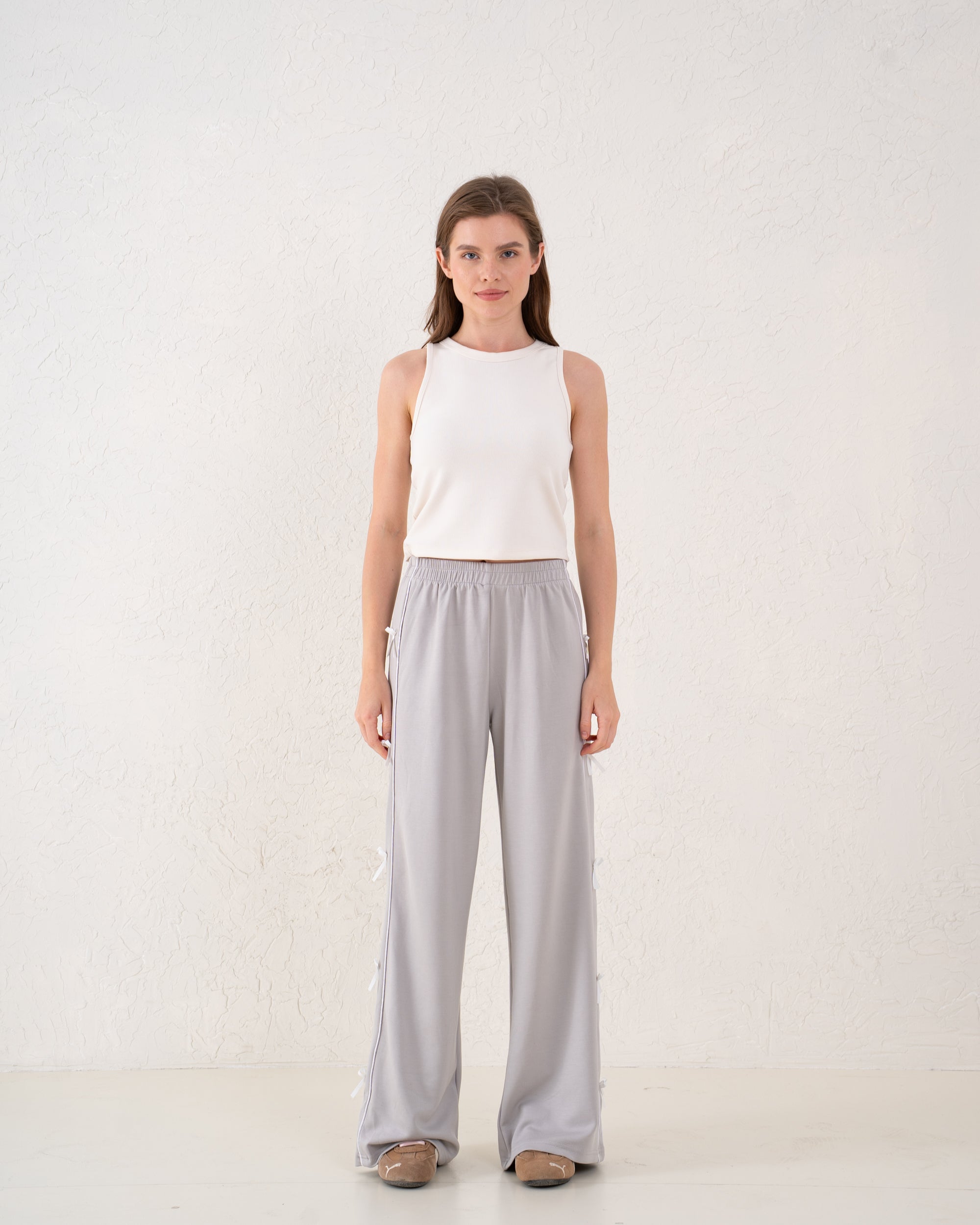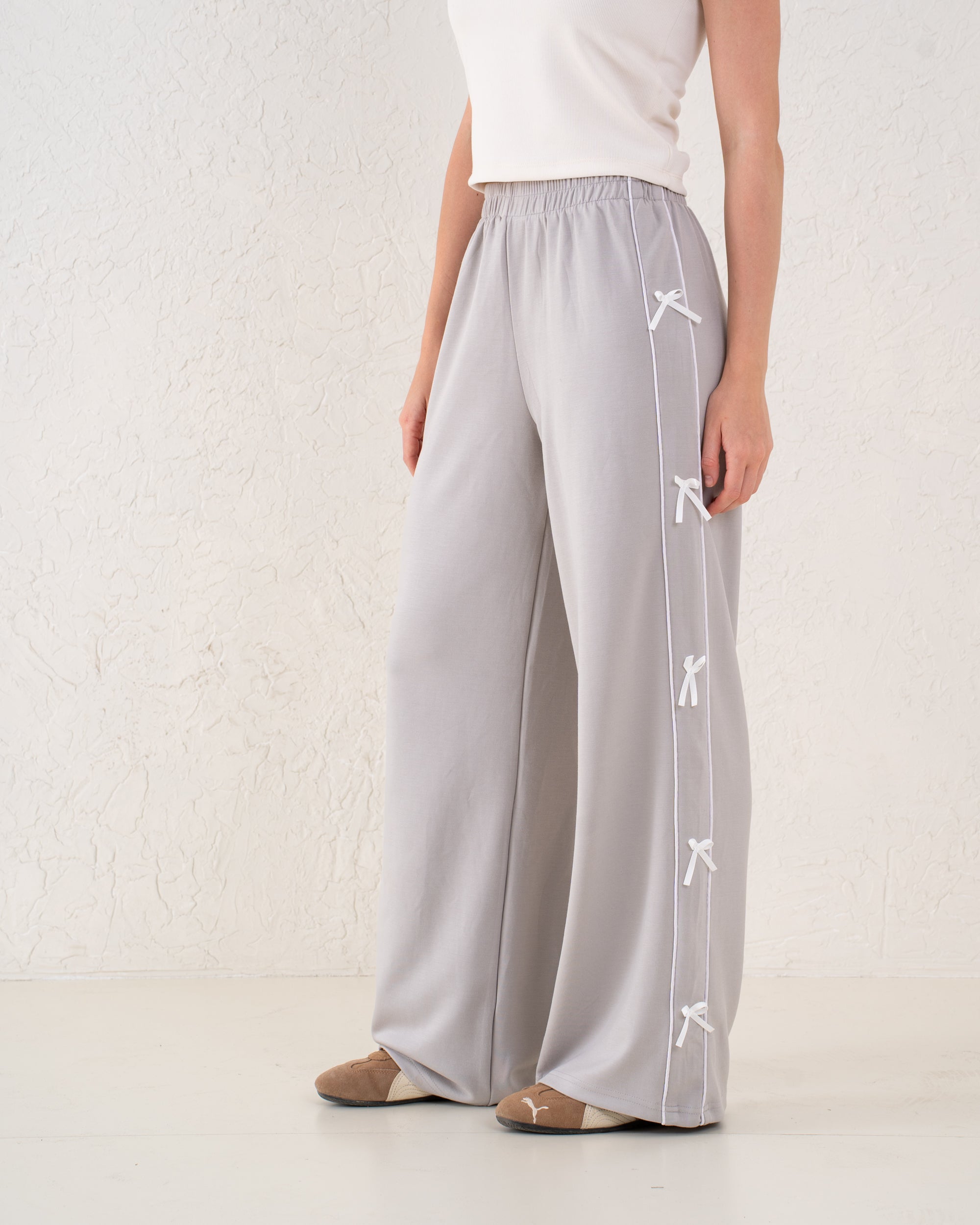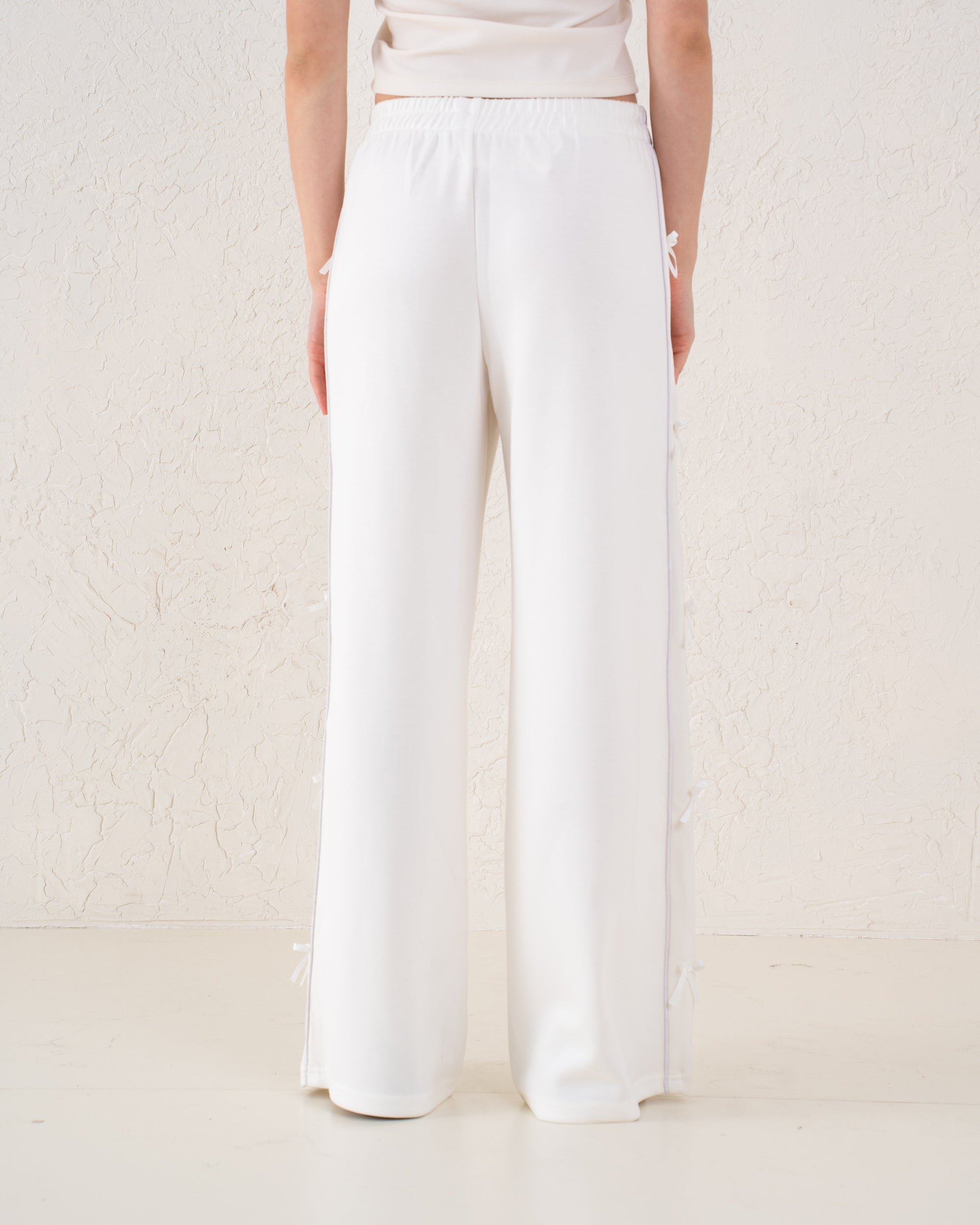 Wide-leg jersey pants with charming bow details running down the sides. Easy to wear and ultra-comfortable, perfect for coordinated sets or casual styling.