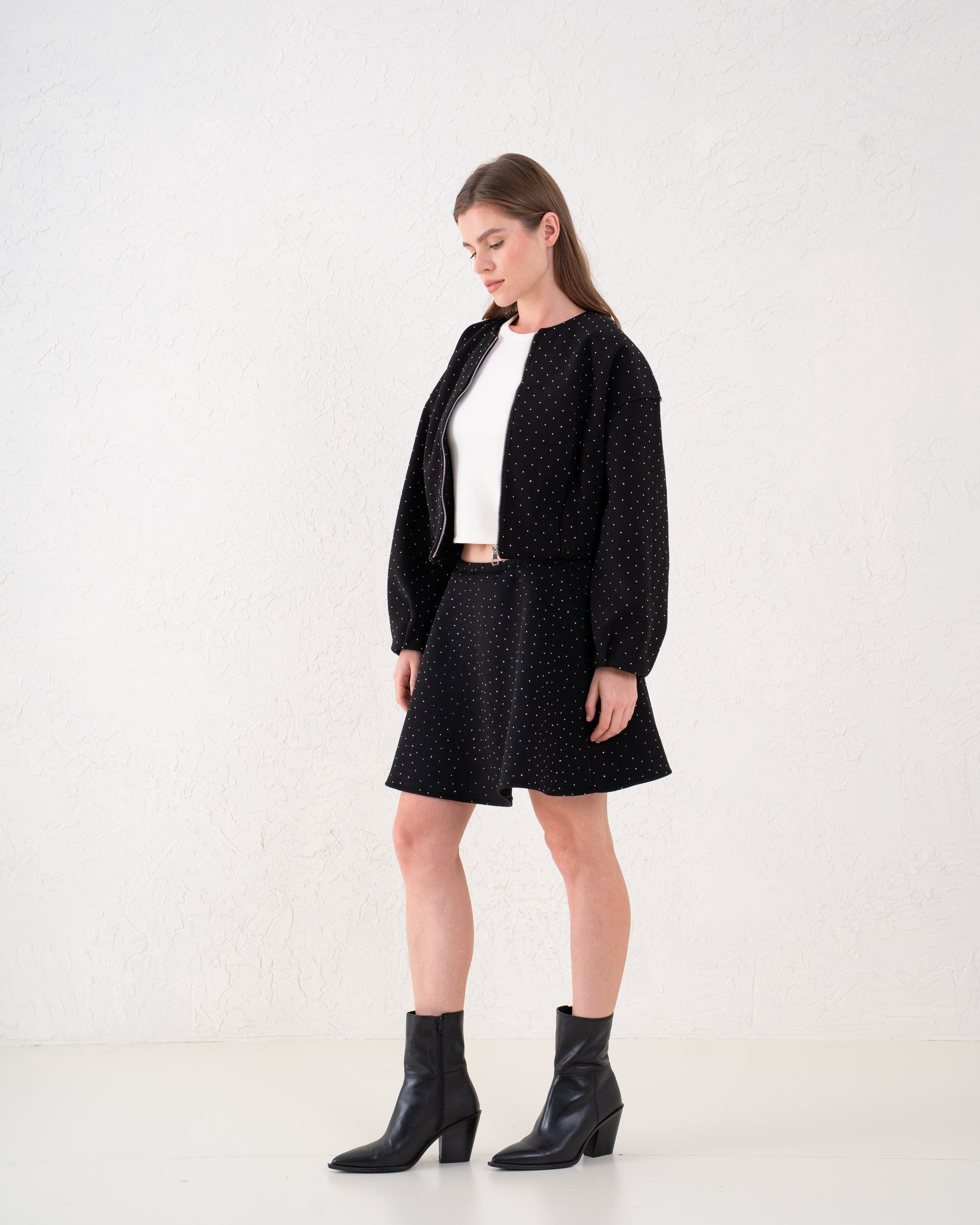 A classic A-line mini skirt with soft sparkle detailing for a touch of glamour. Flattering and easy to style, it’s the perfect piece for festive looks or coordinated outfits.