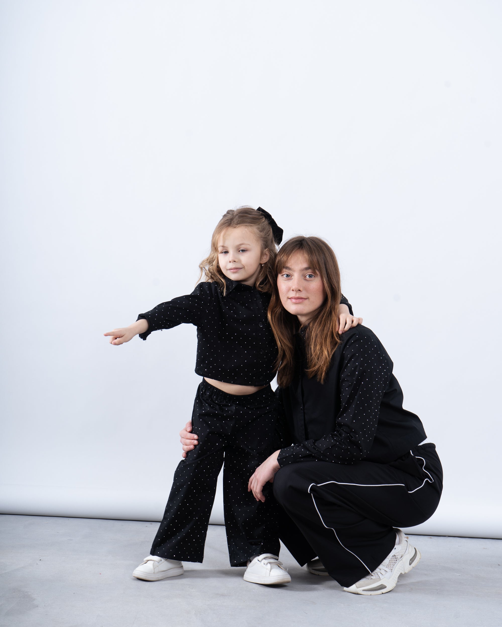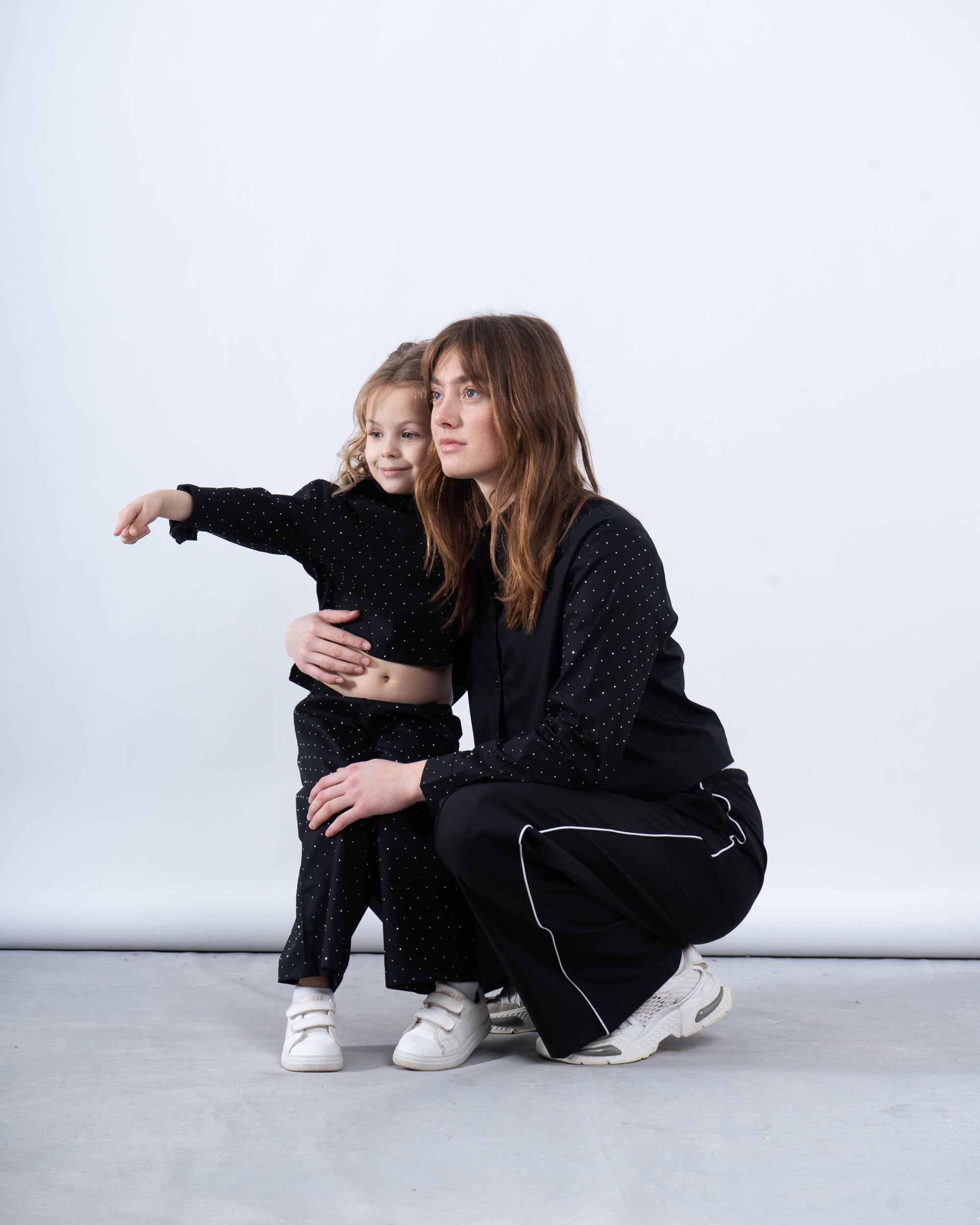 A chic and elevated essential, this sparkling button-up shirt adds a subtle shimmer to any look, perfect for twinning with your little one.
