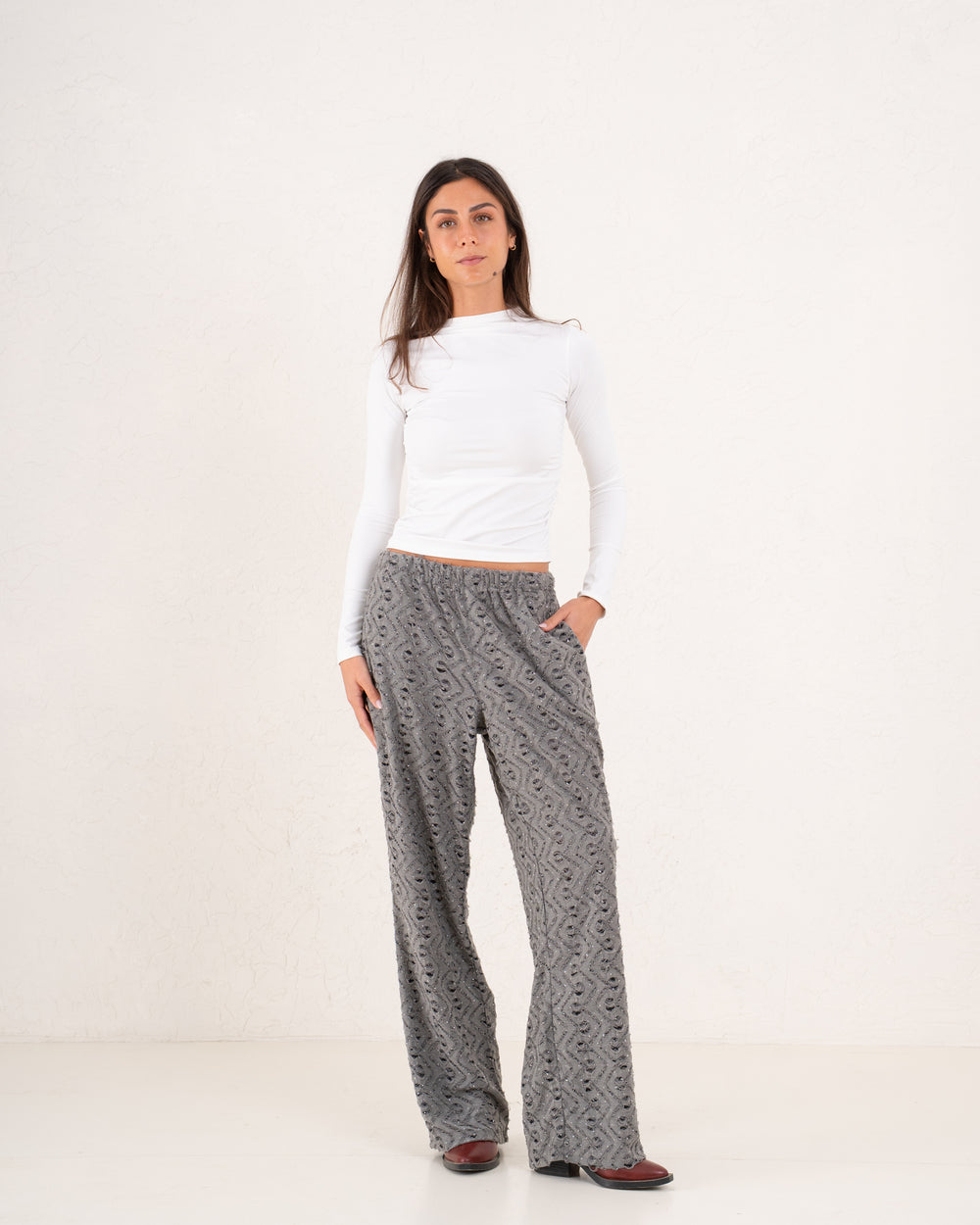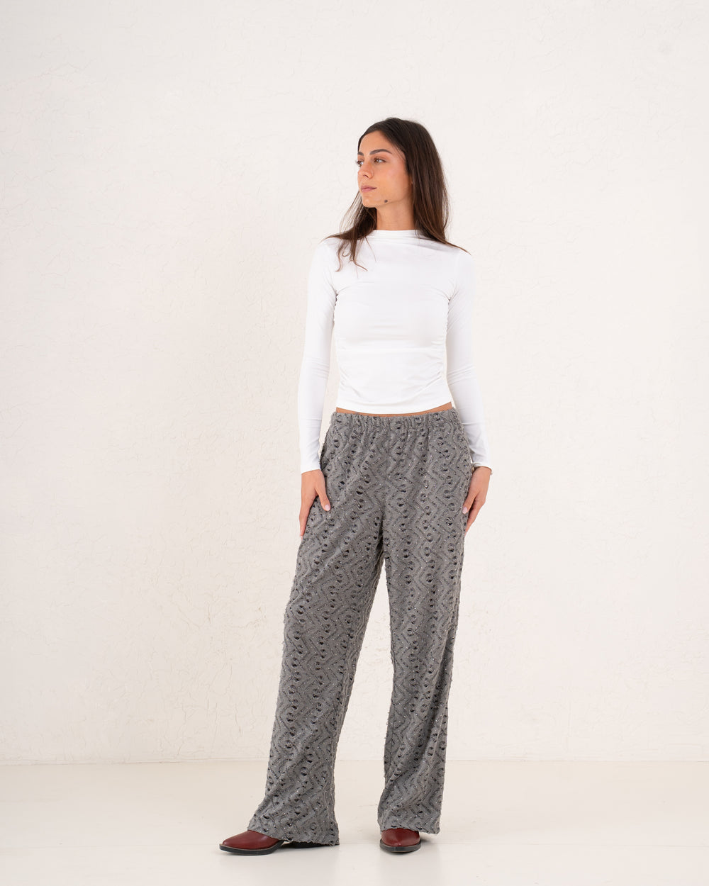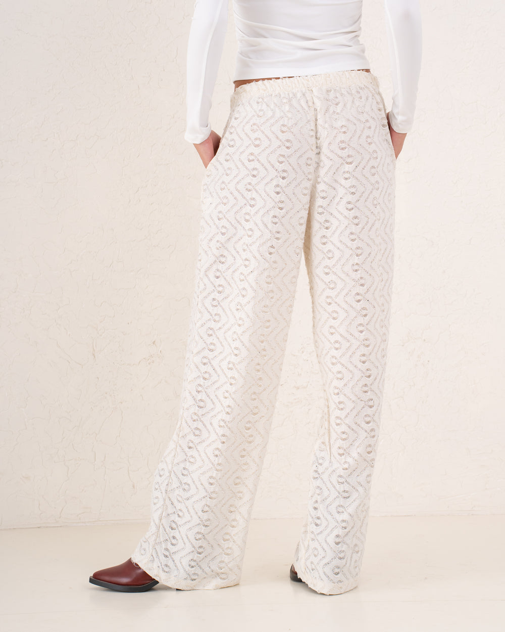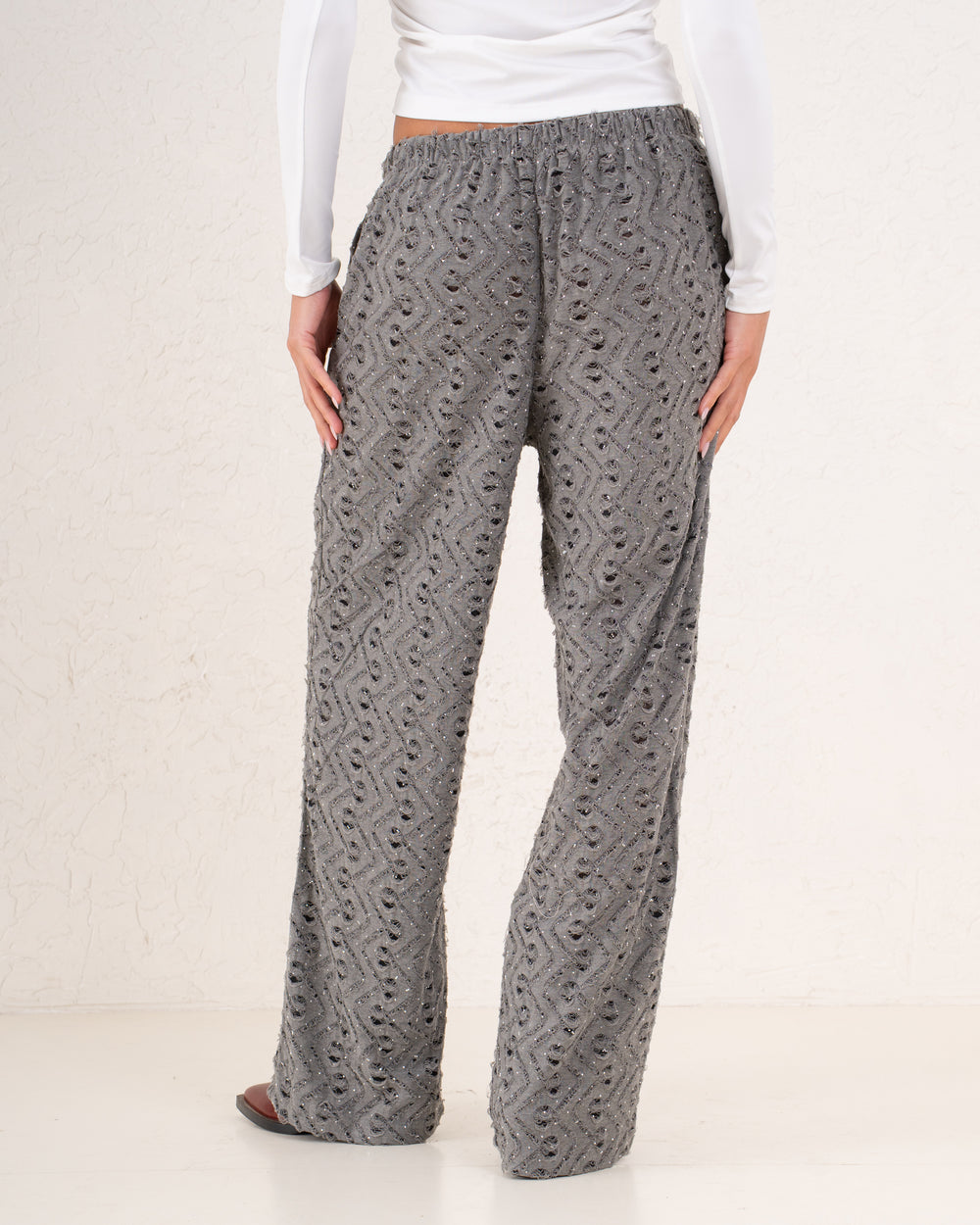 A modern sparkles textured pant designed with a relaxed wide-leg silhouette and subtle shimmer pattern.