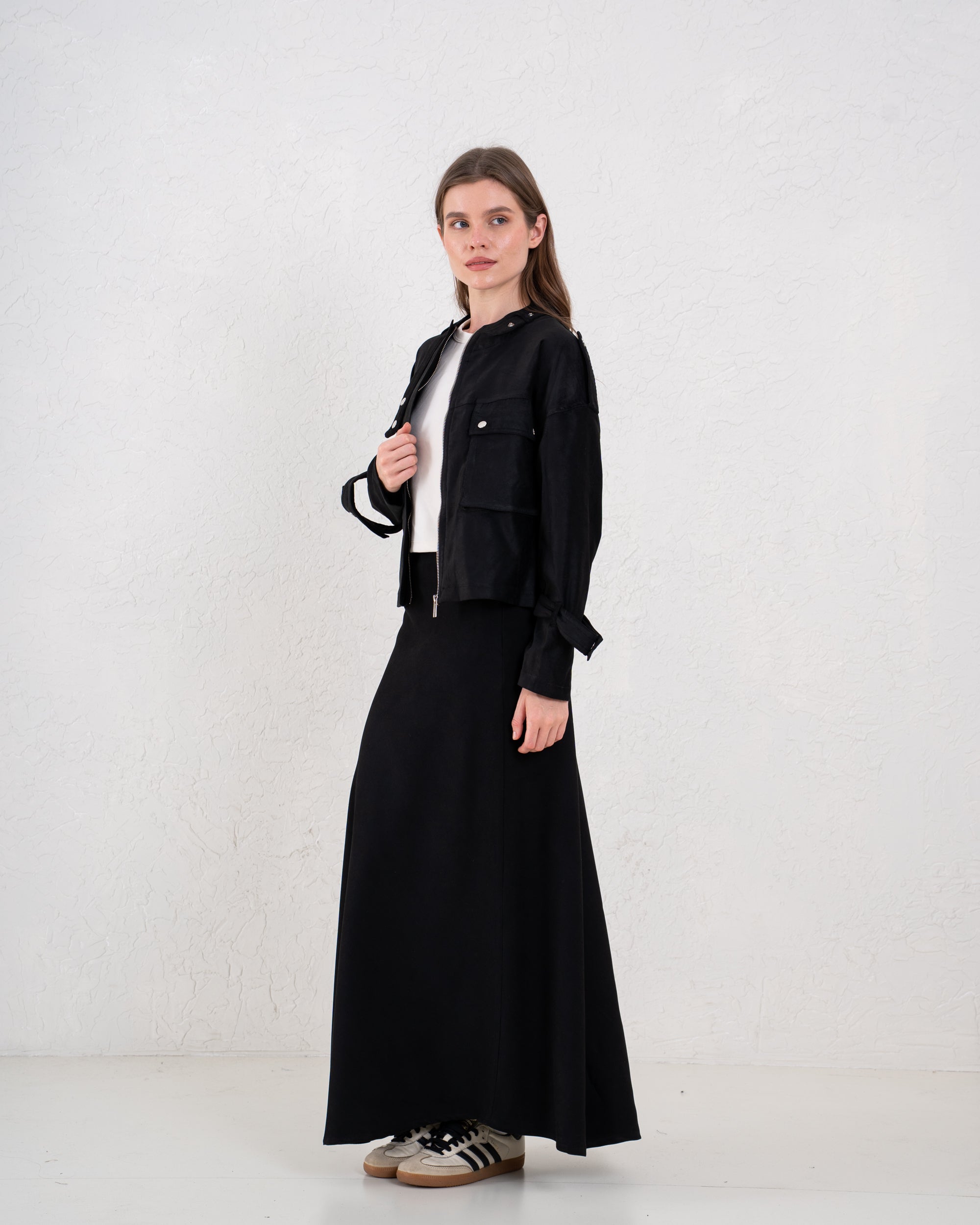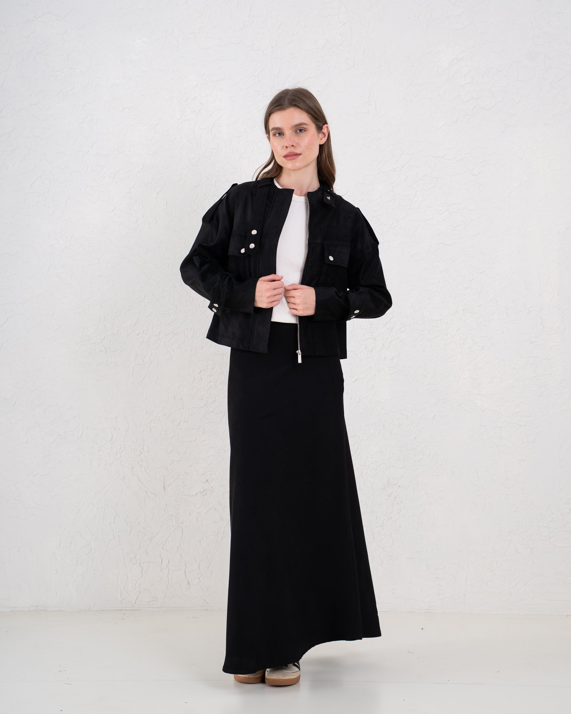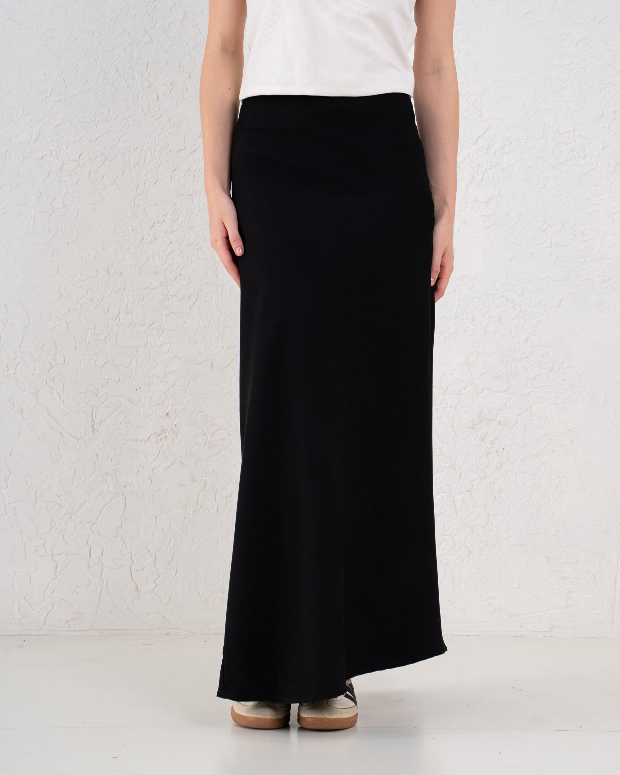 A soft suede-effect maxi skirt with a sleek, minimal silhouette. Flowy, elegant, and perfect for elevated day-to-night styling. Available in black and camel.