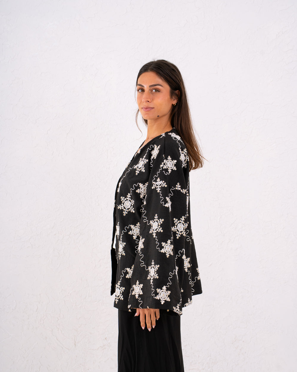 A statement linen burry embroidered wrap kimono designed with delicate sparkling details that add subtle shine and texture to your look.