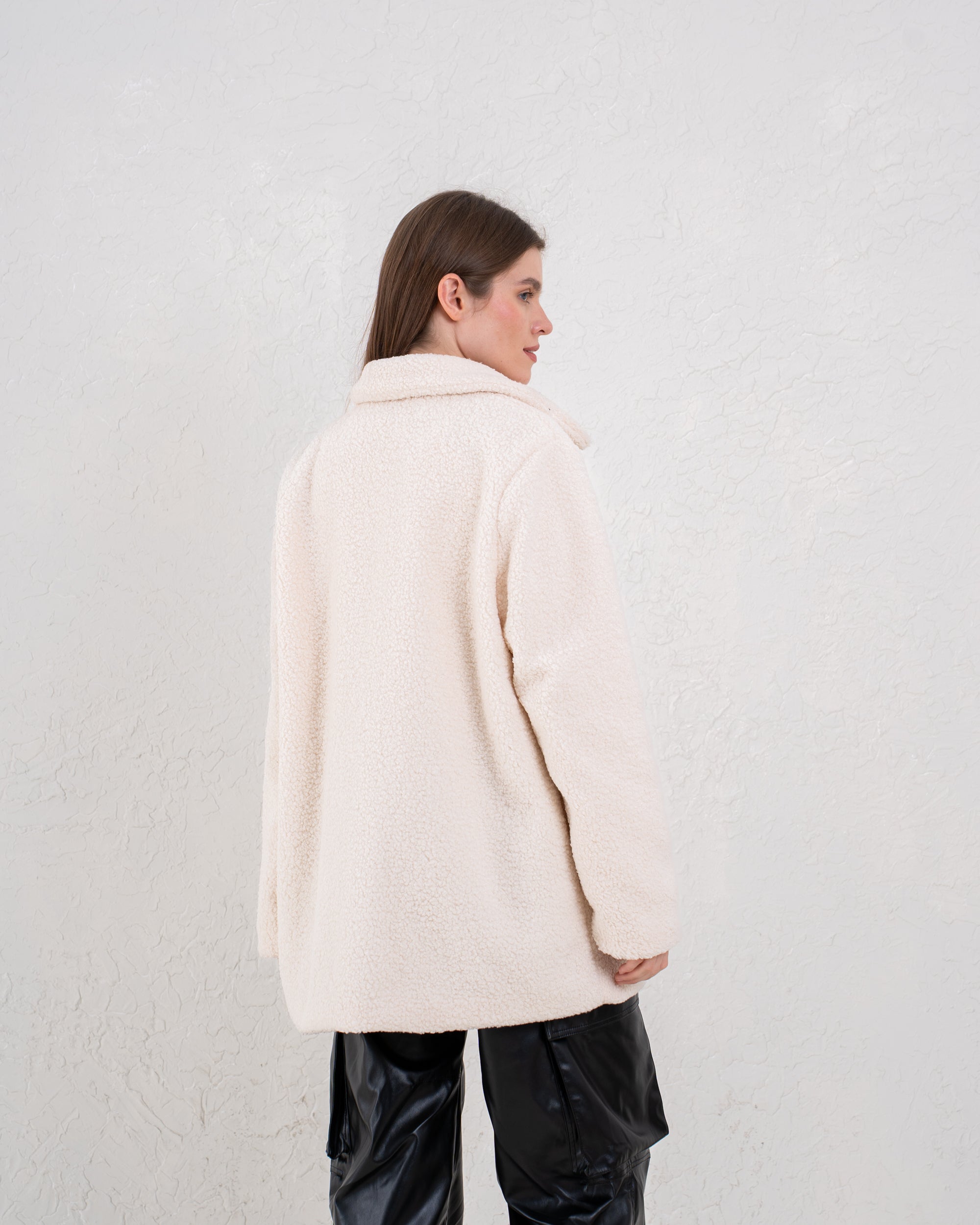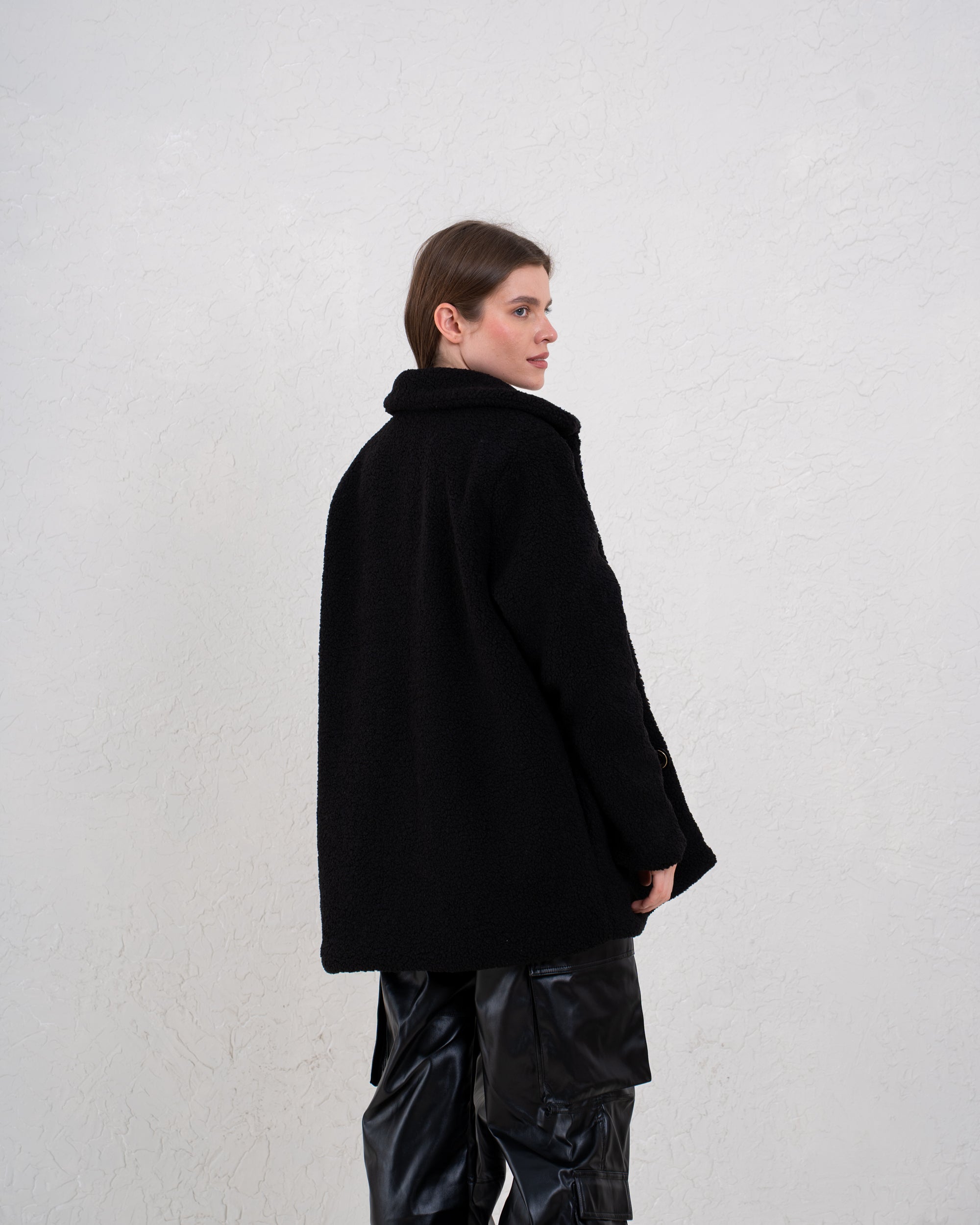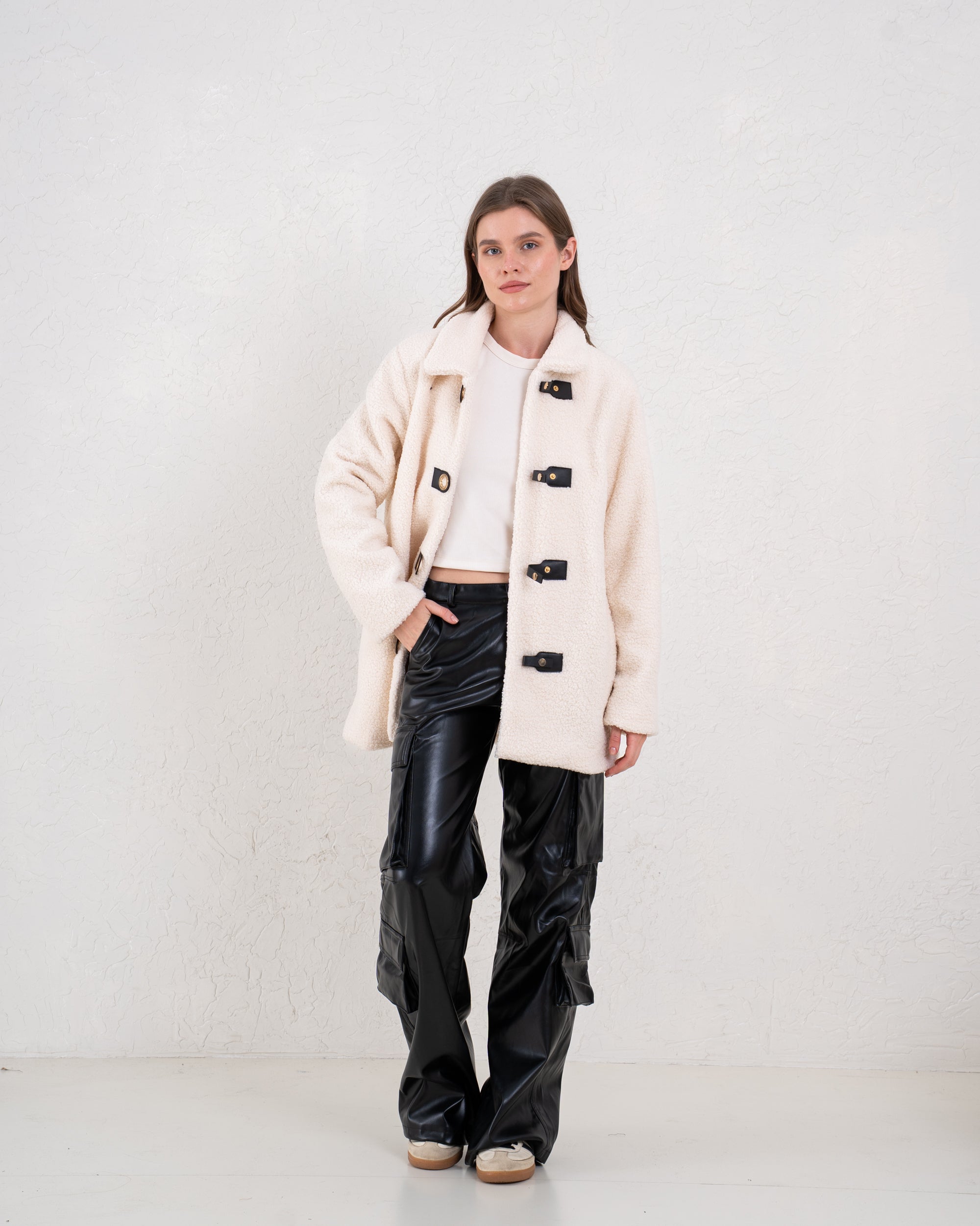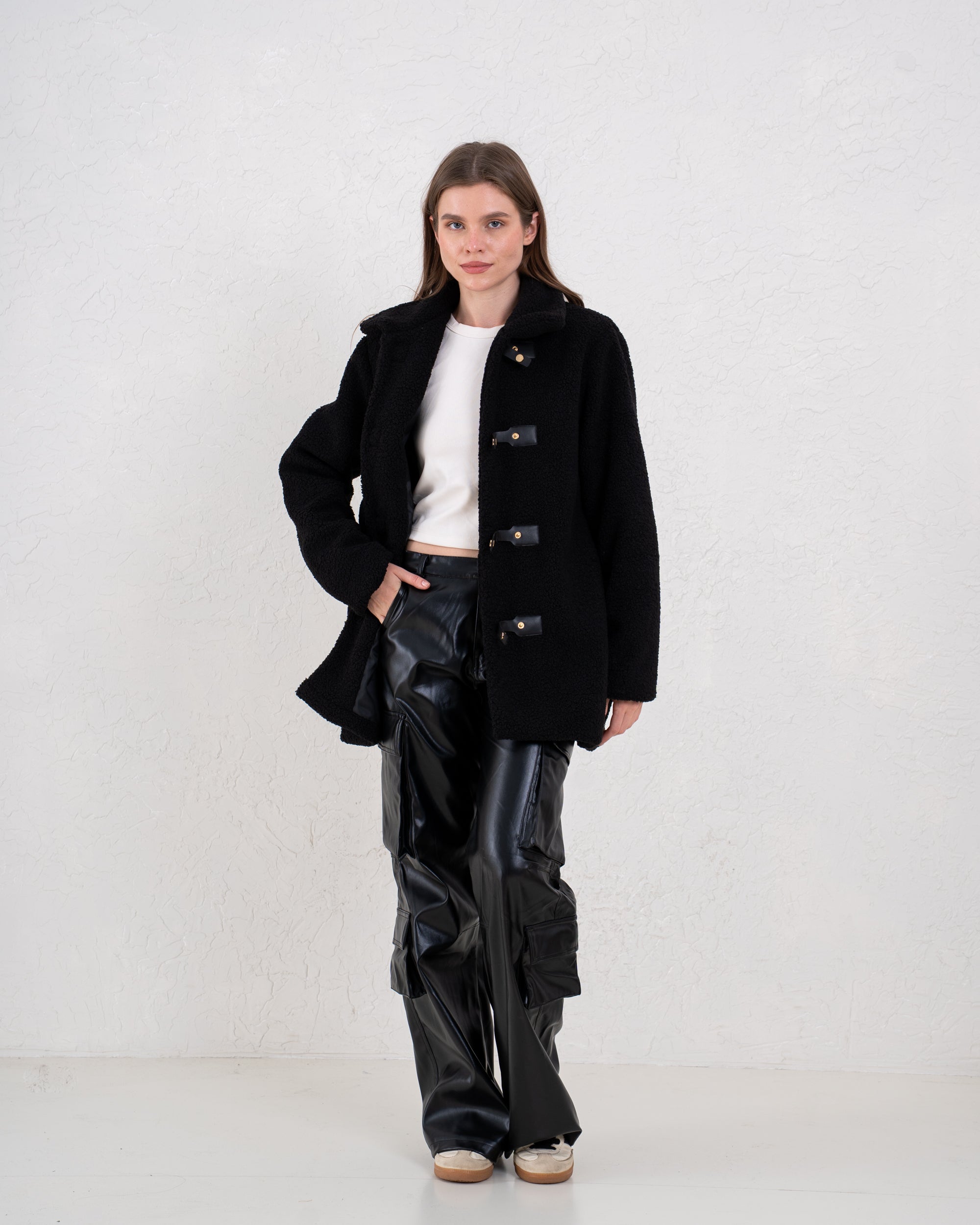 A cozy everyday coat designed with statement contrast leather buckles. Soft, warm, and effortlessly stylish—perfect for winter layering.
