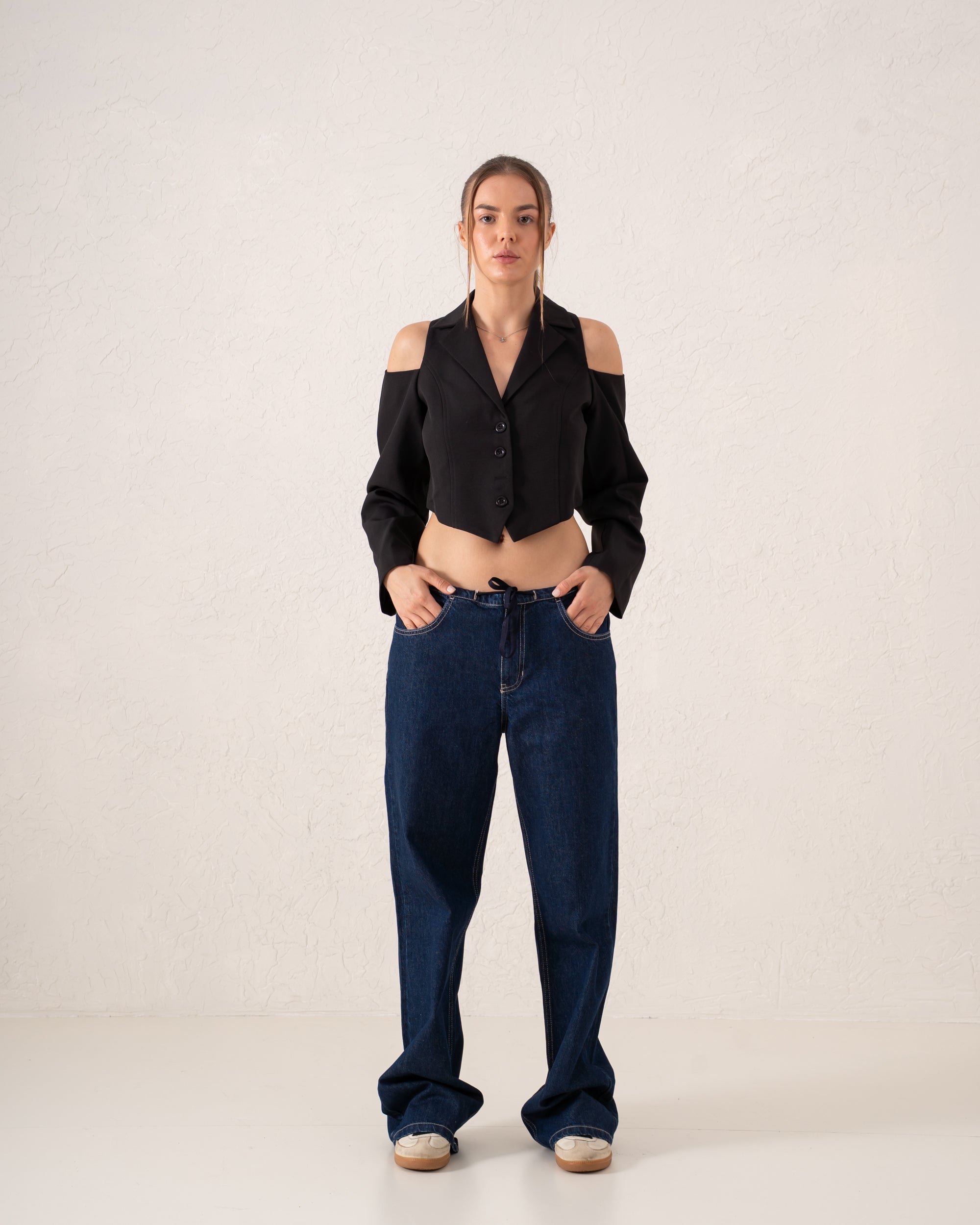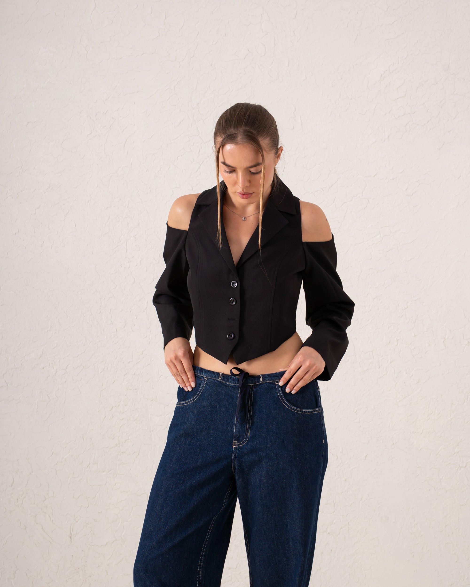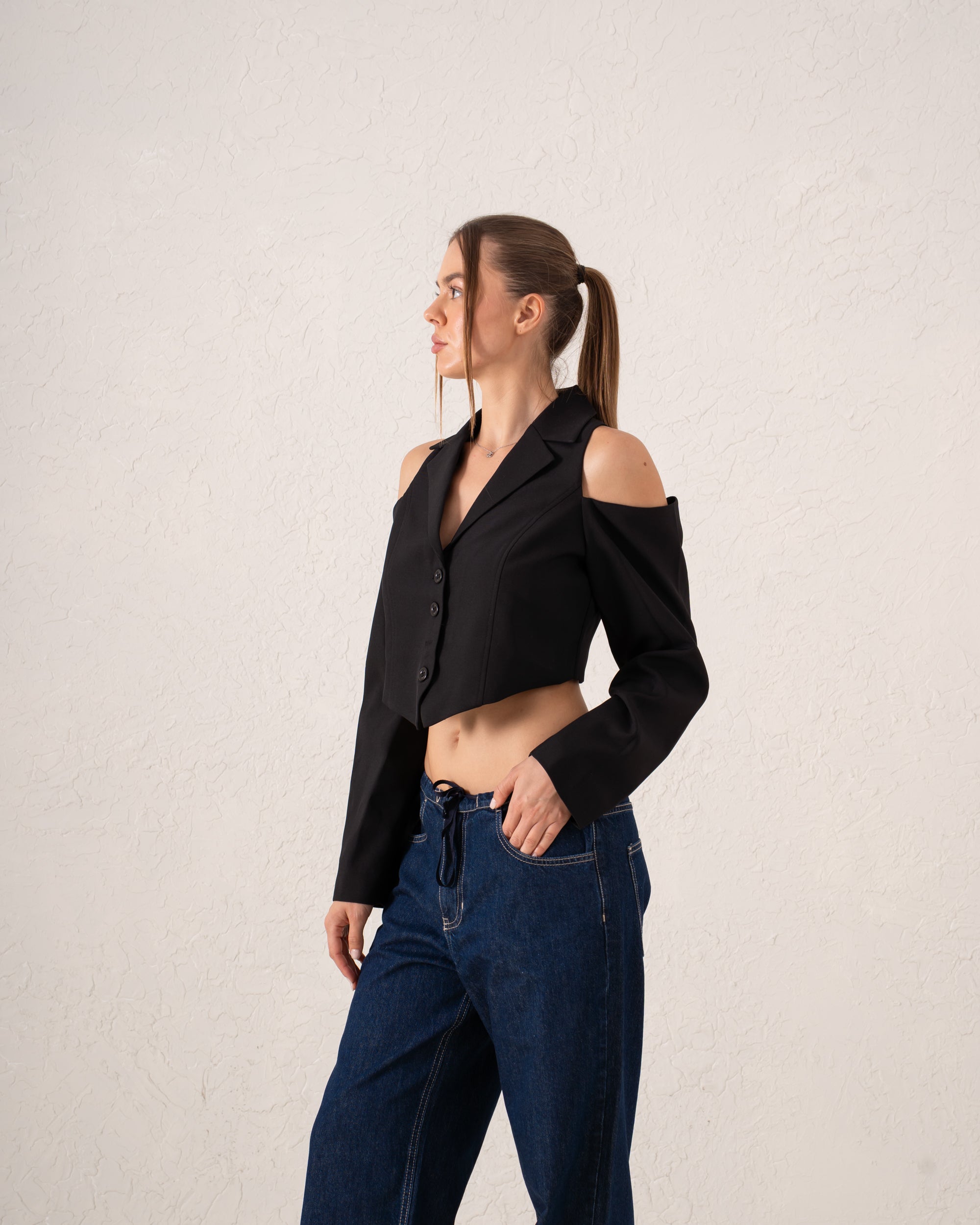- Fit: Fitted cropped body with sharp lapel collar and shoulder cut-outs