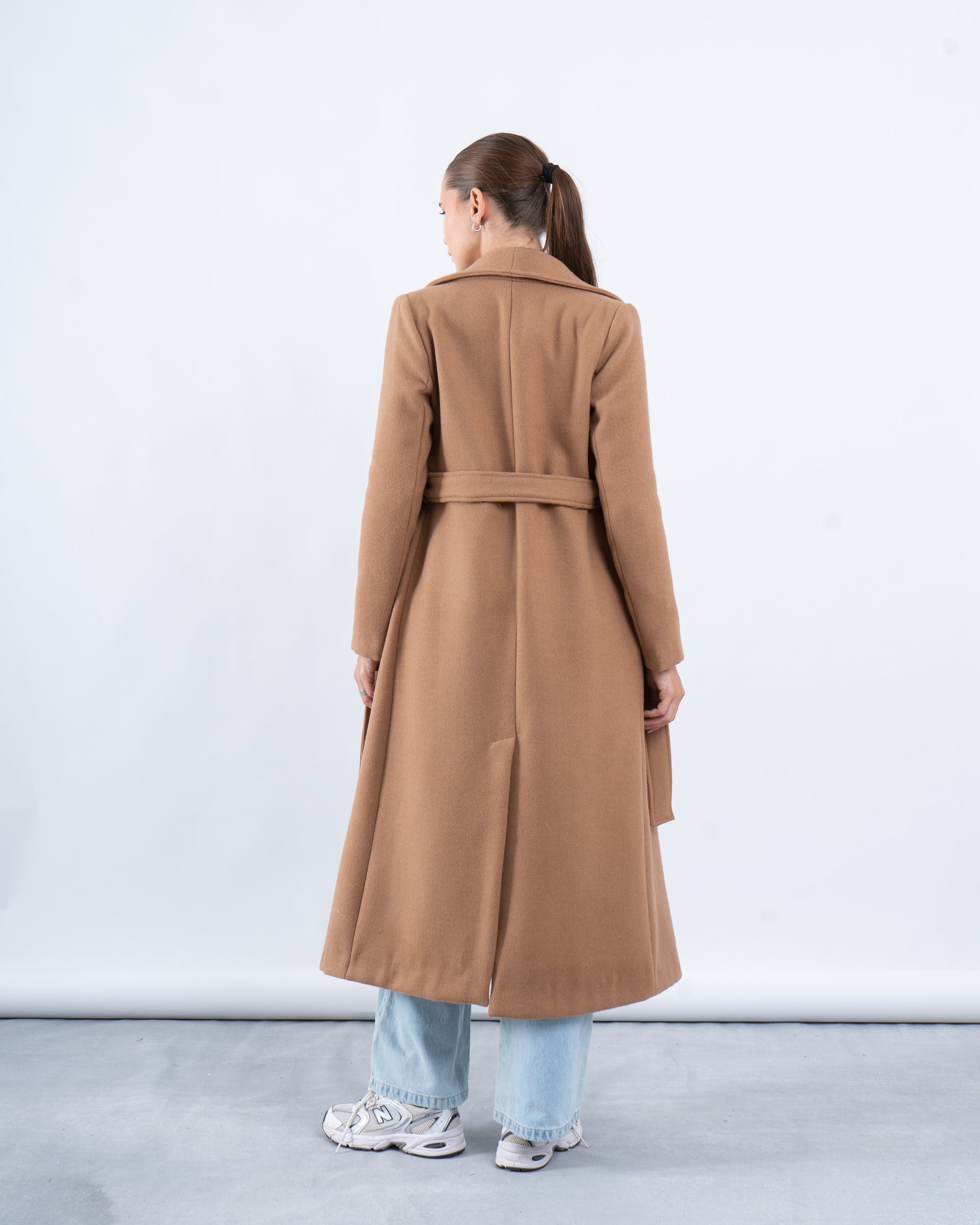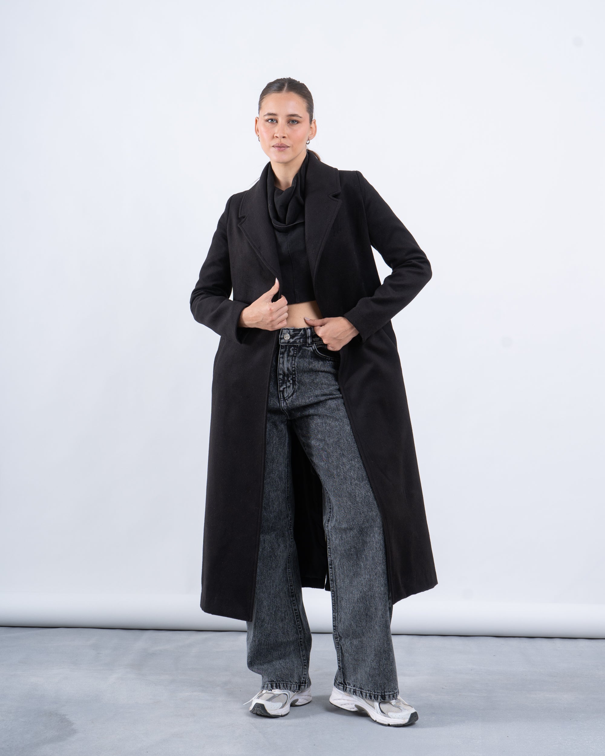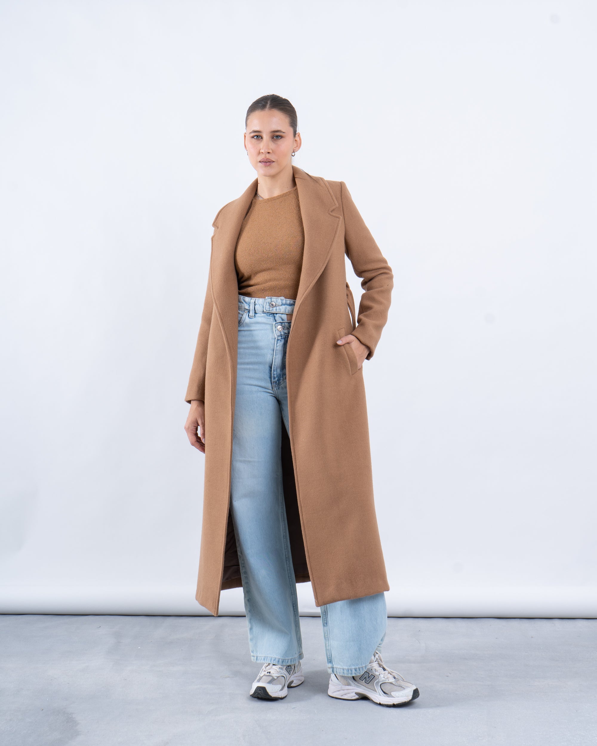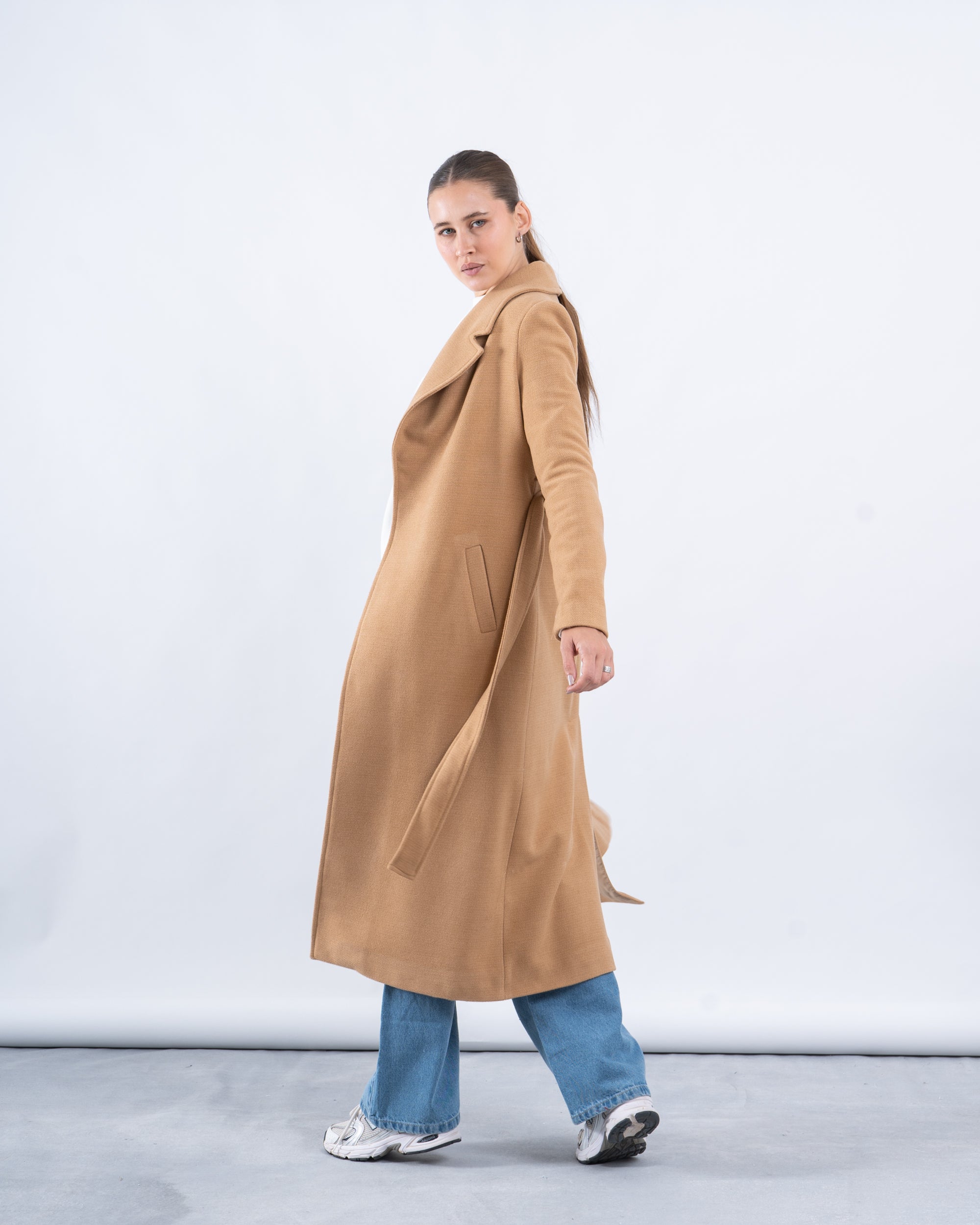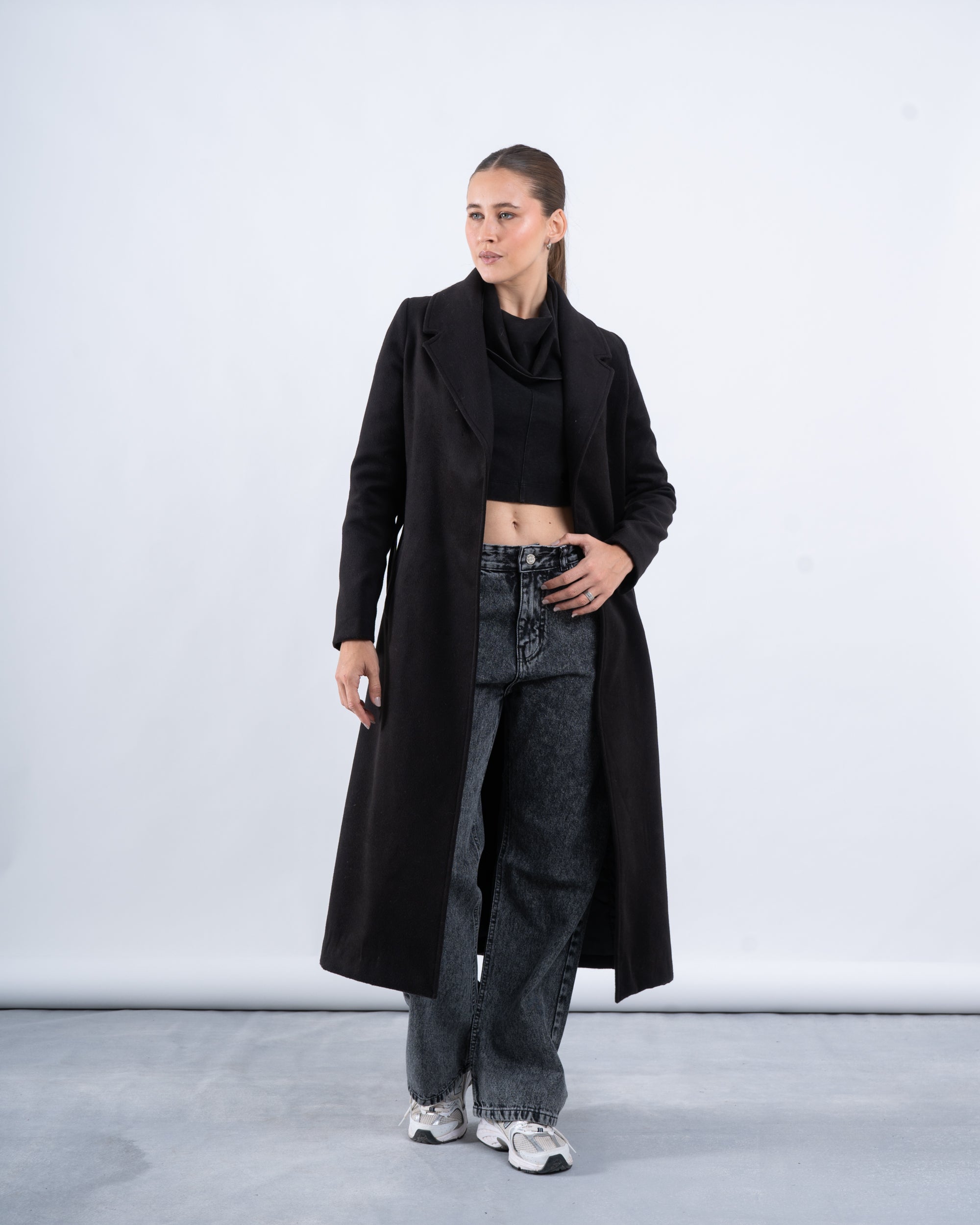 Elevate your outerwear with this timeless long coat, a wardrobe essential for refined style and warmth. Crafted from a soft wool-blend, it features a sleek, tailored silhouette with a belted waist for a flattering fit. The notched lapel and side pockets add a sophisticated touch, making it perfect for layering over casual or dressy outfits alike.